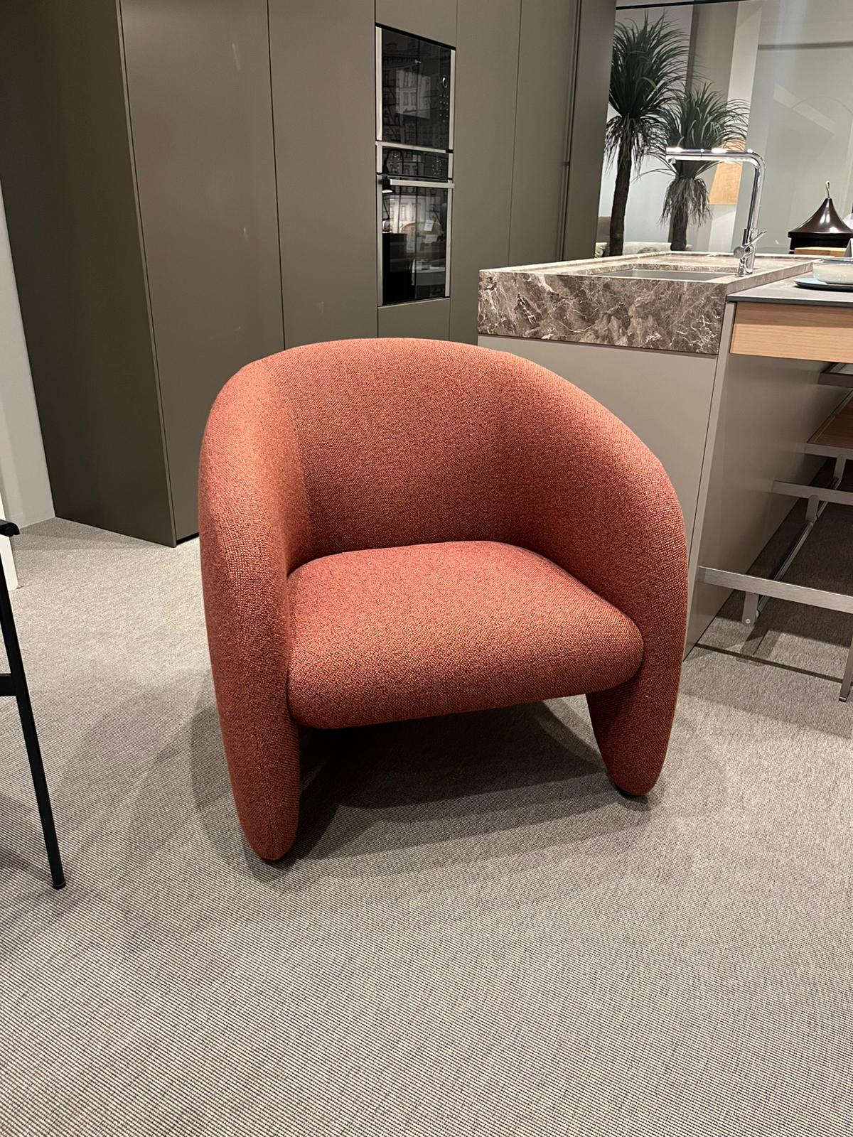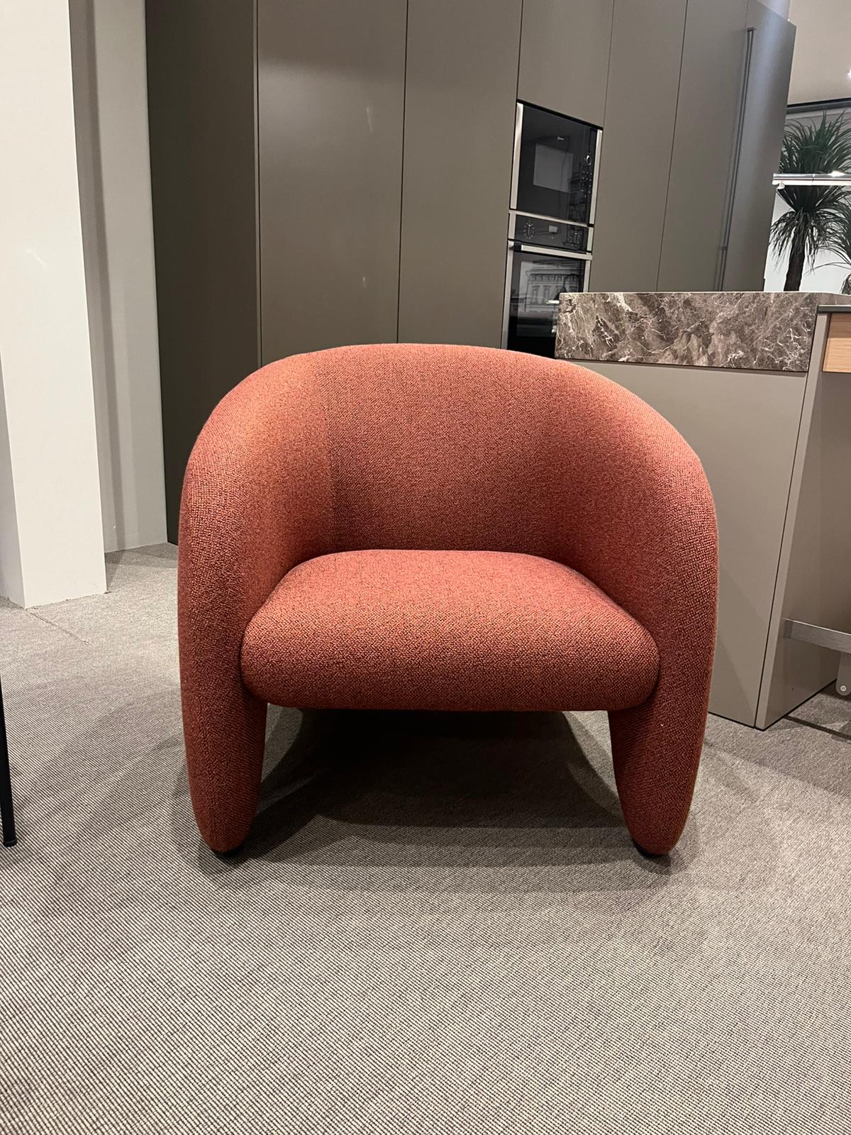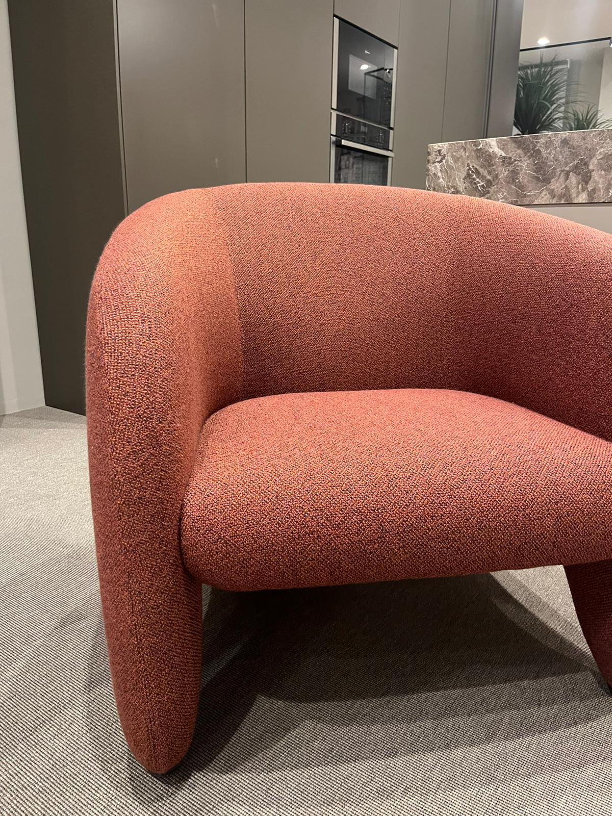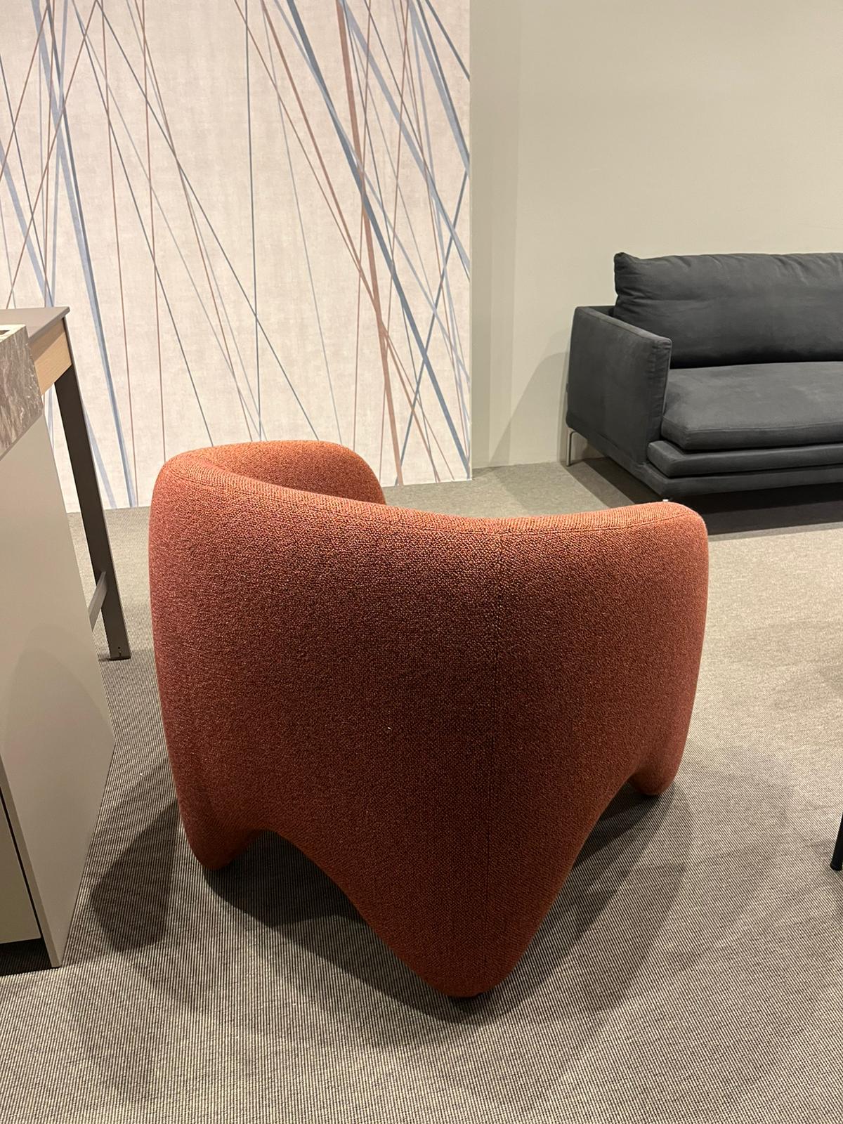 Poltrona Yuzu di Arflex, con struttura metallica, imbottitura in poliuretano schiumato in stampo e fibra di poliestere e rivestimento in tessuto Nolan color Mattone. La poltrona ha le dimensioni di cm 84 x 84 x H.78.