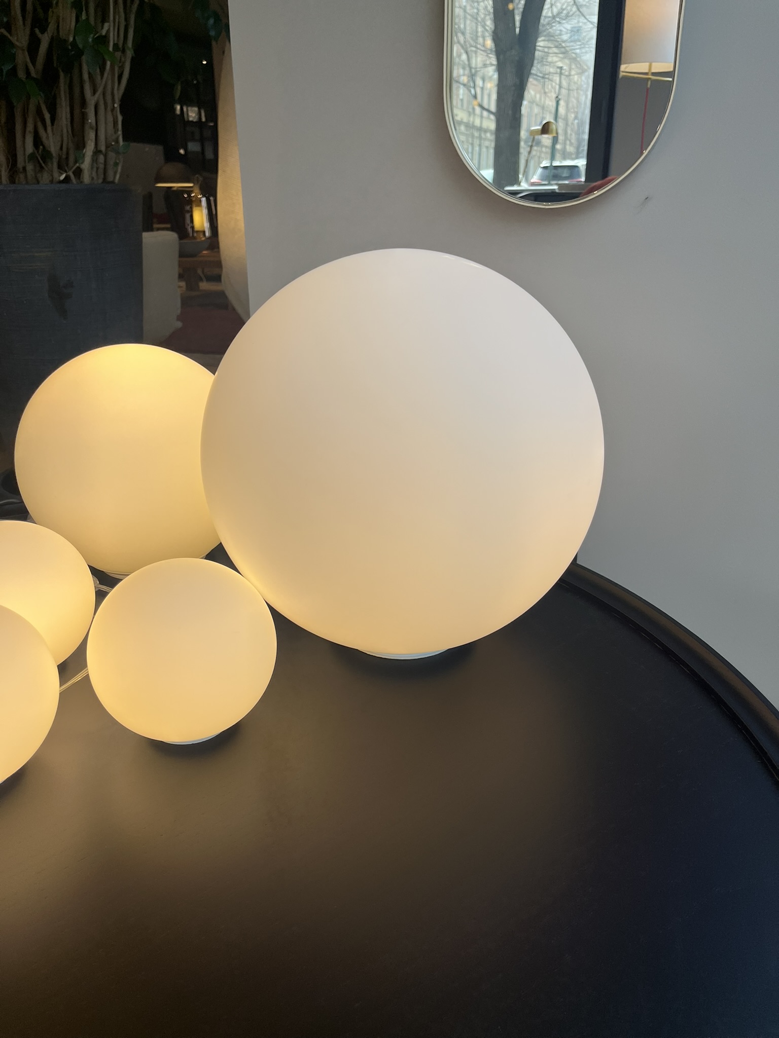 La geometria elementare del diffusore sferico ne fa un prodotto iconico ed aiuta la diffusione uniforme della luce attraverso il vetro soffiato acidato. La lampada ha un diametro di cm 35.