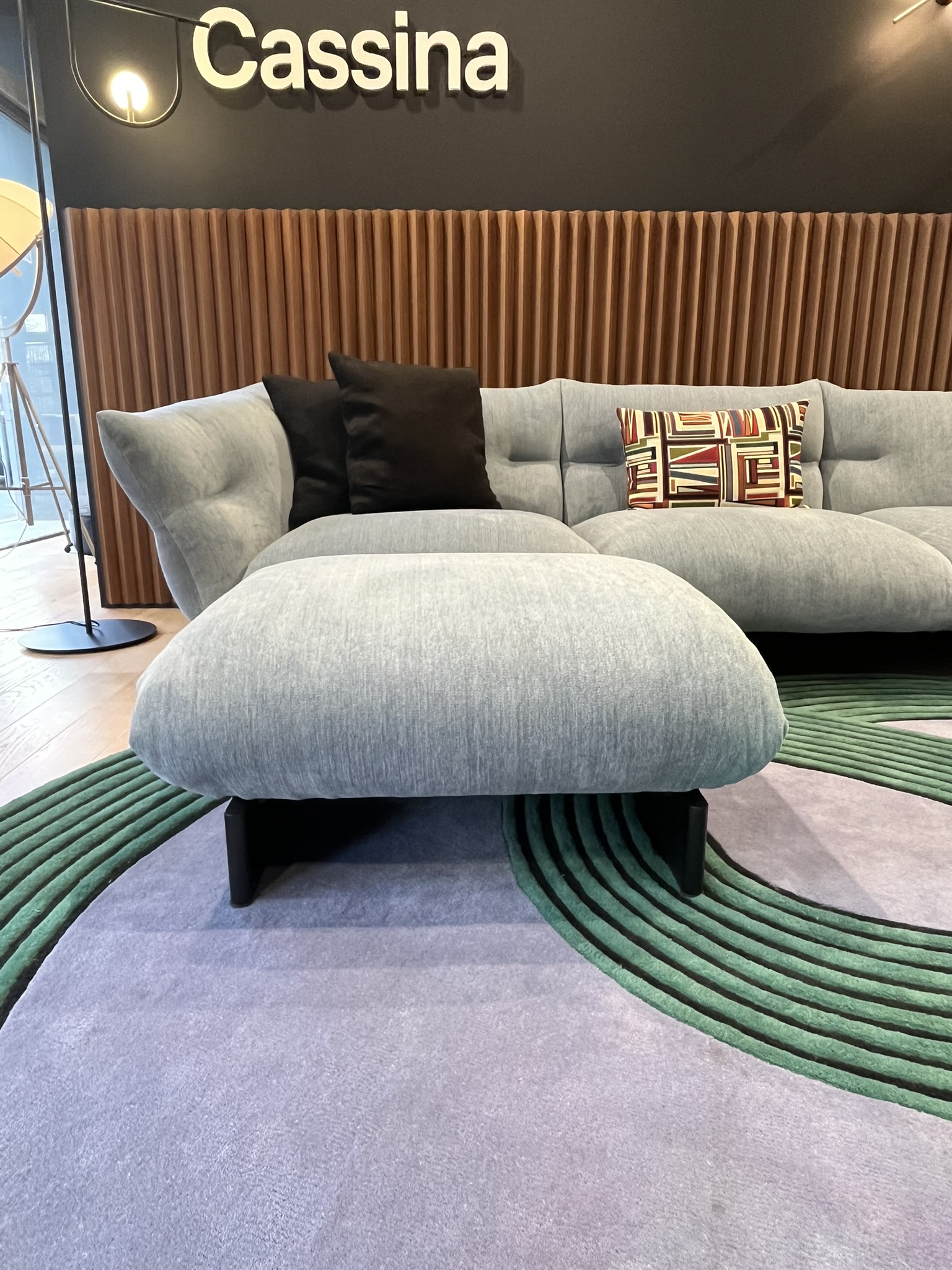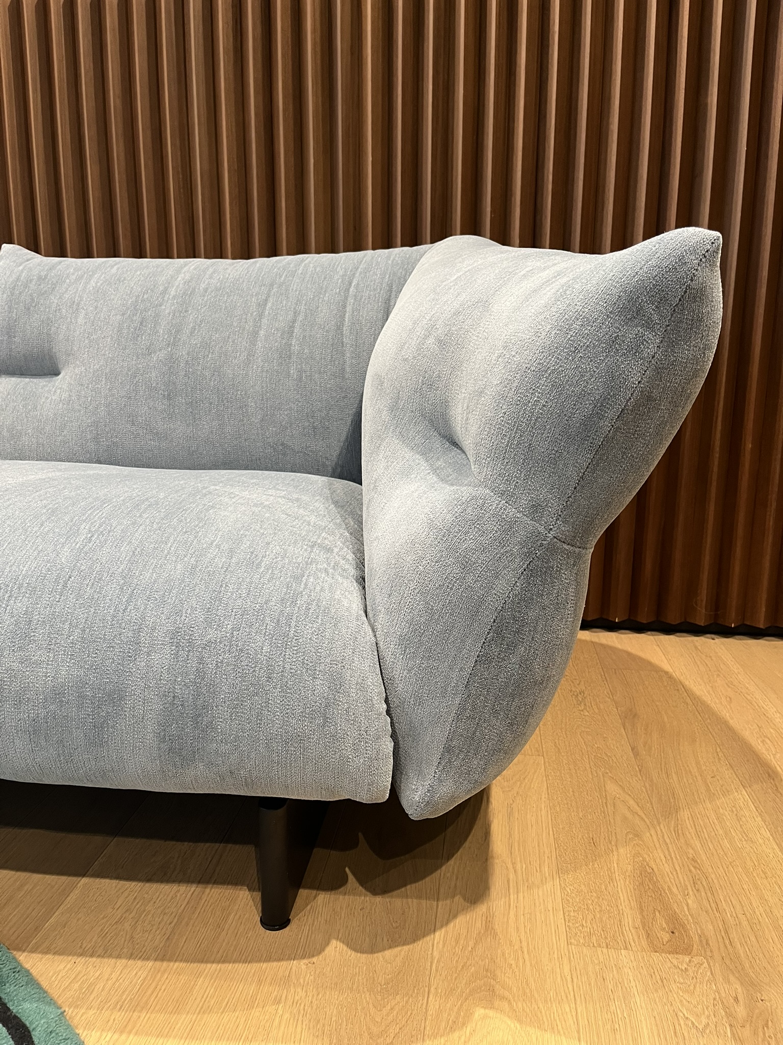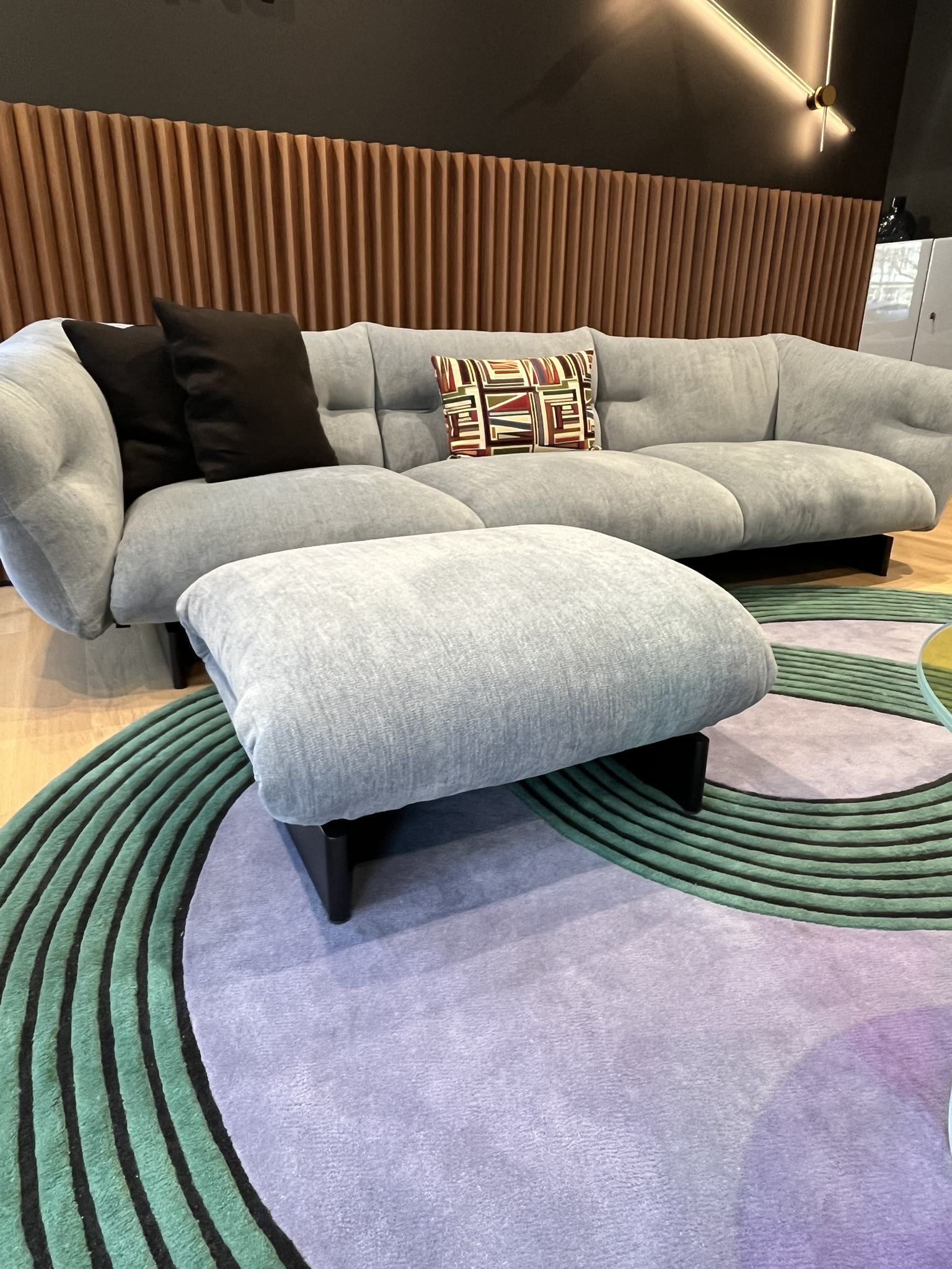 Divano 3 posti e pouf Moncloud, design di Patricia Urquiola, con imbottitura in PET riciclato con inserto a densità differenzia in CIRCULARREFOAM® e rivestimento in Tessuto Fox col. Cielo. Il divano ha le dimensioni di cm 315x102xH82 e il pouf di cm 80x65xH42.