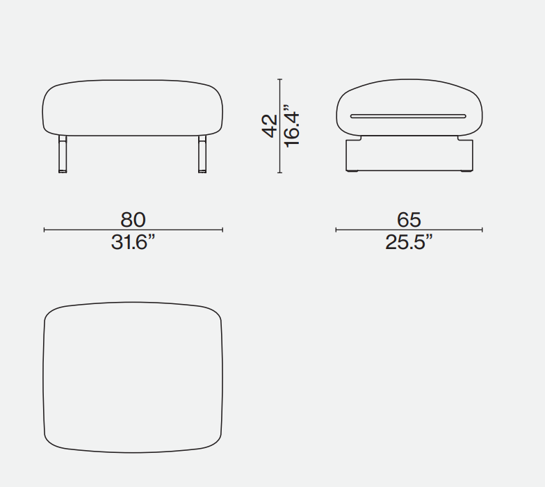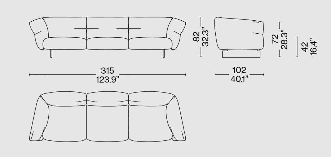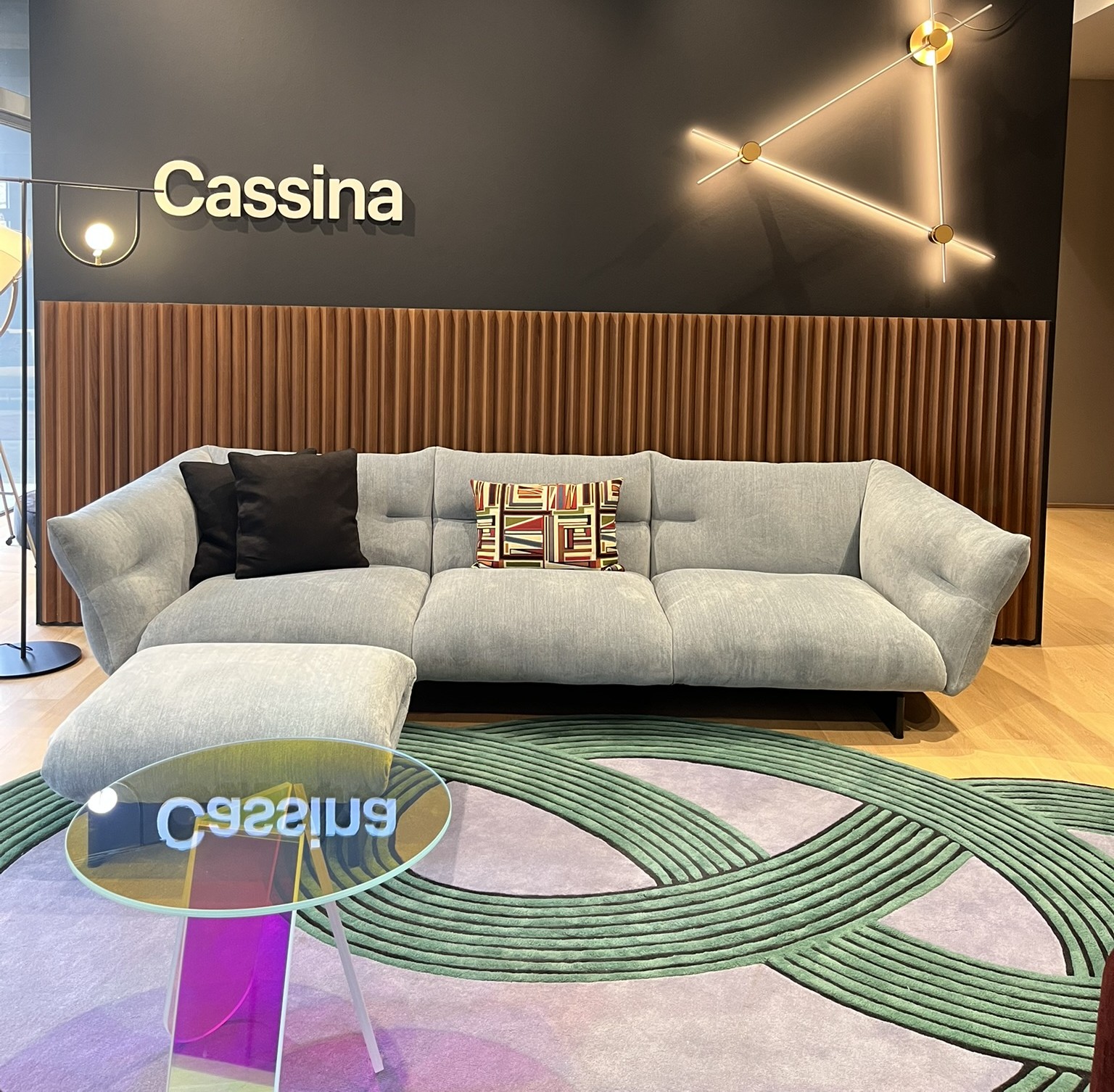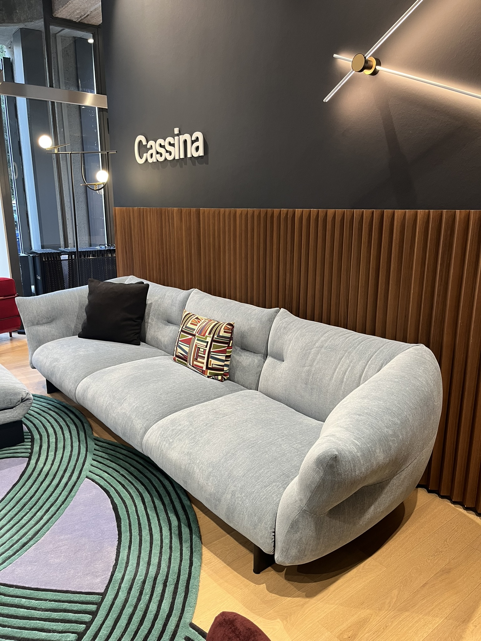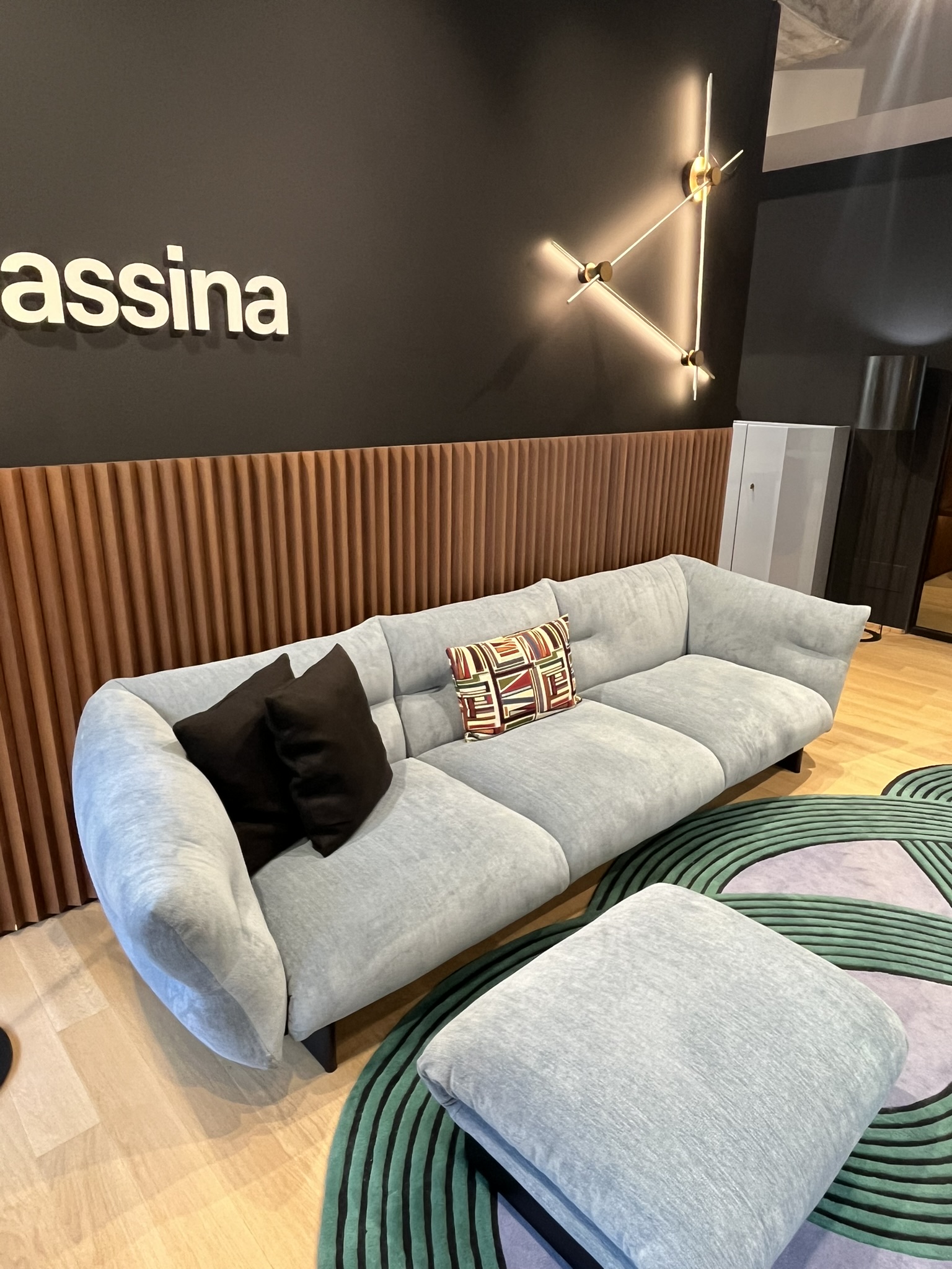 Divano 3 posti e pouf Moncloud, design di Patricia Urquiola, con imbottitura in PET riciclato con inserto a densità differenzia in CIRCULARREFOAM® e rivestimento in Tessuto Fox col. Cielo. Il divano ha le dimensioni di cm 315x102xH82 e il pouf di cm 80x65xH42.