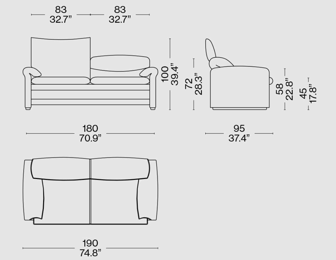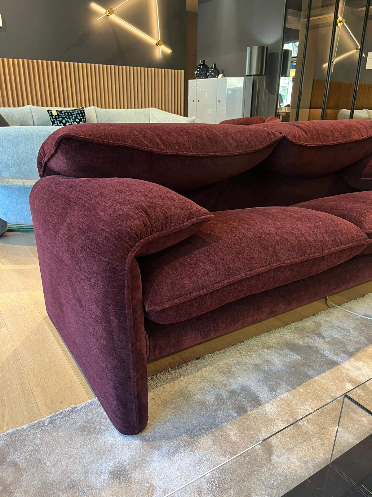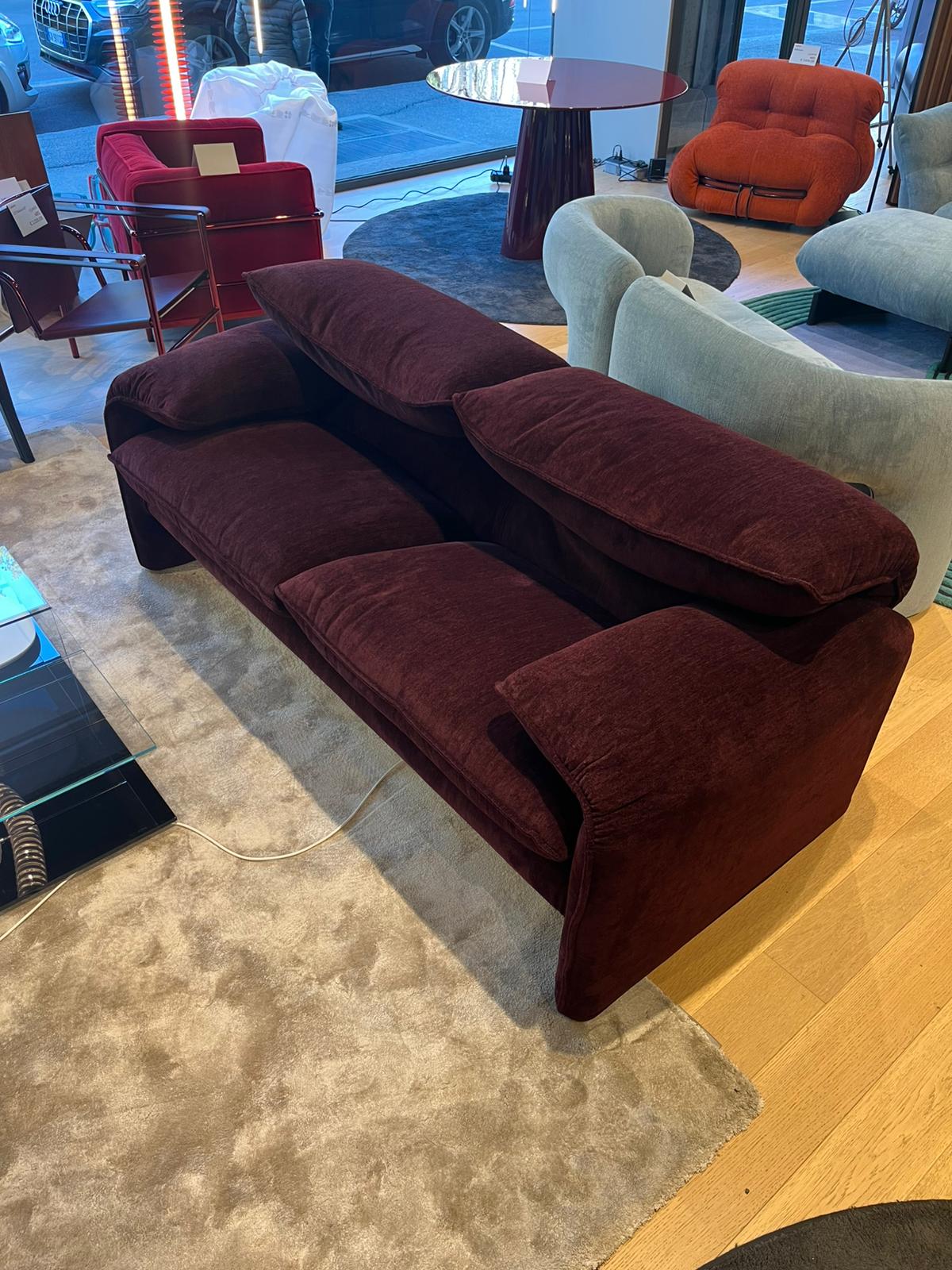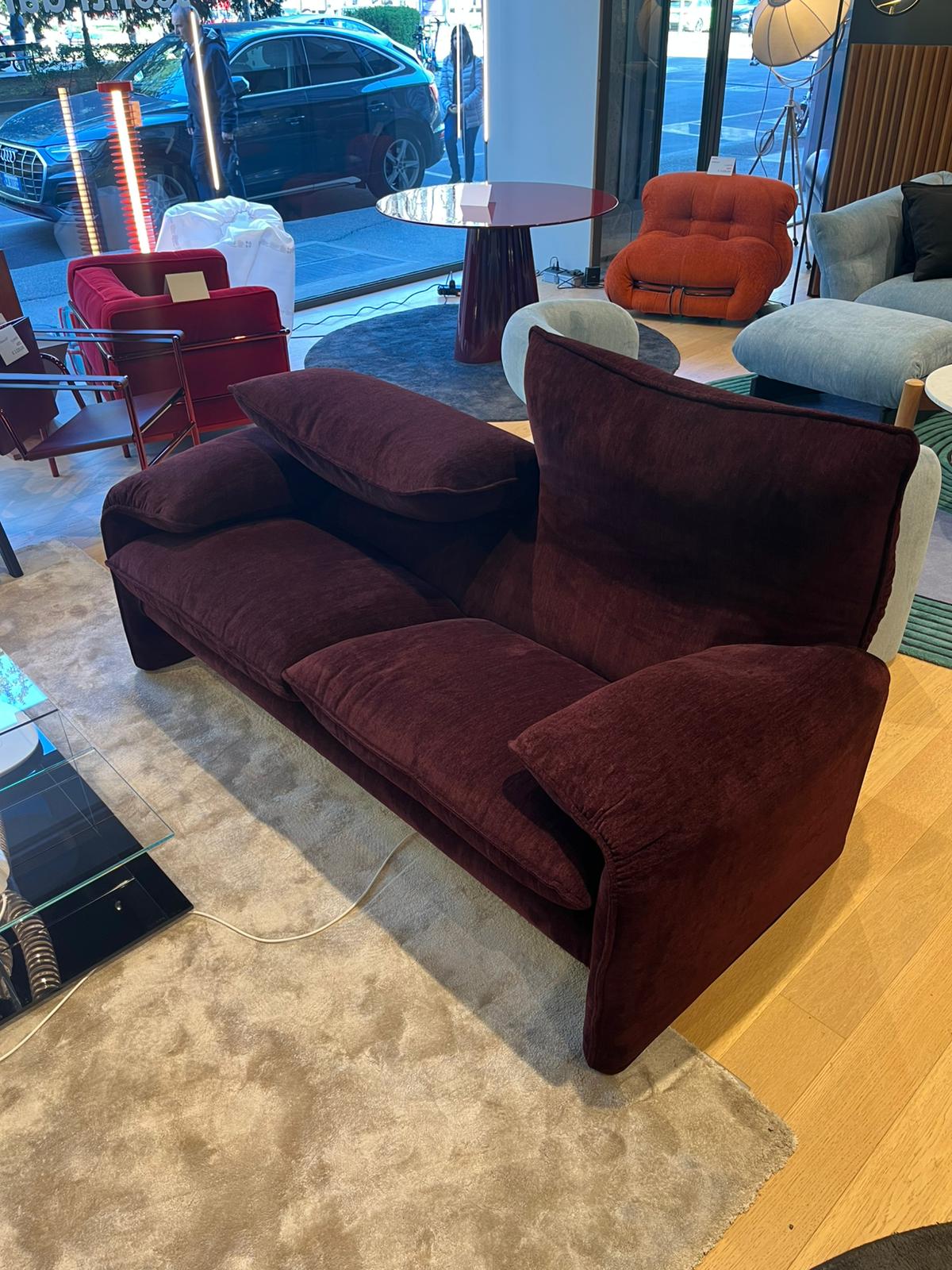 Divano 2 posti sfoderabile Maralunga 40S di Cassina, rivestimento in tessuto Fox col. Vinaccia. La struttura a telaio in tubolare di acciaio con cinghie elastiche è imbottita in poliuretano espanso privo di CFC a densità differenziata. L’imbottitura dei cuscini della seduta è in poliuretano espanso e ovatta di poliestere. Ogni schienale è dotato di poggiatesta ribaltabile con meccanismo brevettato, indipendente per ogni posto. Le dimensioni del divano sono di cm 190×95.