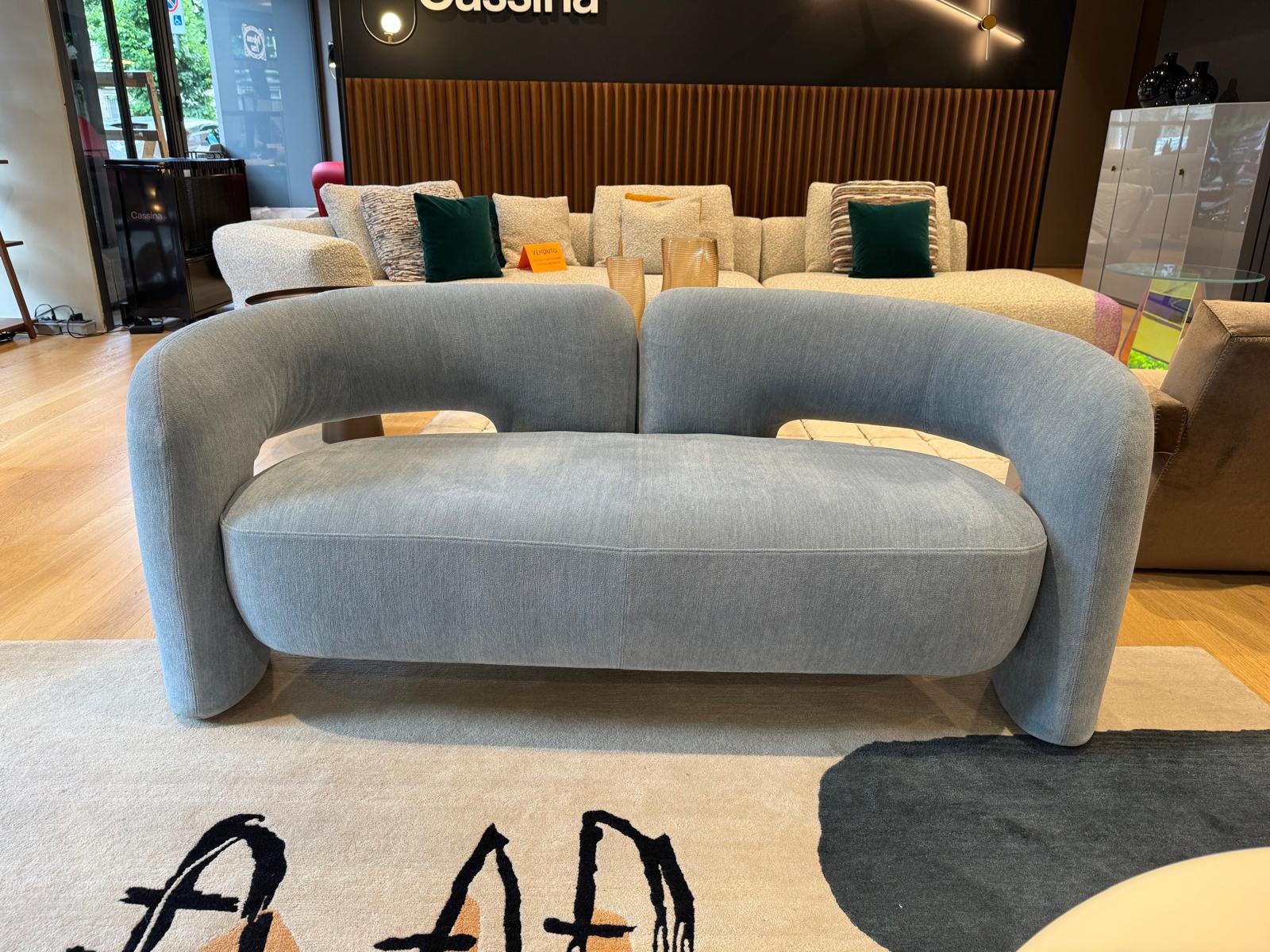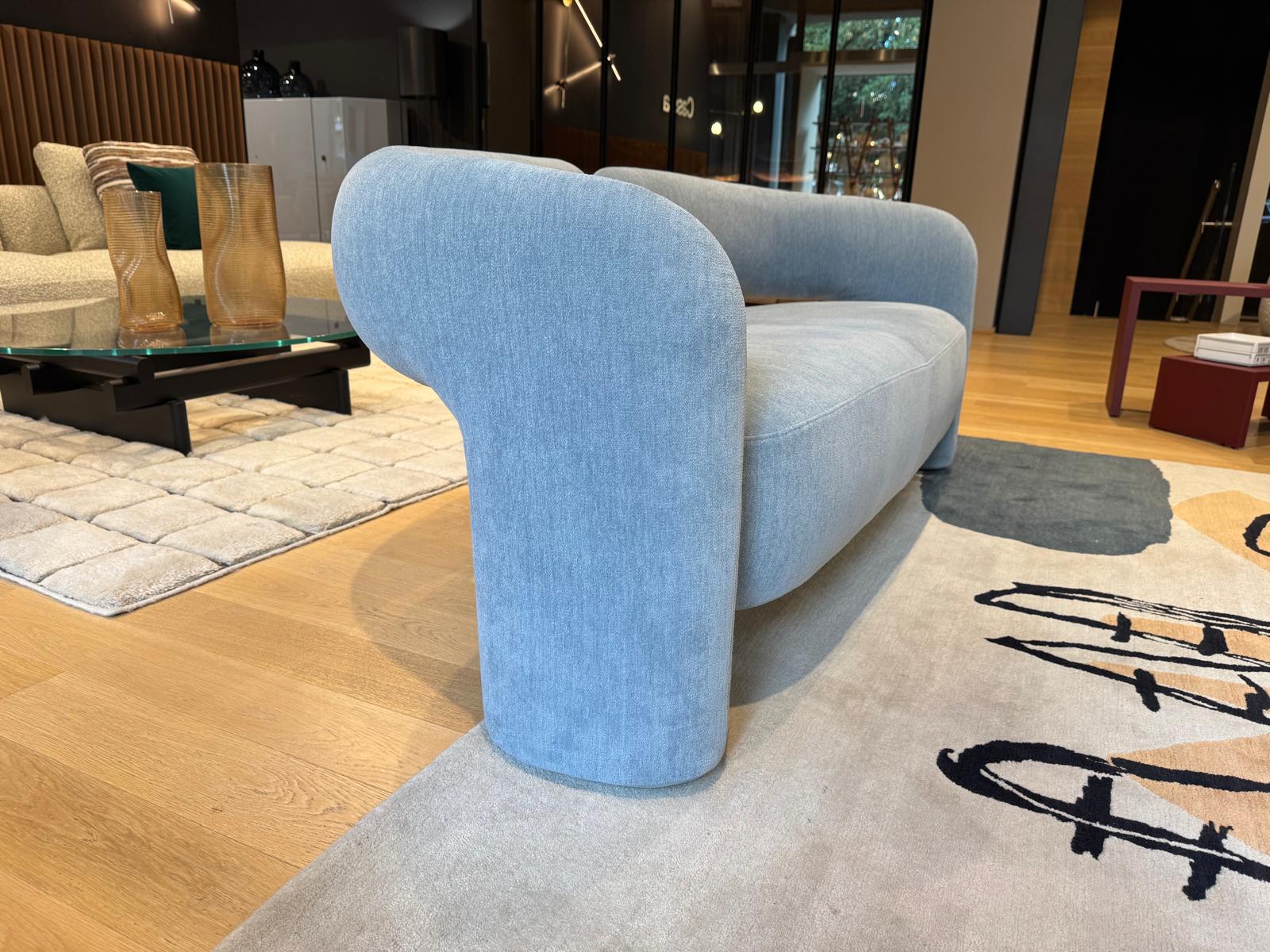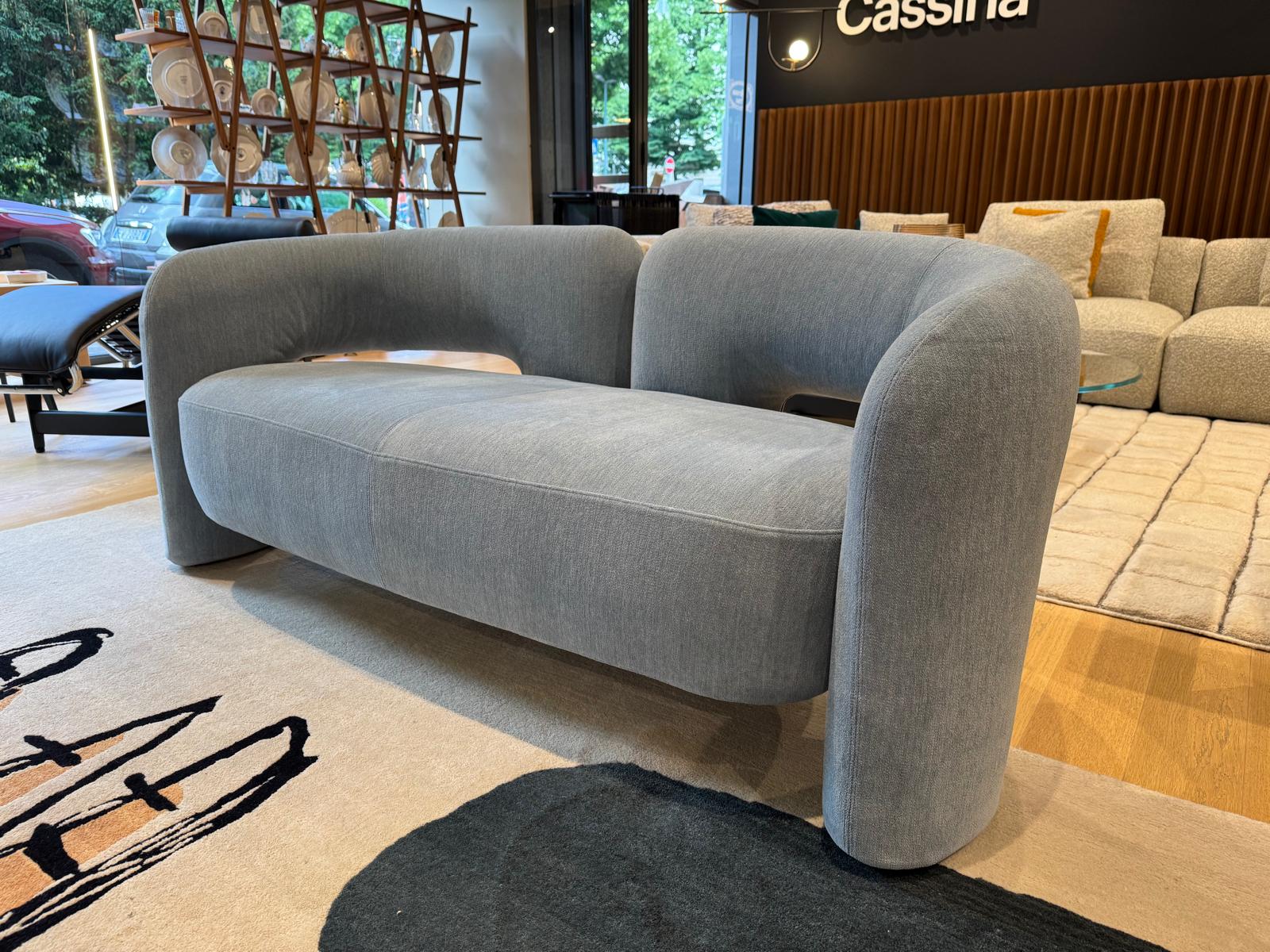 Divano Dudet Sofa, di Cassina, in Tessuto Fox (Cat F) color Cielo e zip nera. Il divano mantiene il caratteristico design della sedia della stessa collezione disegnata da Patricia Urquiola .