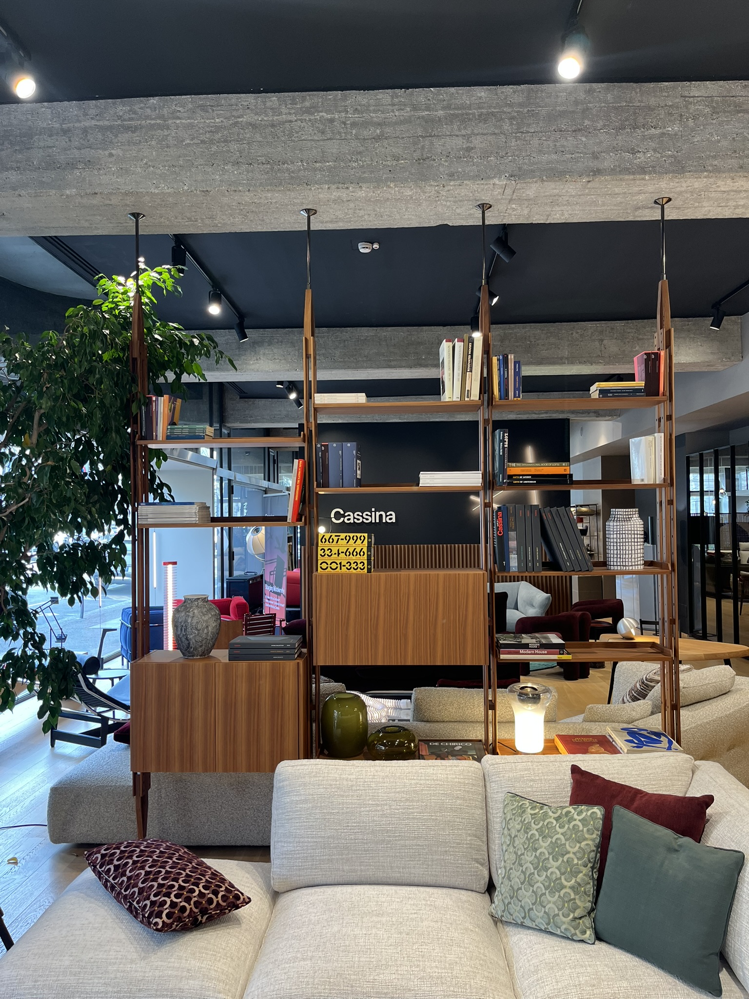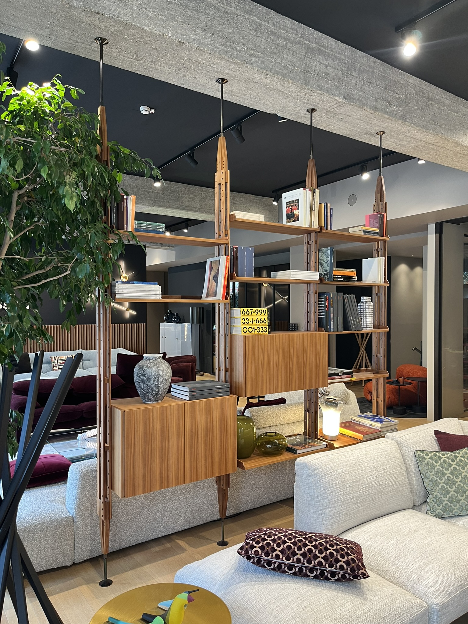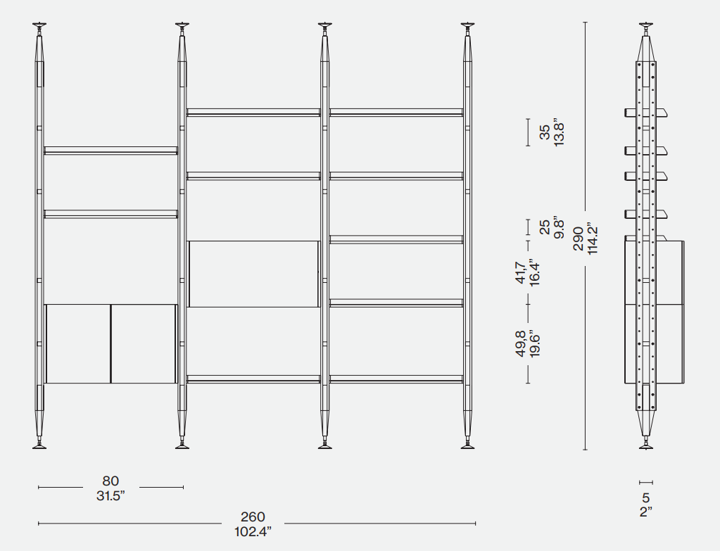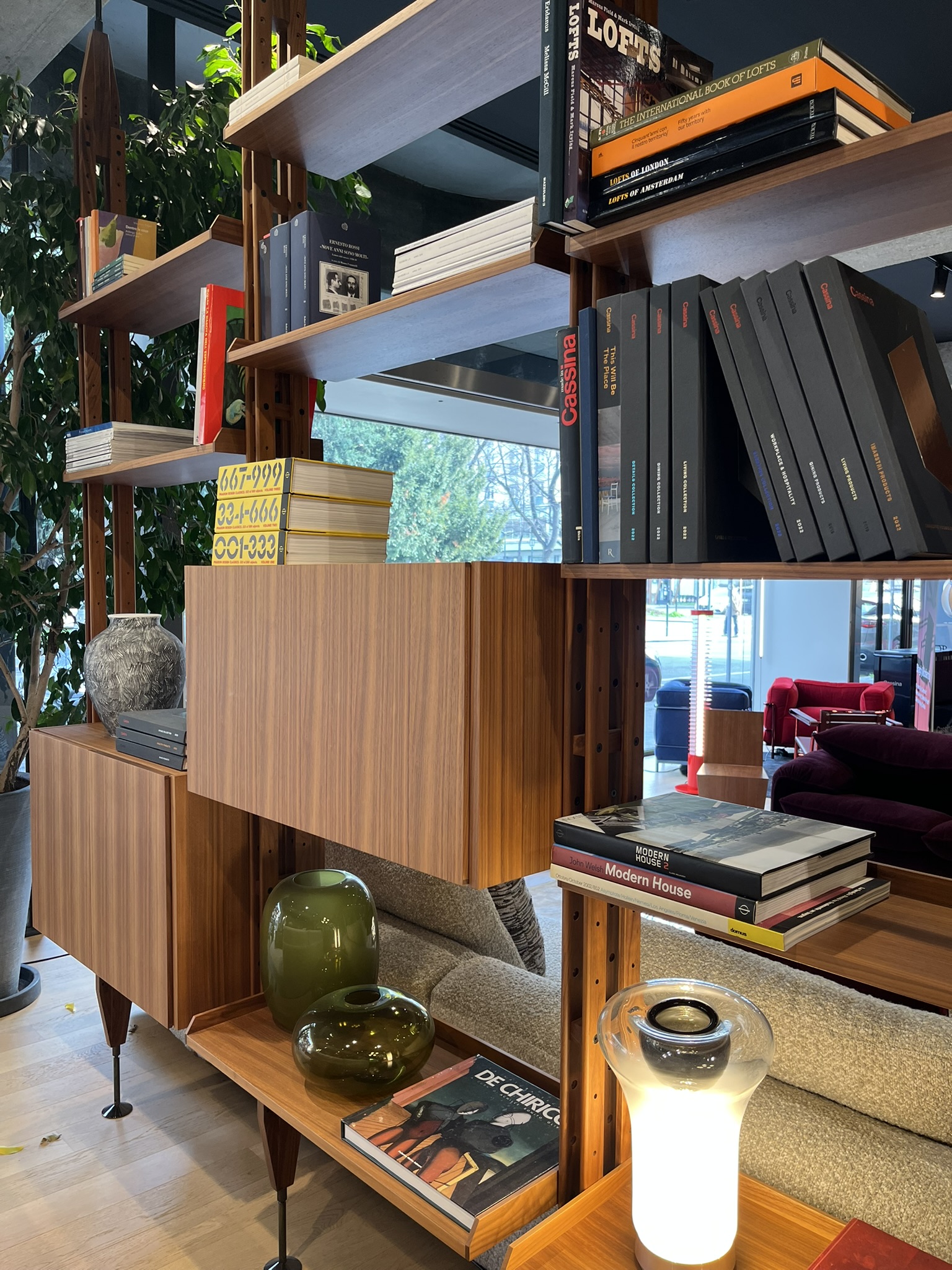 Disegnata tra il 1956 e 1957 da Franco Albini e Franca Helg, Infinito è una libreria bifacciale posizionabile a parete dalla forma elegante e flessibile, apparentemente semplice ma estremamente complessa. I montanti regolabili in altezza sono in legno massello di noce canaletto, così come le mensole, il contenitore a ribalta e il contenitore a due ante. La libreria è larga cm 260 e alta standard da cm 268 a cm 290. Incluso un kit di 8 perni speciali per raggiungere un’altezza cm 335.