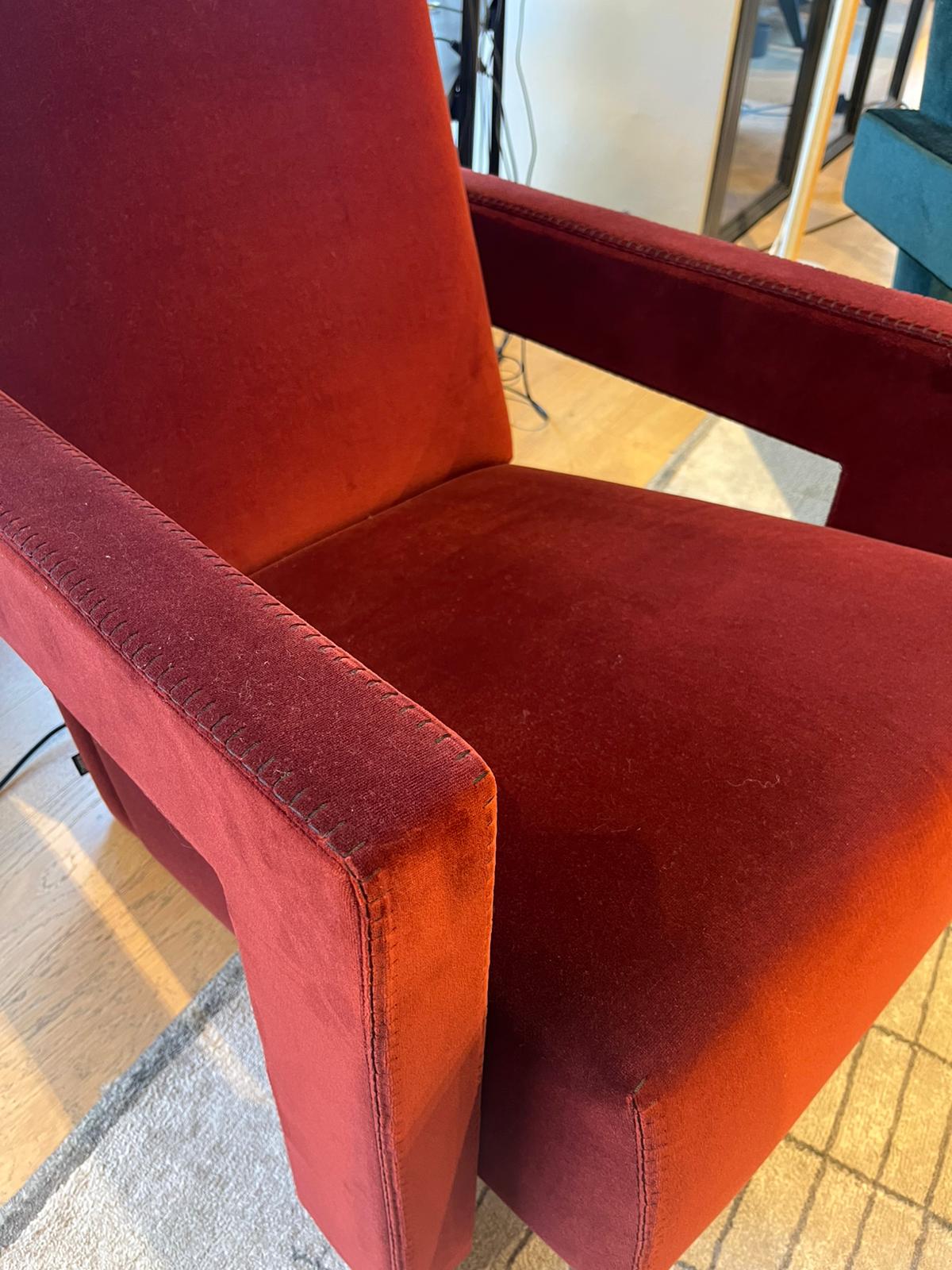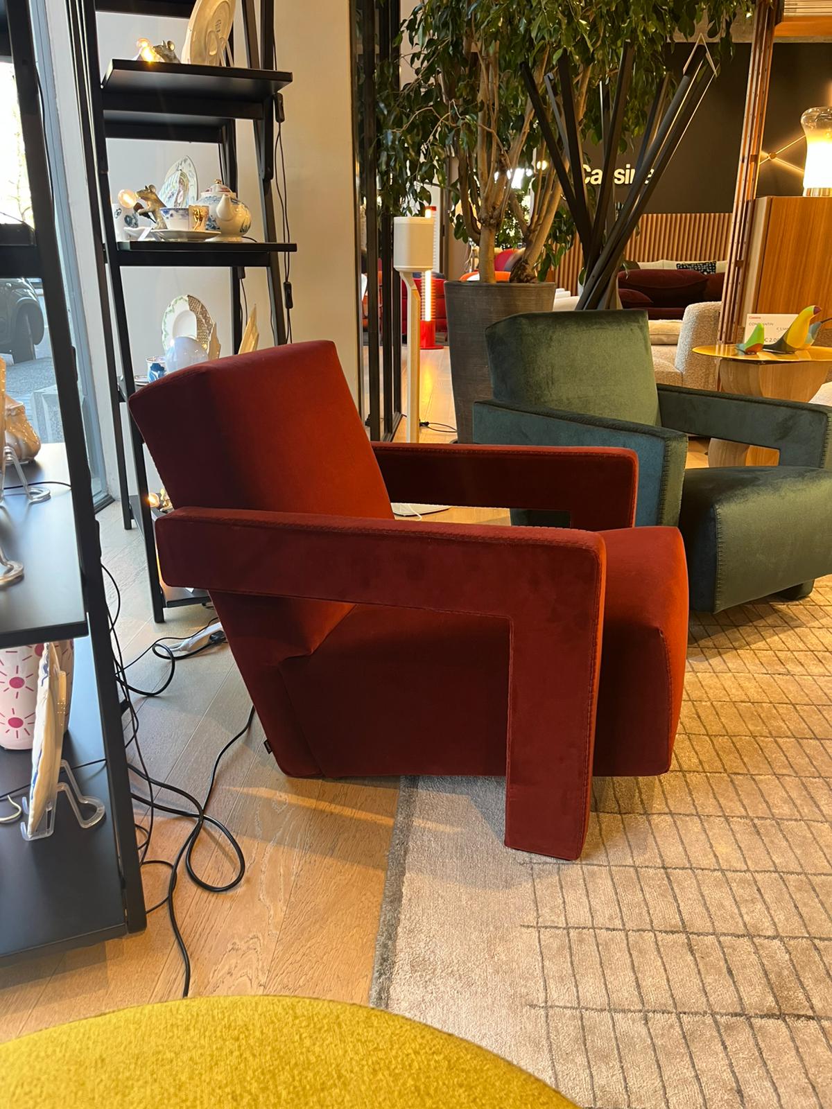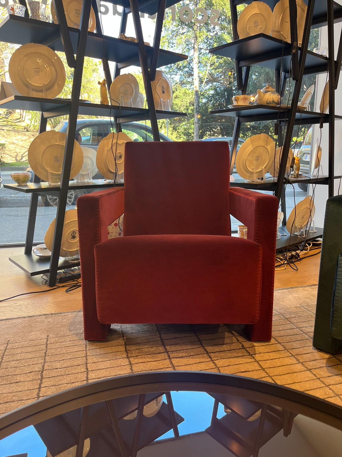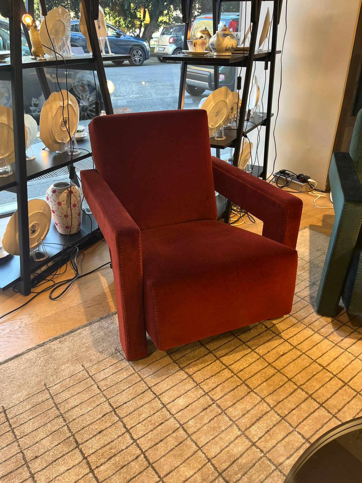 Iconica poltrona Utrecht di Cassina, progettata da Gerrit Thomas Rietveld nel 1935, con imbottitura in poliuretano espanso e ovatta in poliestere. Il telaio portante del sedile e dello schienale è in tubolare di acciaio dotato di cinghie elastiche. Il rivestimento della versione proposta è in tessuto Ortigia col. Cayenne, con cucitura punta di cavallo filo nero. Le dimensioni della poltrona sono di cm 64x85xH70.