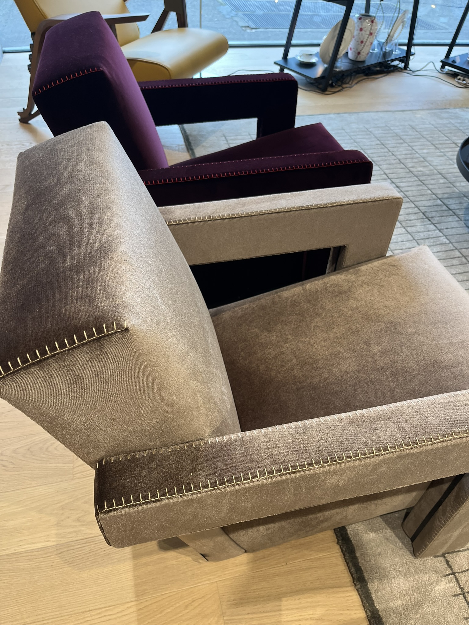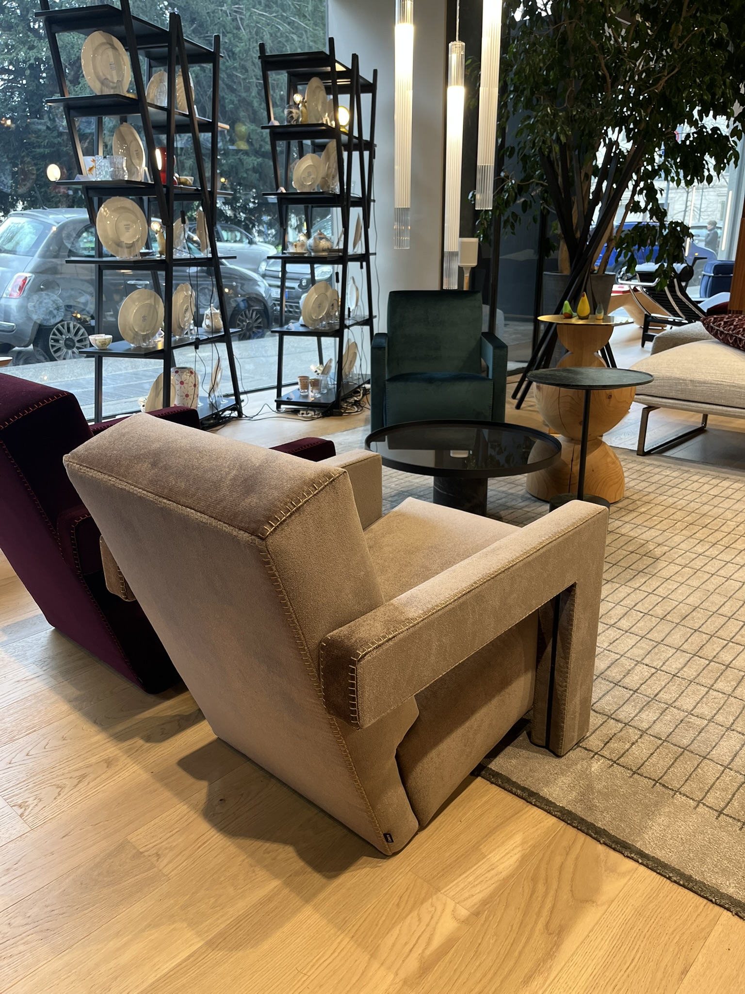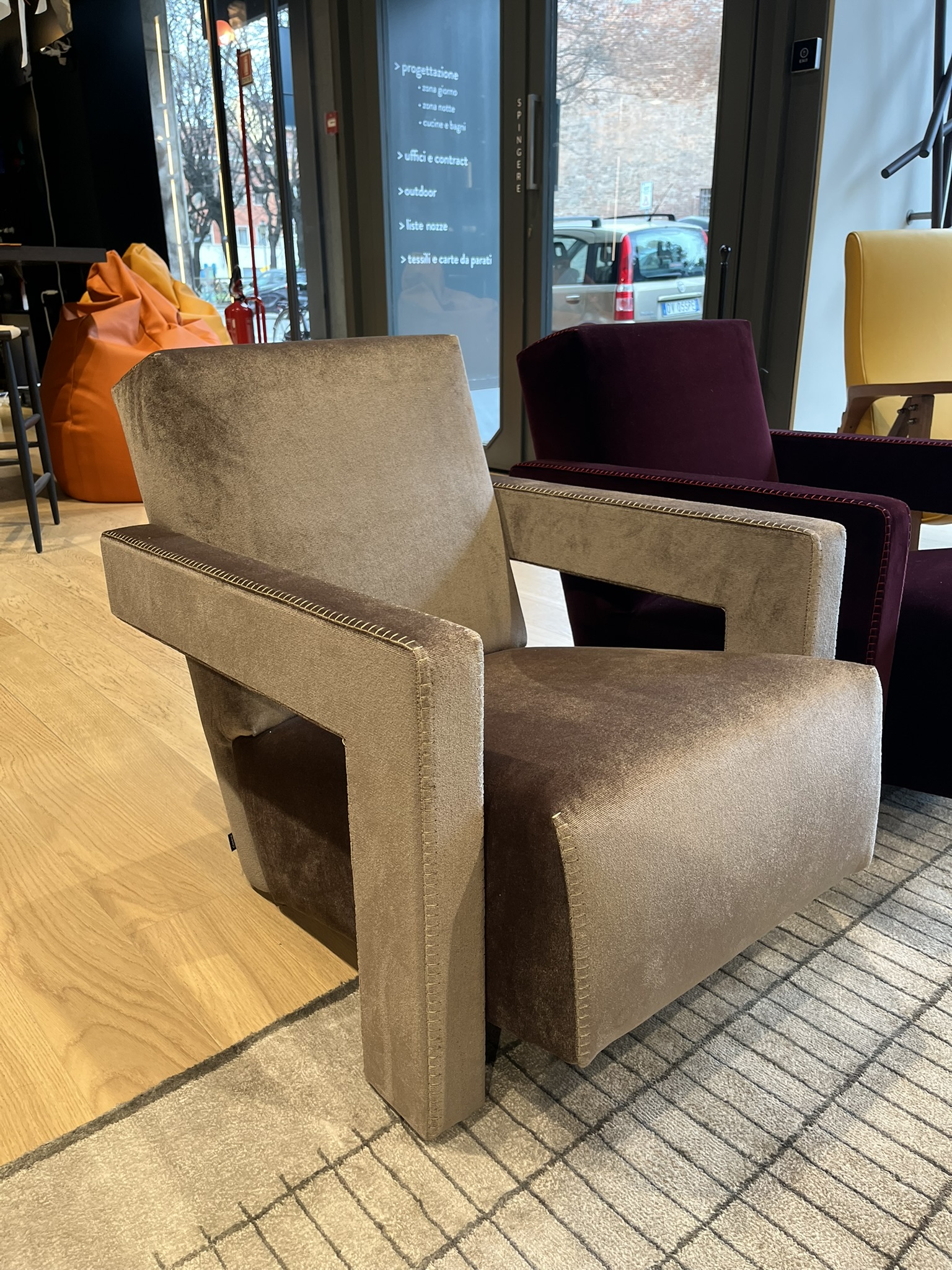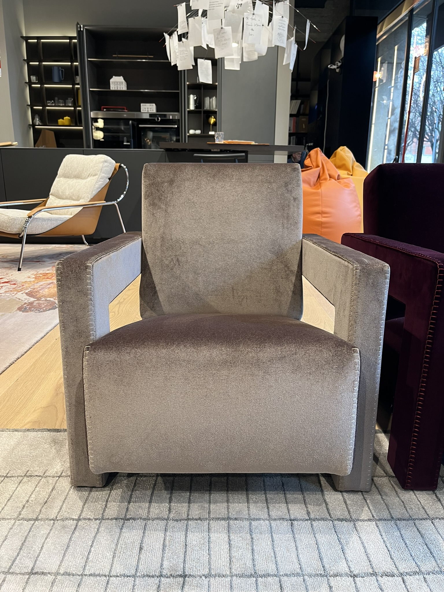 Iconica poltrona Utrecht di Cassina, progettata da Gerrit Thomas Rietveld nel 1935, con imbottitura in poliuretano espanso e ovatta in poliestere. Il telaio portante del sedile e dello schienale è in tubolare di acciaio dotato di cinghie elastiche. Il rivestimento della versione proposta è in tessuto Osaka col. Talpa, con cucitura punta di cavallo filo naturale. Le dimensioni della poltrona sono di cm 64x85xH70.