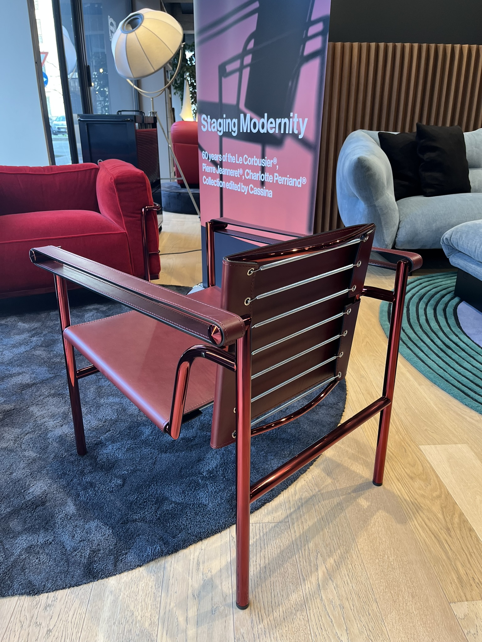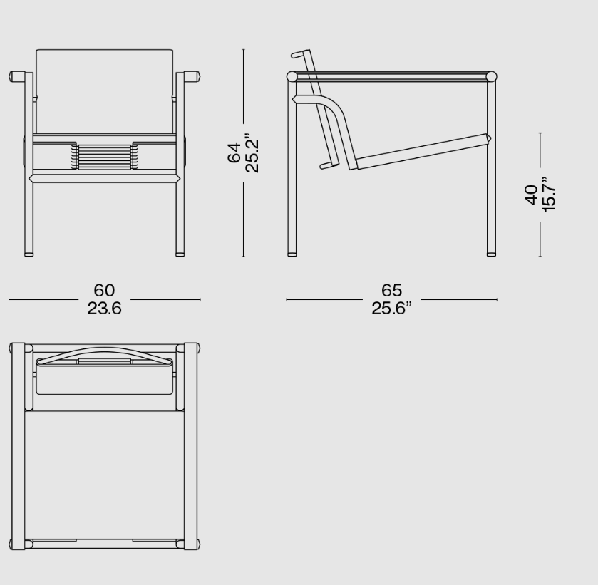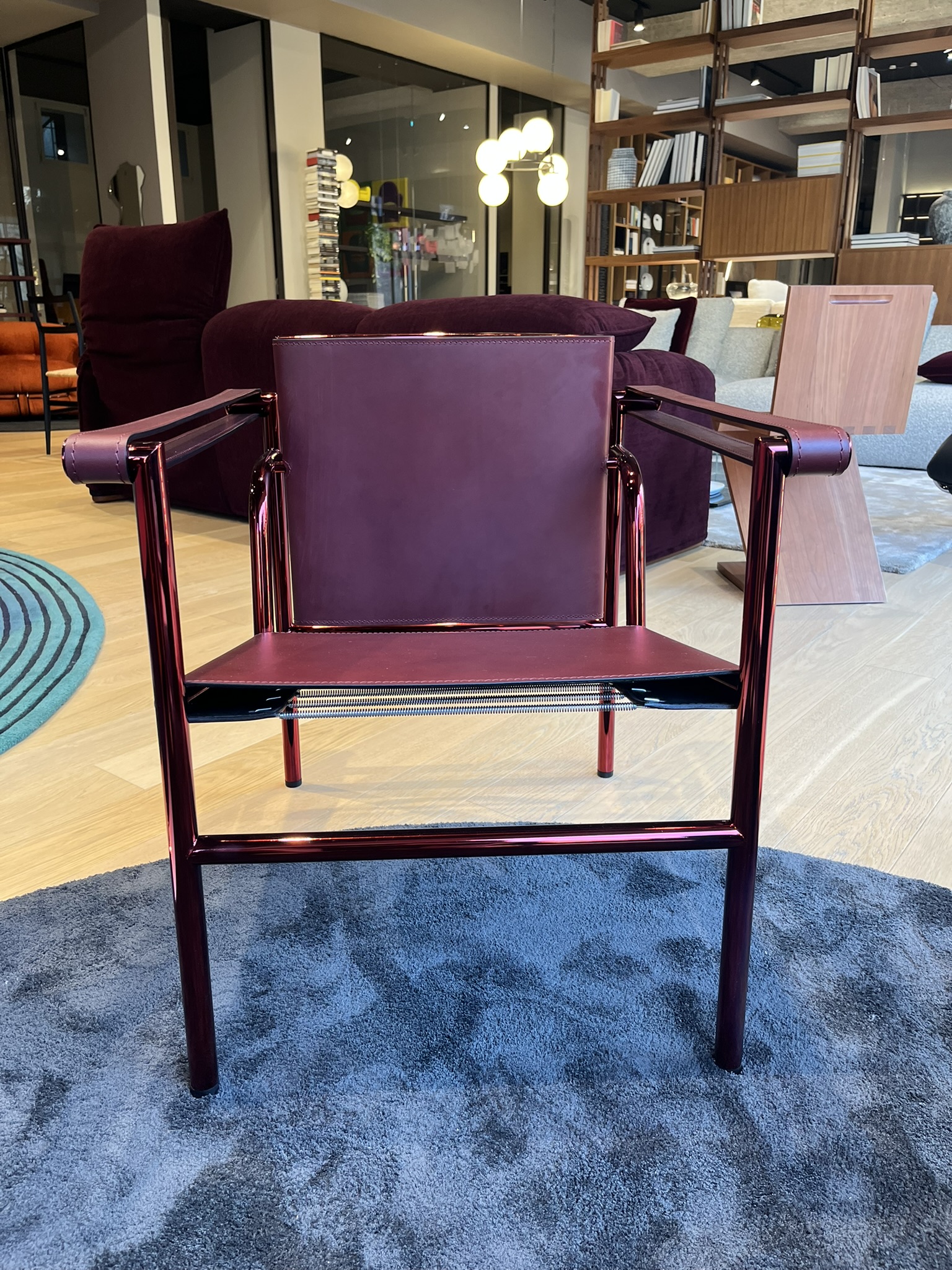 Poltroncina 1 Fauteuil Dossier Basculant di Cassina riproposta per celebrare i 60 anni di produzione della Collezione Le Corbusier®, Pierre Jeanneret®, Charlotte Perriand® con la struttura in tubolare metallico in Gloss Rosso, coordinata alla seduta in Cuoio Plus autoportante nel colore Bordeaux. Le dimensioni sono di cm 60x65xH64.