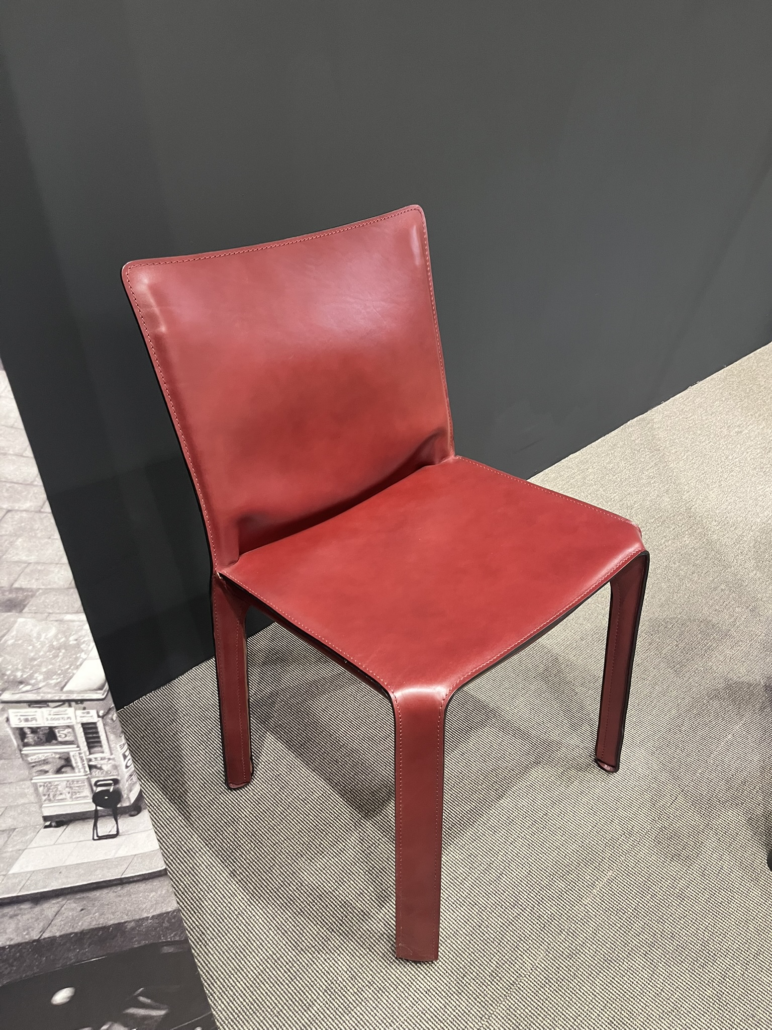 Sedia Cab 412 di Cassina, con struttura in cuoio autoportante e rivestimento formato da 21 parti in cuoio sottoposte a 22 lavorazioni manuali. L’imbottitura è in poliuretano espanso. La sedia disponibile è rivestita in Cuoio Plus col. 2K Bordeaux. Le dimensioni della sedia sono di 52×49 cm.