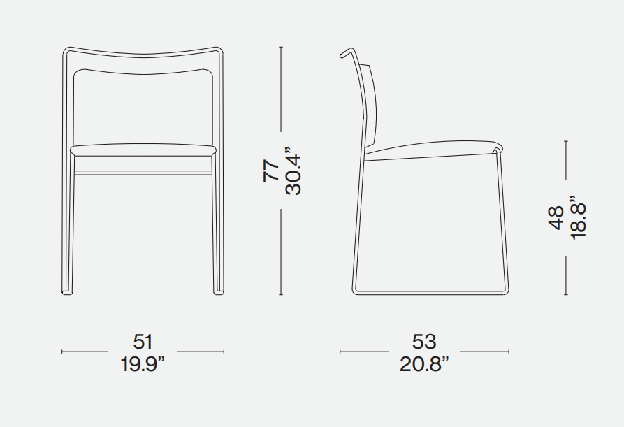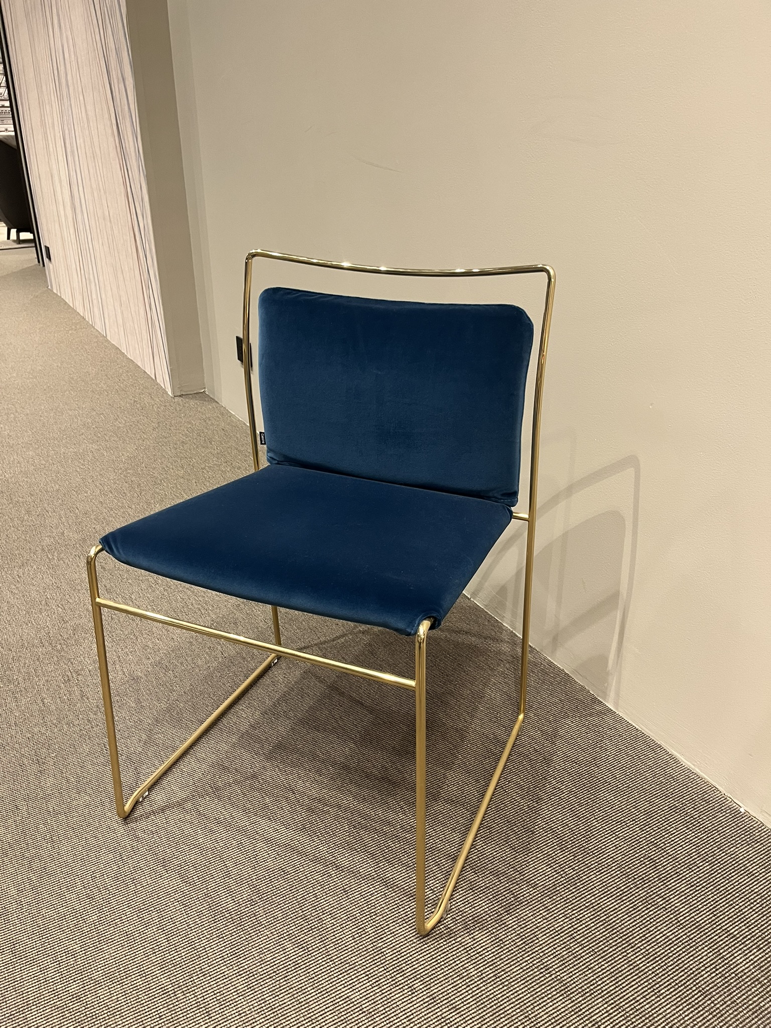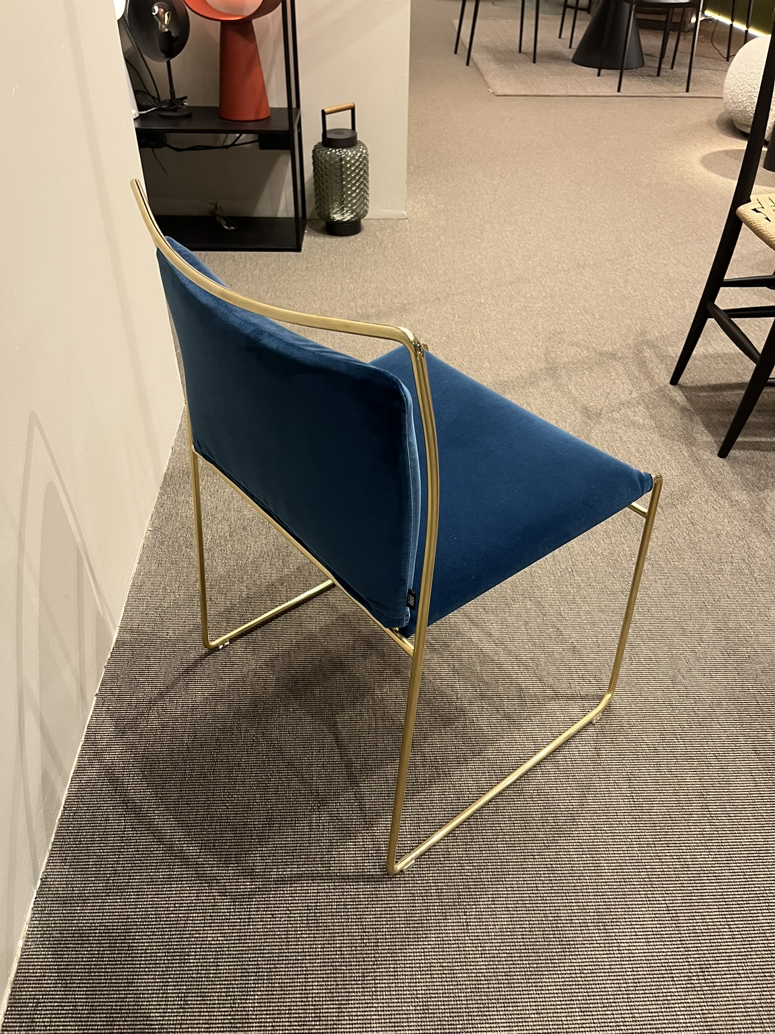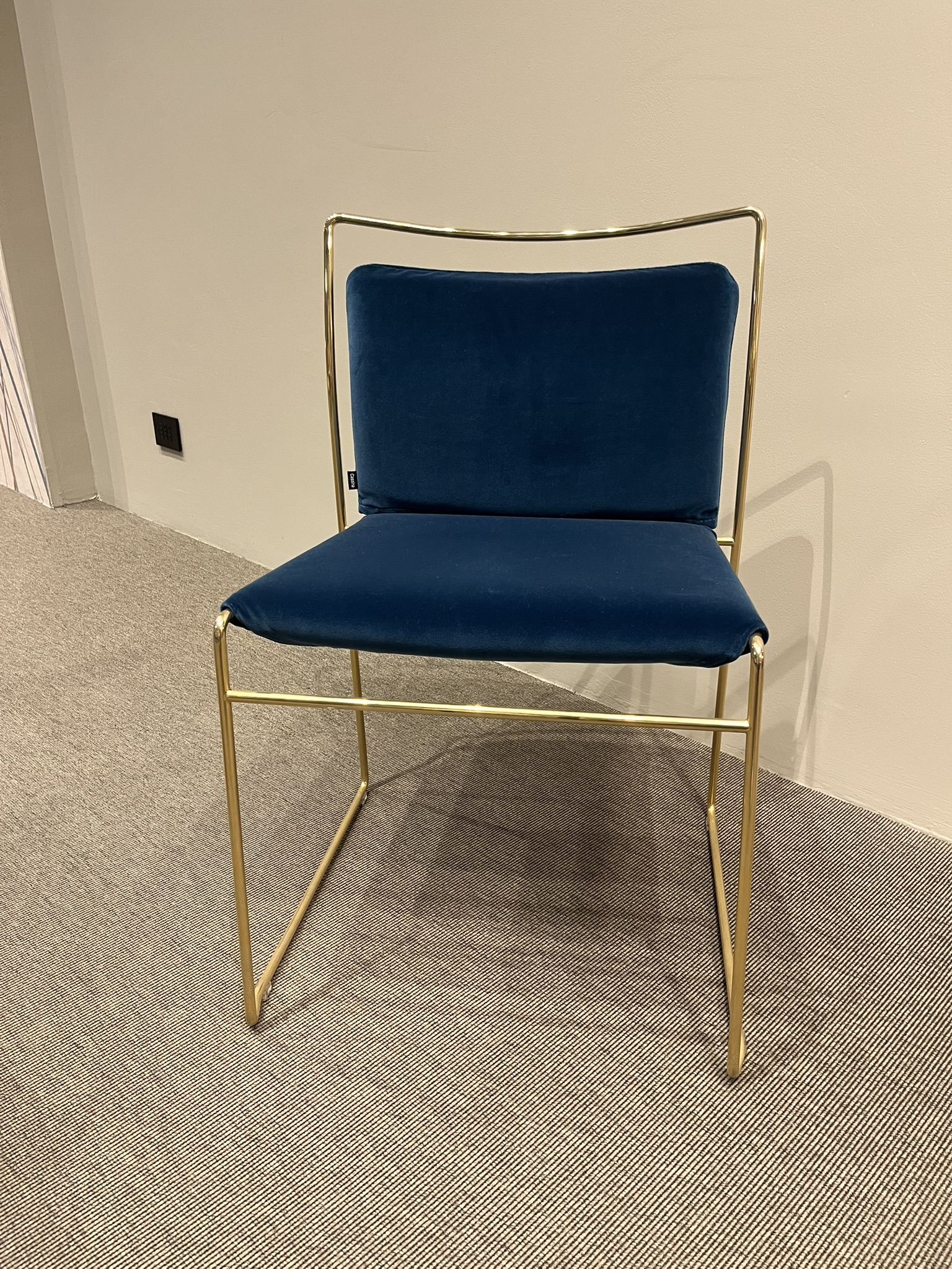 Sedia Tulu di Cassina, con telaio in tondino metallico piegato cromato oro e seduta e schienale con cinghie elastiche e rivestimento in tessuto Ortigia col. Indigo. Le dimensioni della sedia sono di cm 52x53xH77.