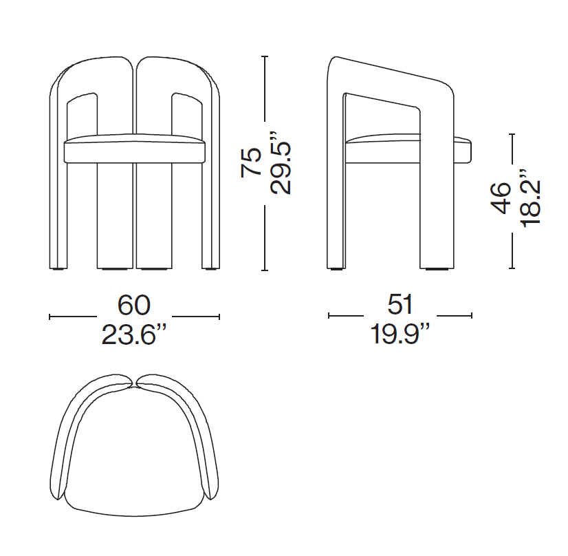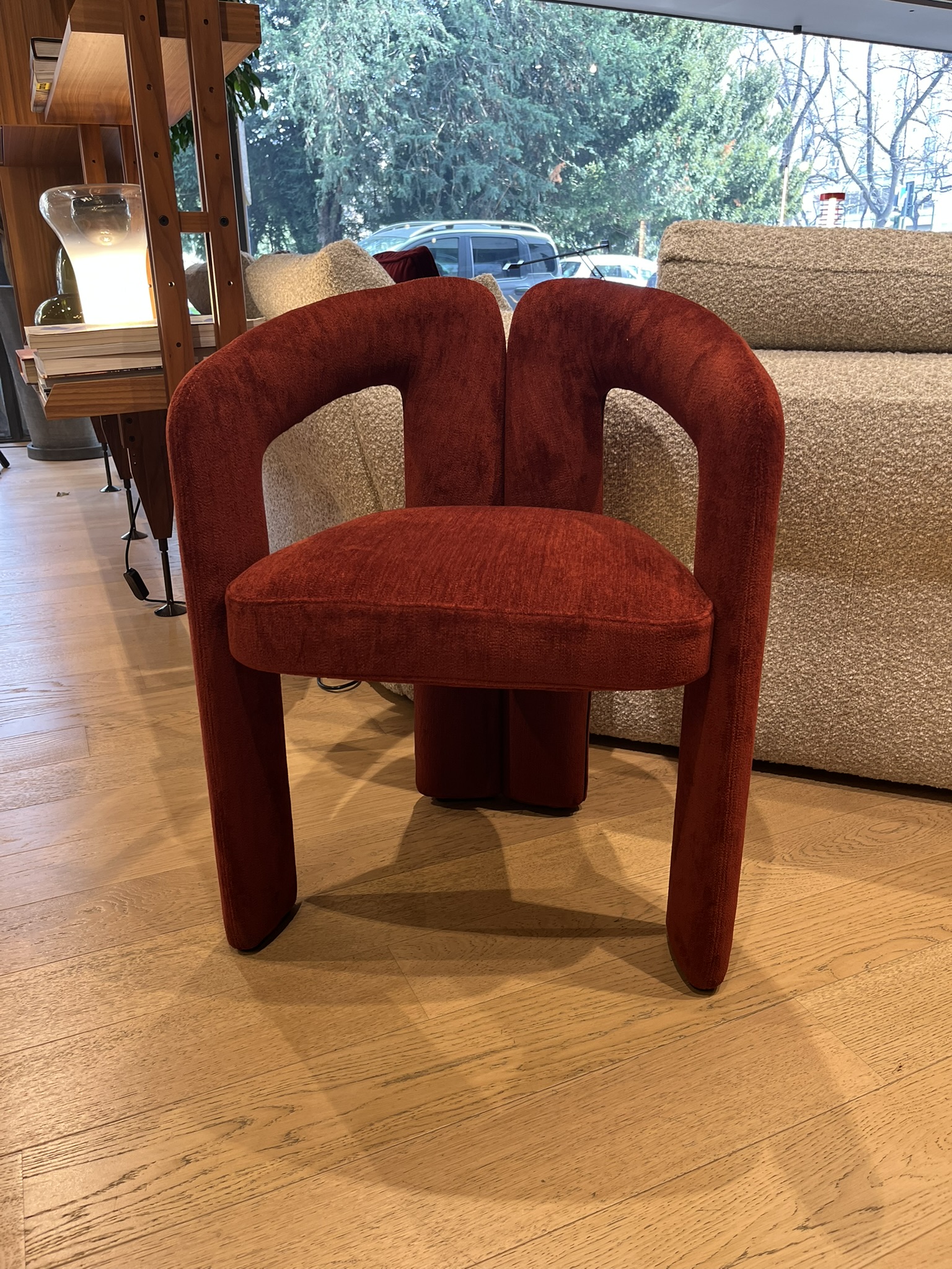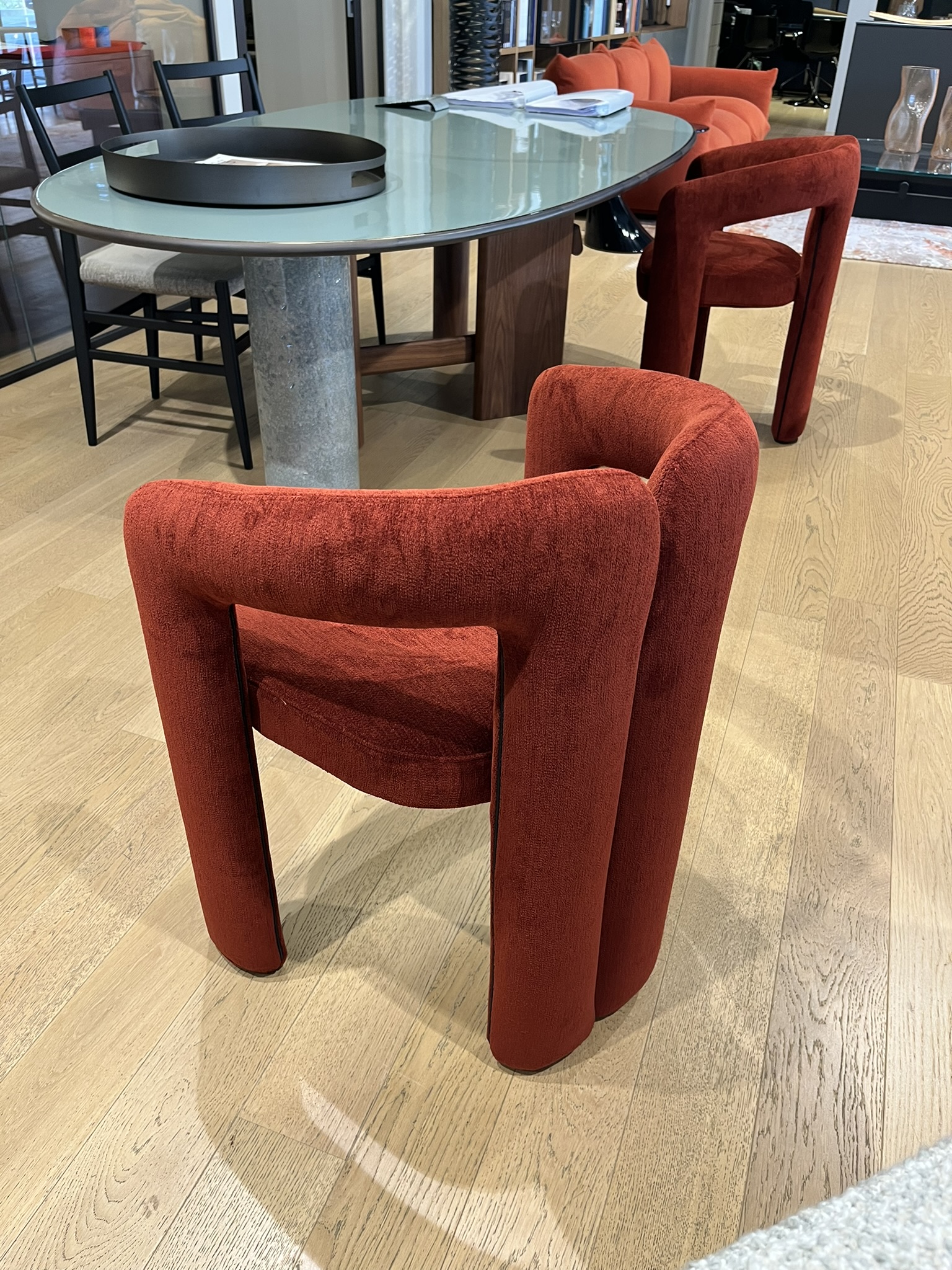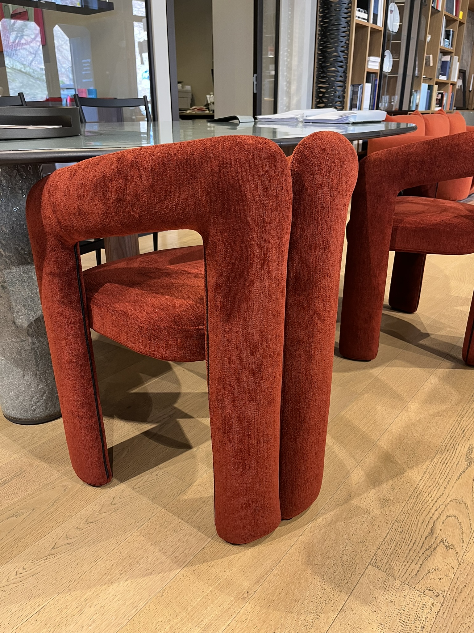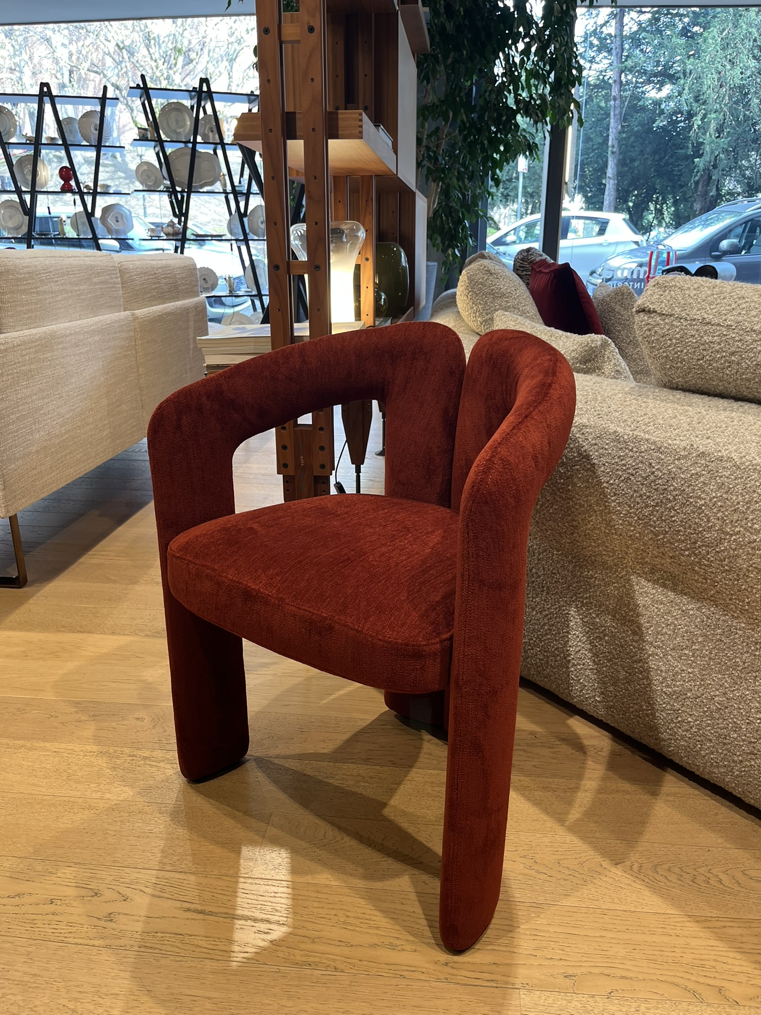 La poltroncine Dudet, disegnate da Patricia Urquiola, sono interamente imbottita in poliuretano espanso con percentuale di polioli derivanti da fonti biologiche. La struttura interna delle gambe è in acciaio e la struttura del sedile è in acciaio con cinghie elastiche. Il rivestimento esterno è in tessuto Fox col. Mattone con zip nera. Le poltroncine hanno dimensioni di cm 60x51xH75.