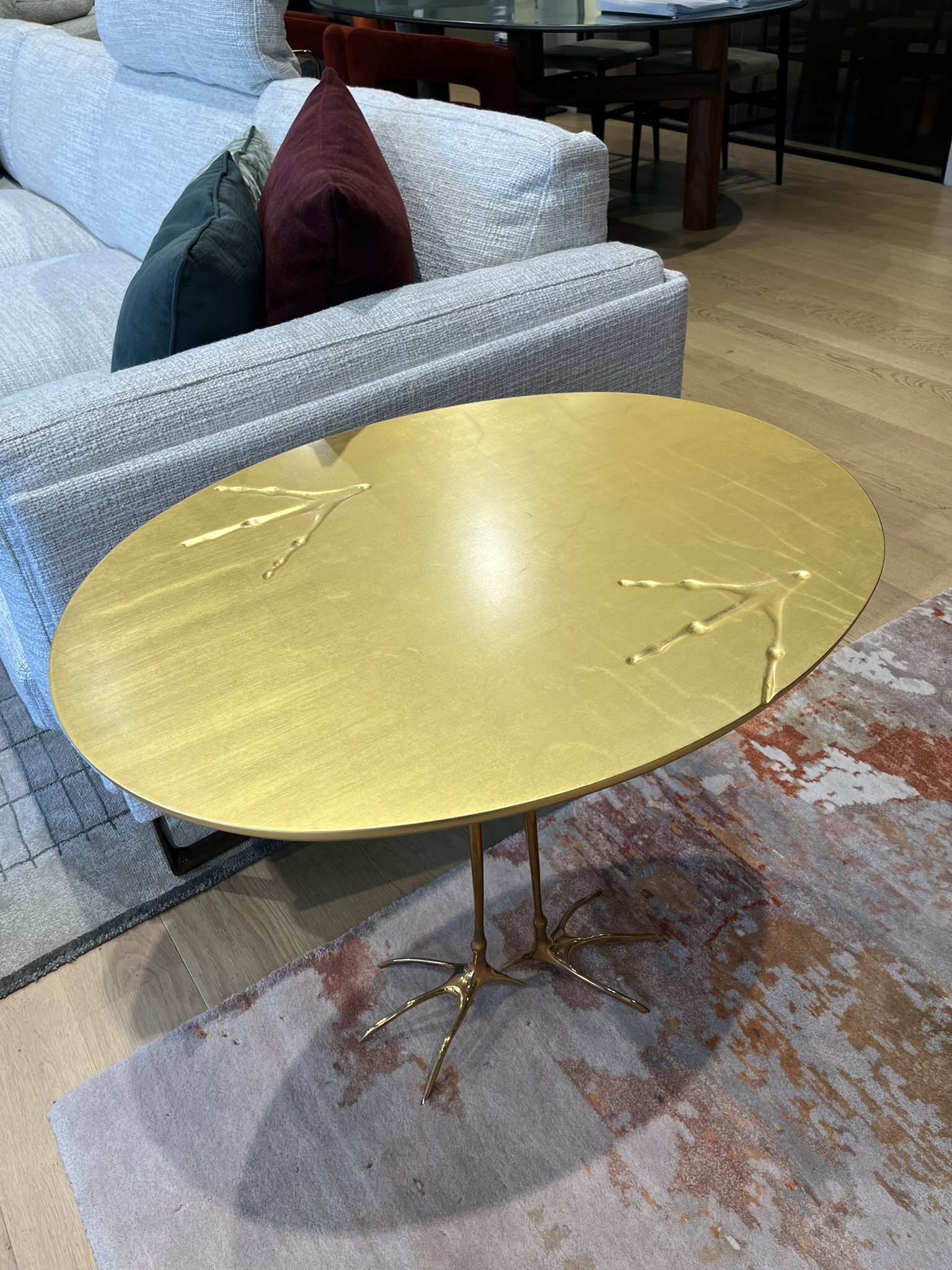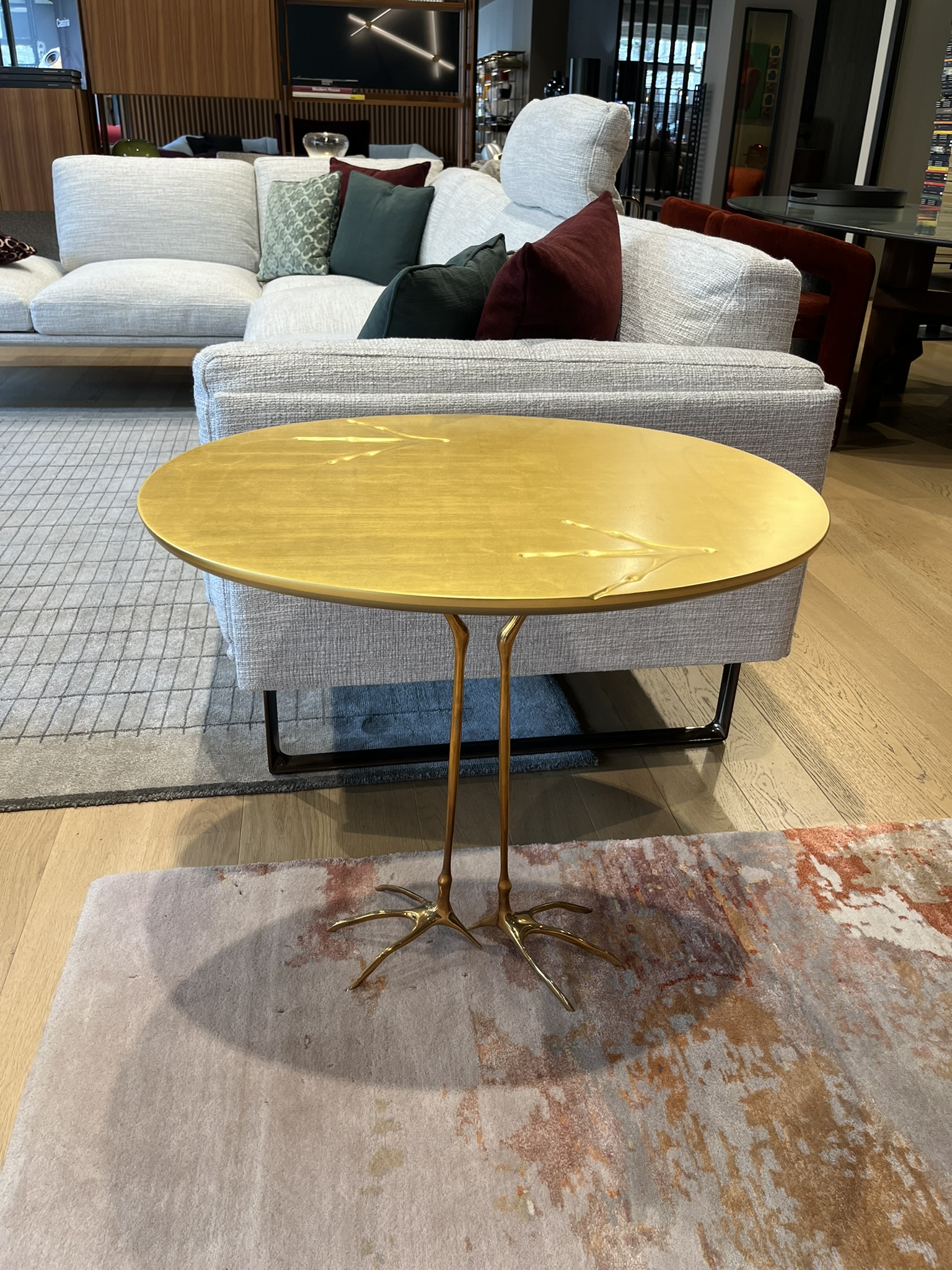Tavolino ovale Traccia di Cassina, con struttura e piano in fusione di bronzo 65 finitura oro giallo. Le dimensioni del tavolino sono di cm 65x53xH65.