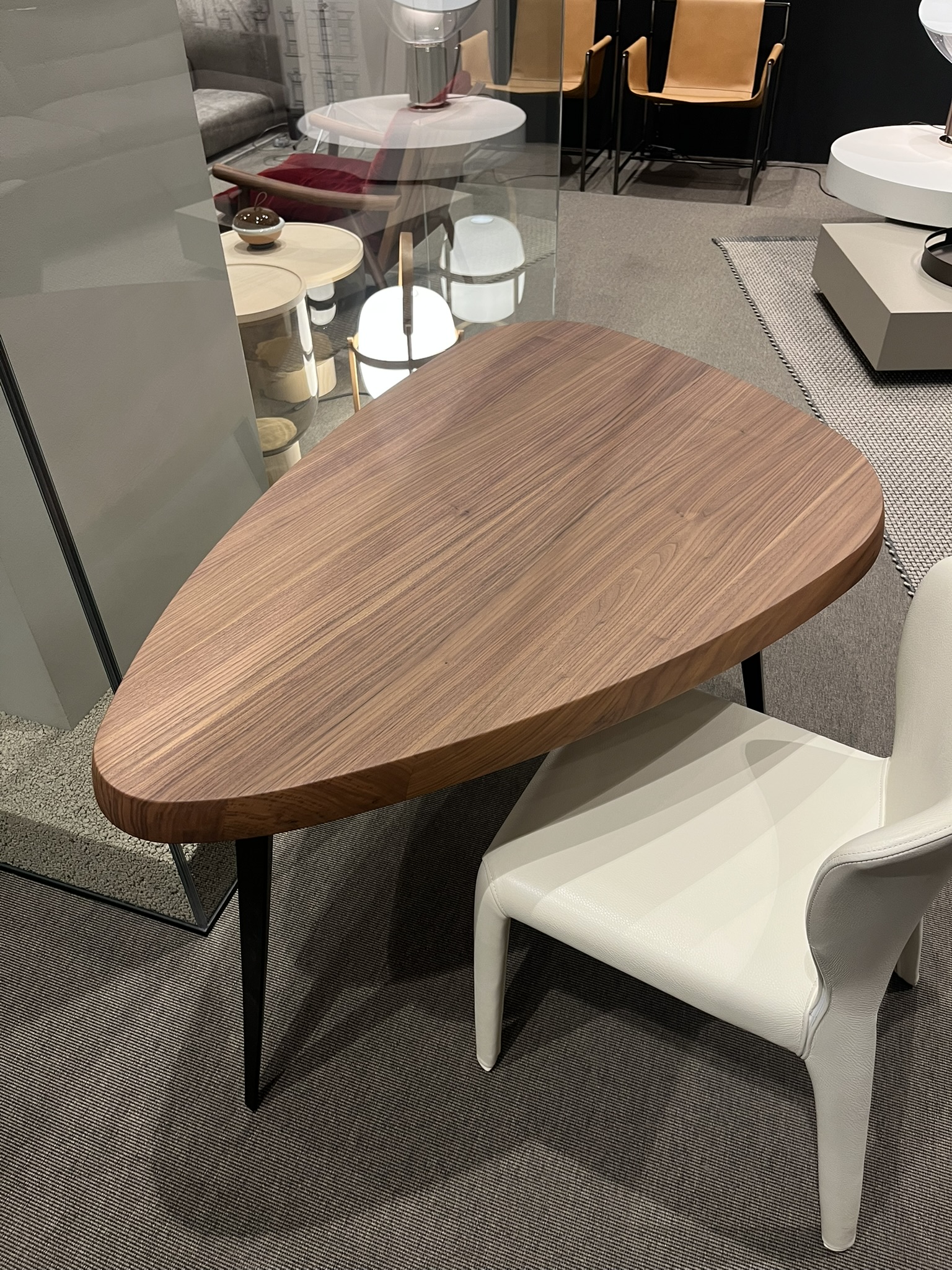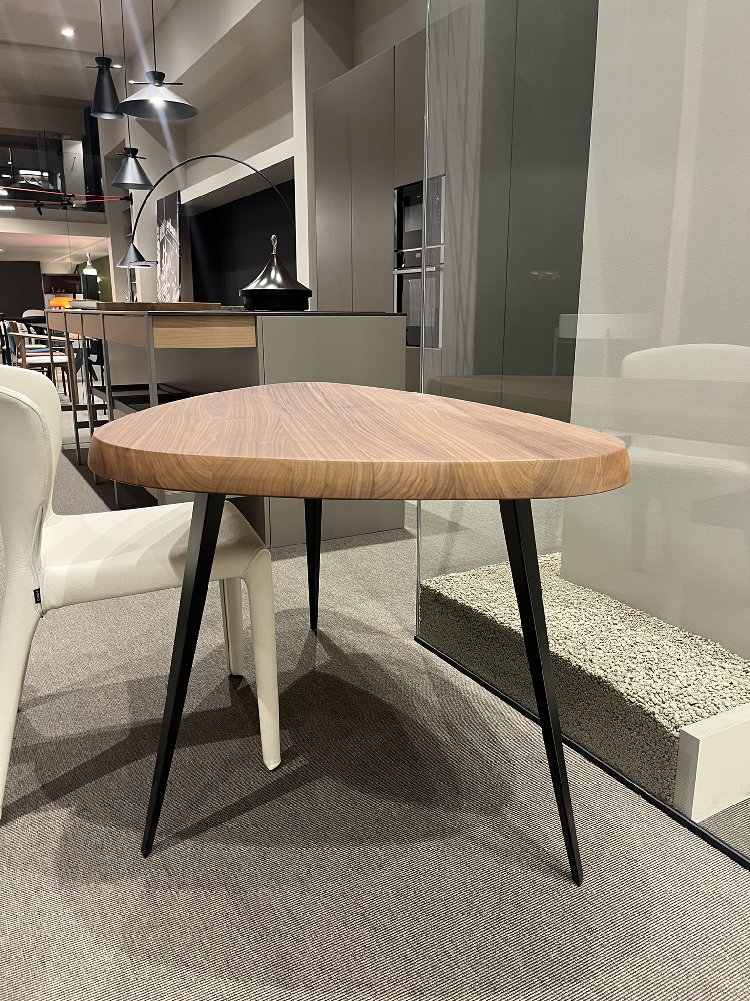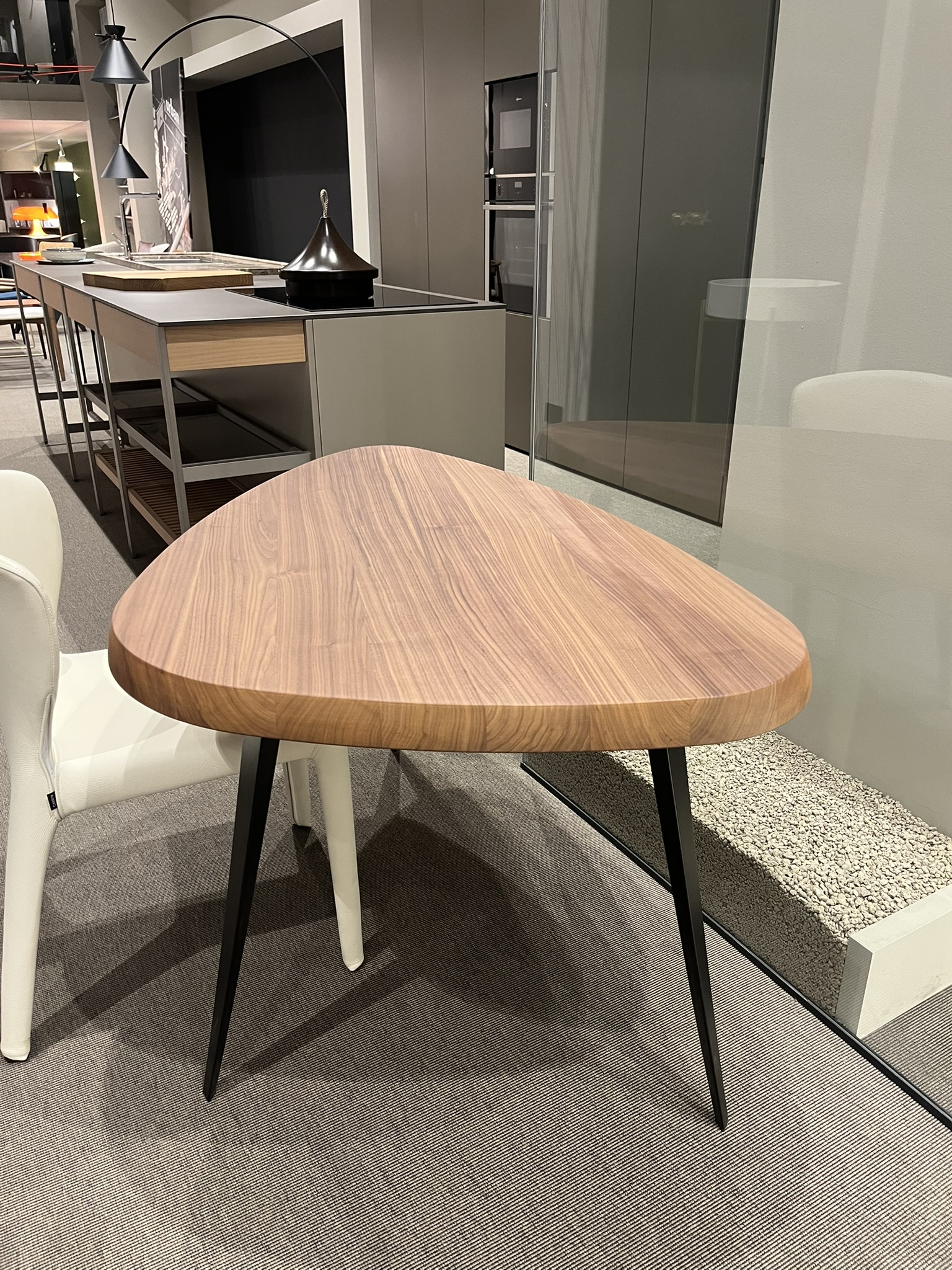 Tavolo triangolare Mexique di Cassina, disegnato da Charlotte Perriand, con piano in massello di noce canaletto e gambe verniciate nero opaco. Le dimensioni del tavolo sono di cm 118x80xH70.