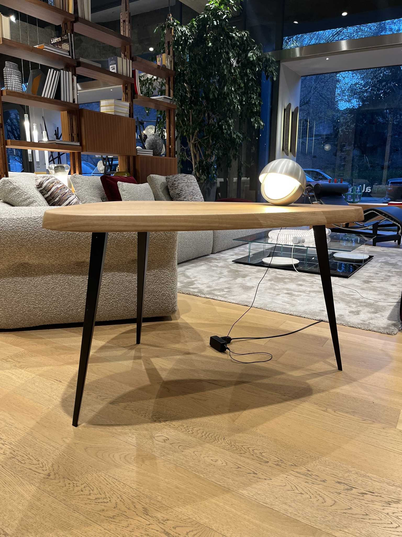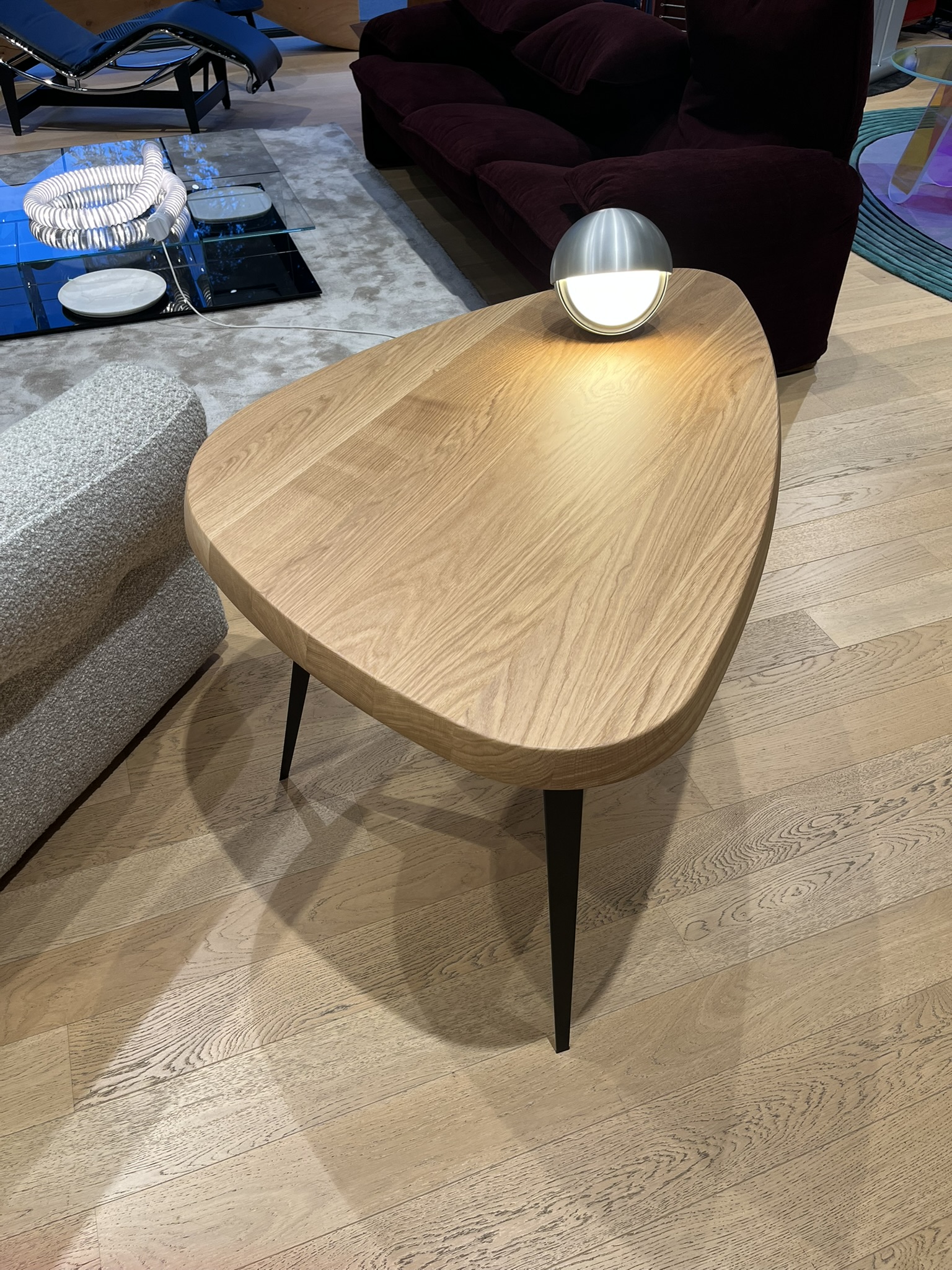 Tavolo triangolare Mexique di Cassina, disegnato da Charlotte Perriand, con piano in massello di rovere naturale e gambe verniciate nero opaco. Le dimensioni del tavolo sono di cm 118x80xH70.
