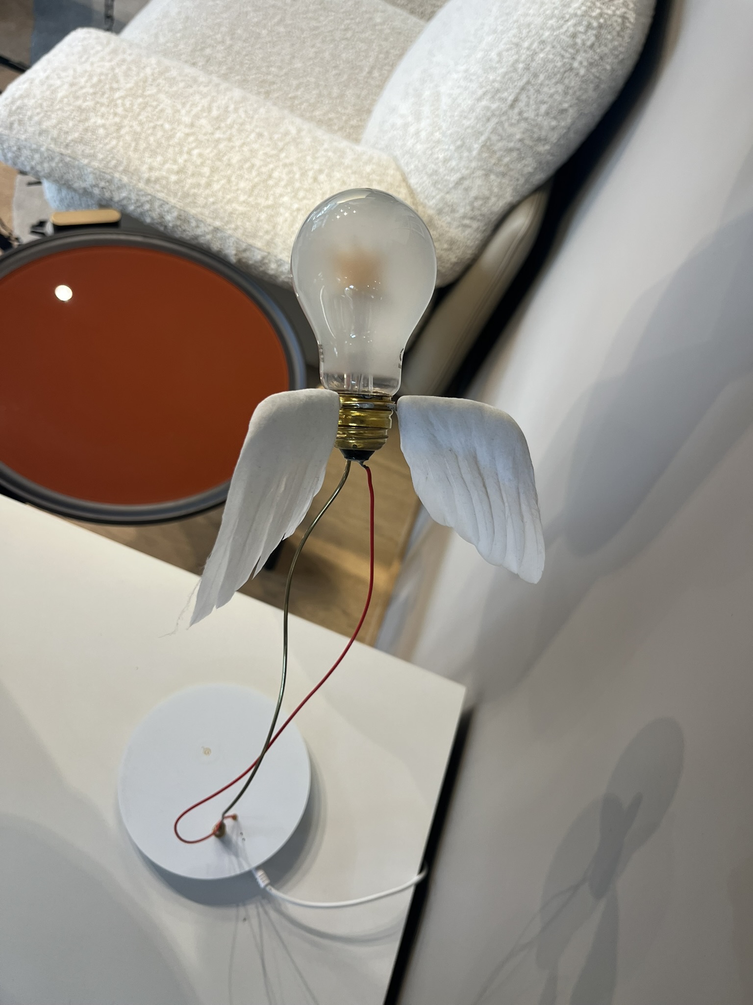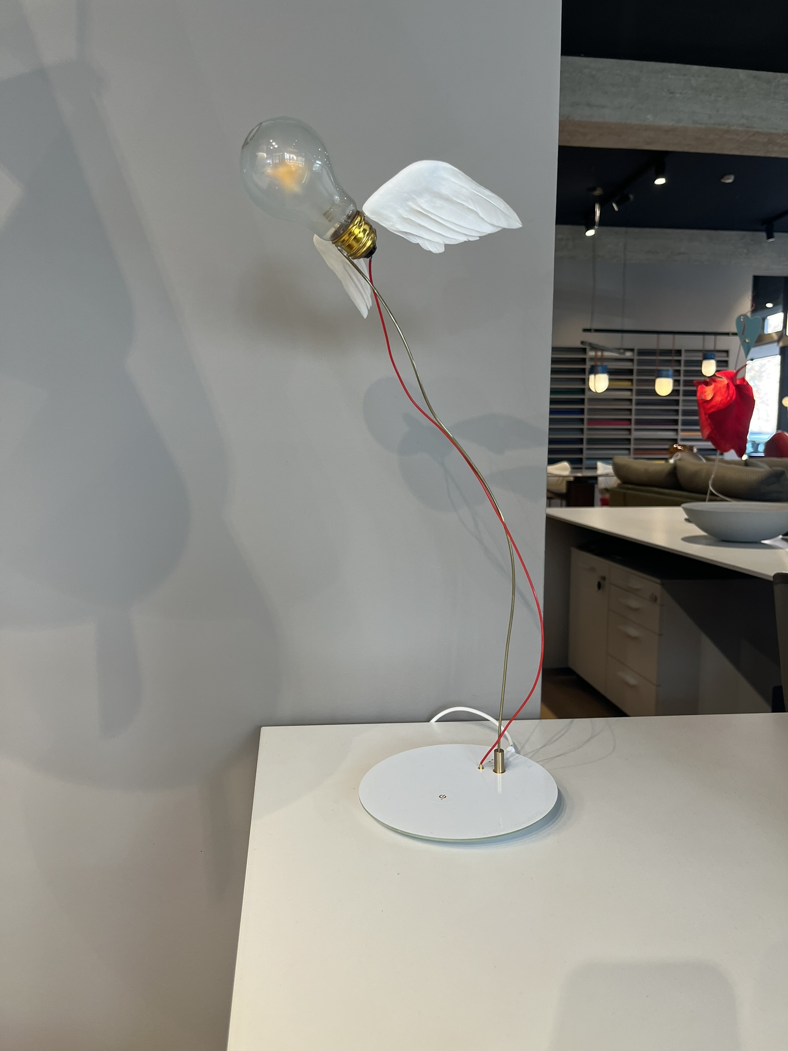 Un classico popolare di Ingo Maurer: la lampada da tavolo Lucellino. La lampadina con le ali si libra in modo mobile sopra il tavolo ed è un vero e proprio richiamo visivo! Vetro, ottone, plastica, ali fatte a mano con piume d’oca. Le dimensioni sono di cm35xH30 circa.