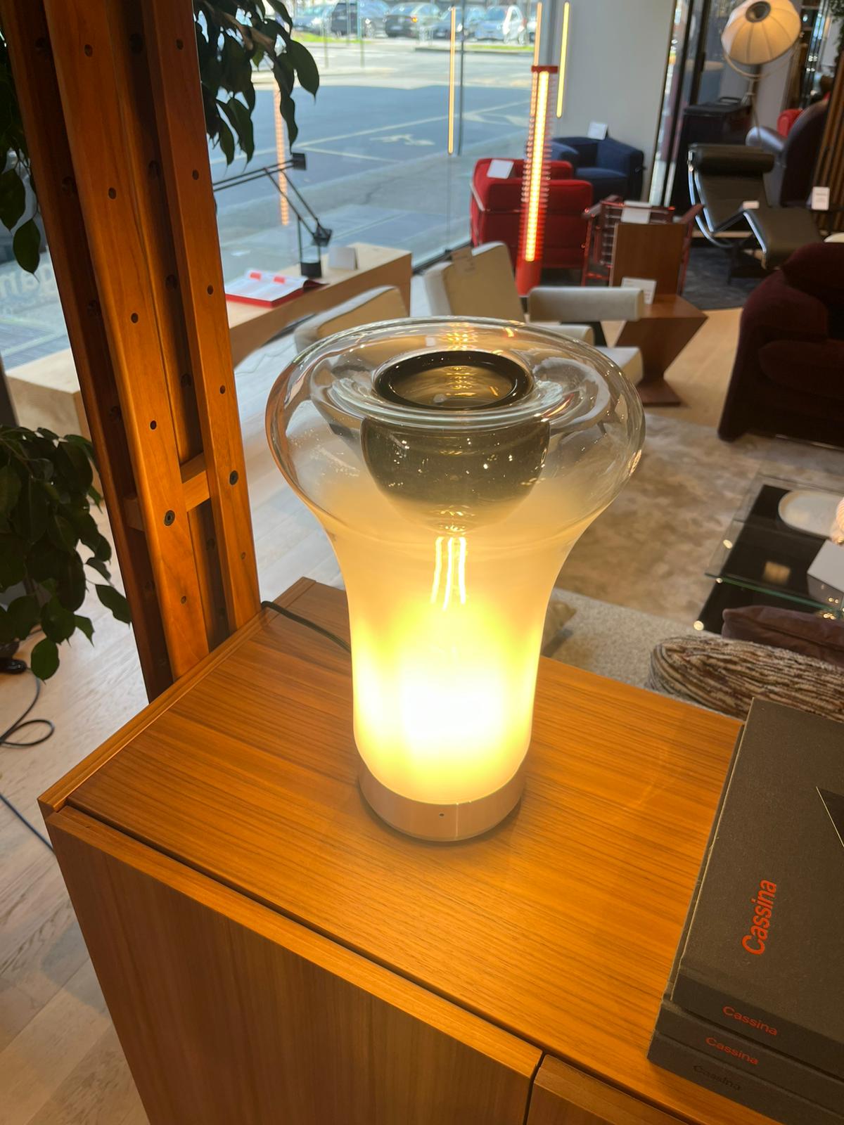 Lampada da tavolo in vetro soffiato fumè e base in alluminio, dalle dimensioni di cm H.33 x Ø 21.