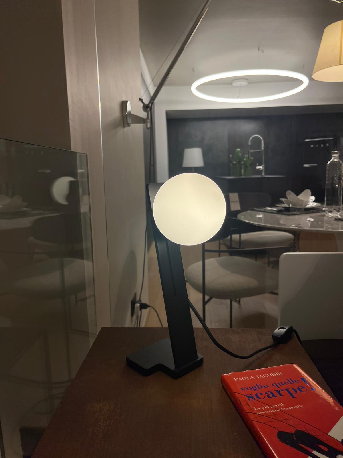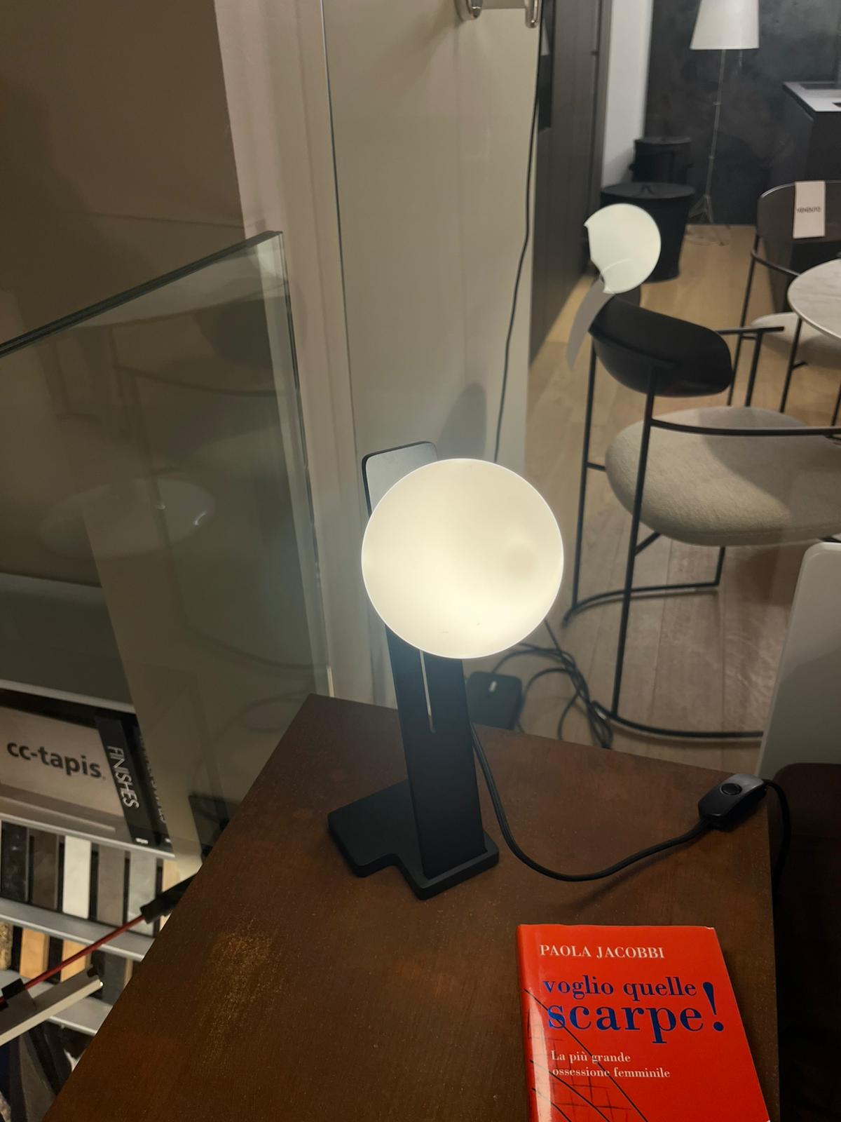 Lampada da tavolo composta da una sfera in vetro soffiato bianco satinato e il telaio nero. Le dimensioni della lampada sono di cm 10 x H32.