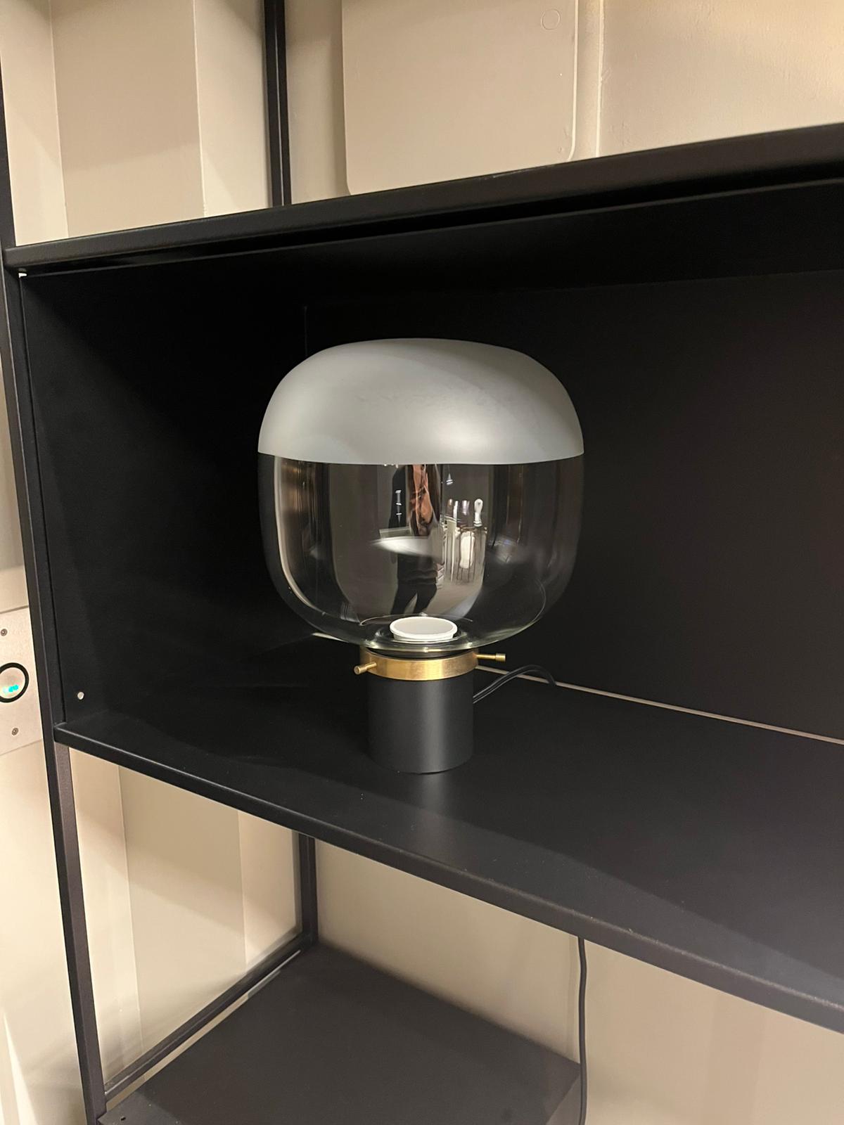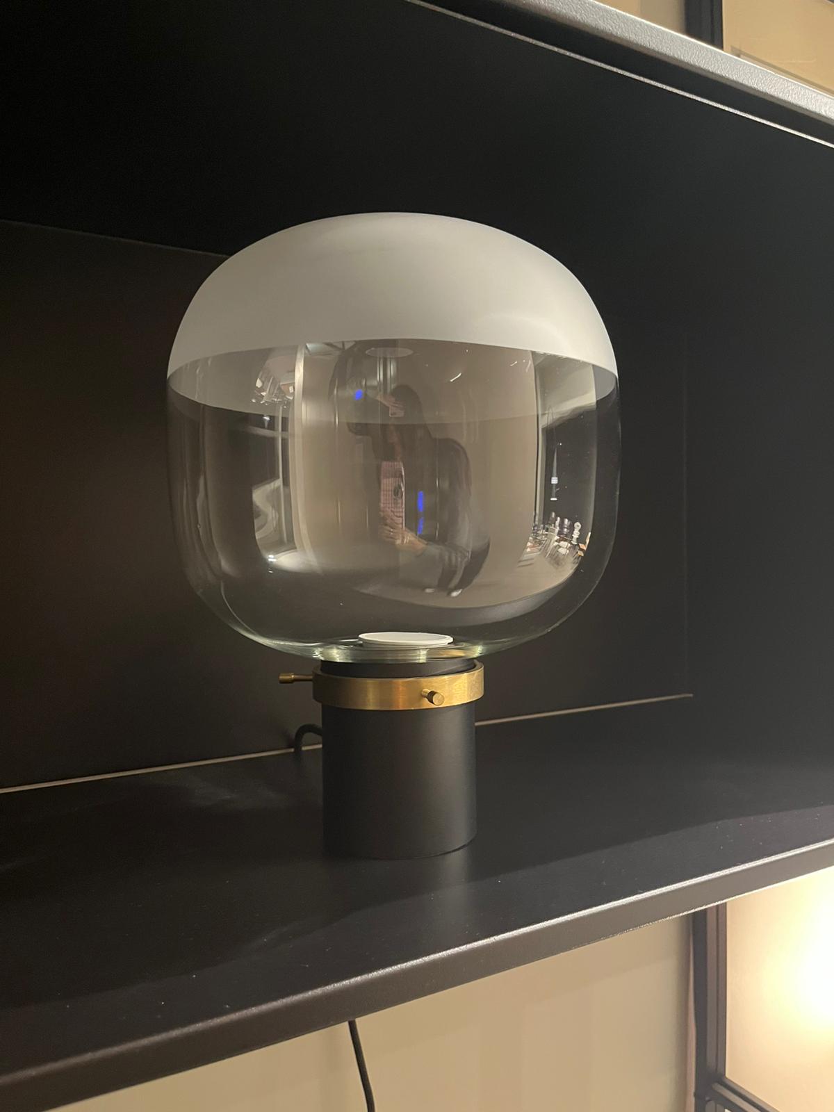 Lampada da tavolo Ghost a luce diffusa e diretta. Il diffusore in vetro è un mix tra la finitura trasparente e quella satinata per garantire una migliore espansione della luce nell’ambiente. Il supporto è realizzato in metallo nero con anello in oro. Le dimensioni sono di cm cm Ø 22 x H 26.