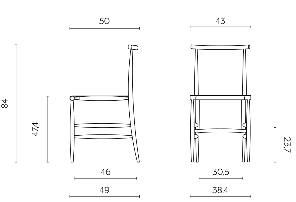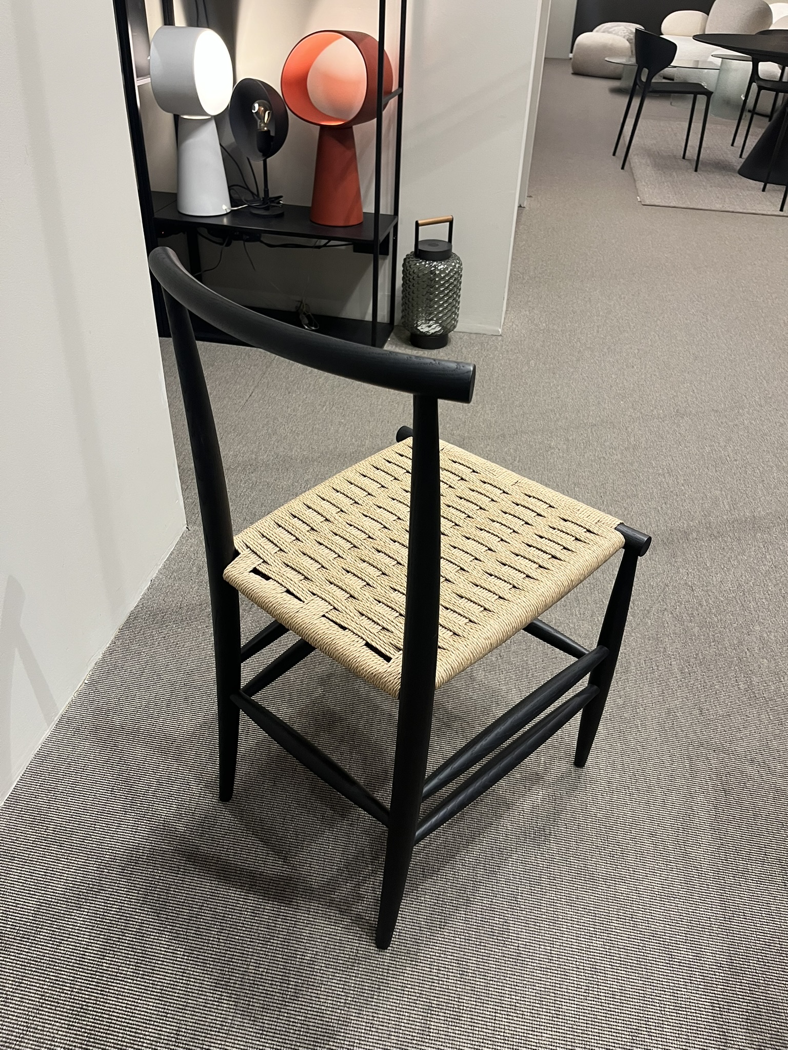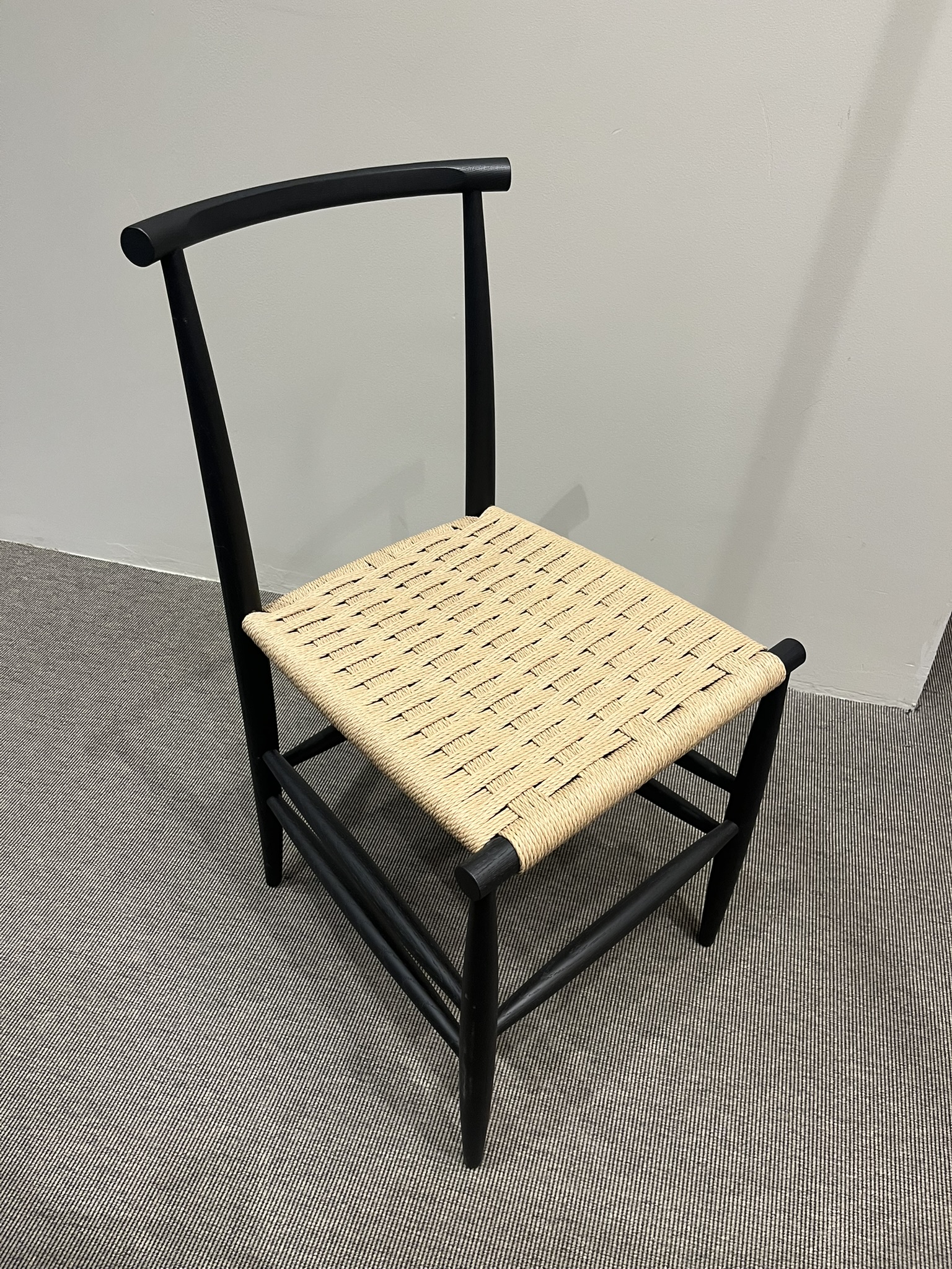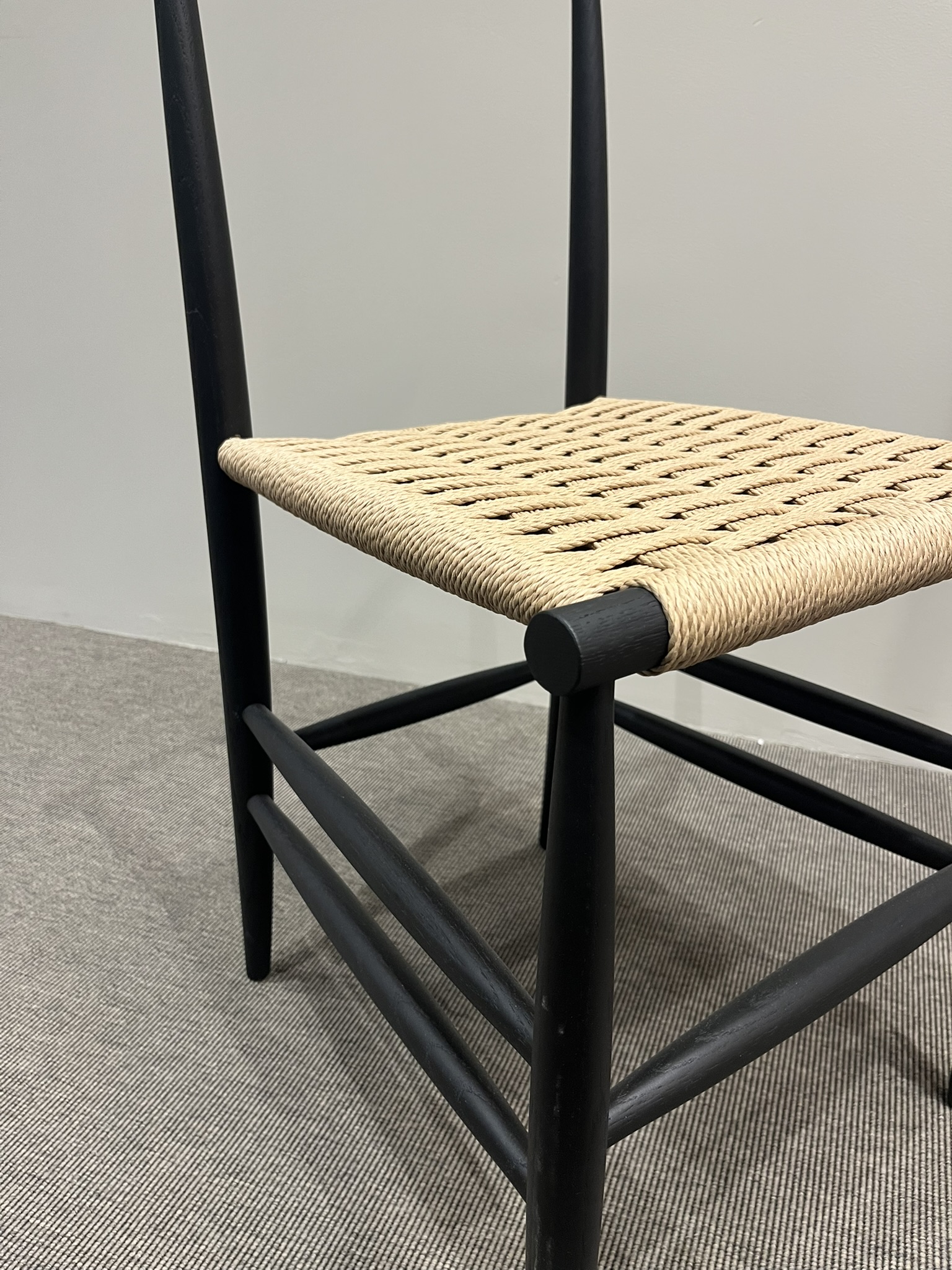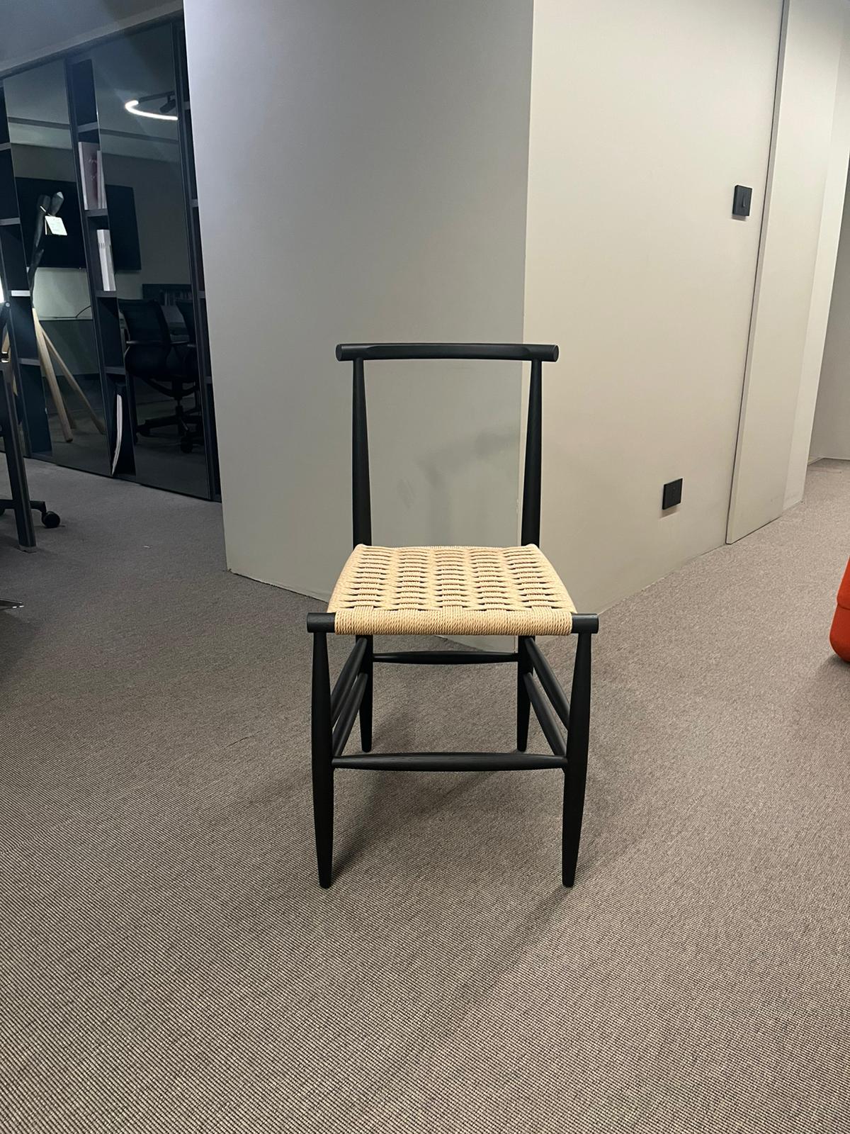 Sedia Pelleossa di Miniforms, con struttura in rovere tinto anilina col. Nero e seduta in paglia di fiume. Le dimensioni sono di cm 43x50xH80.