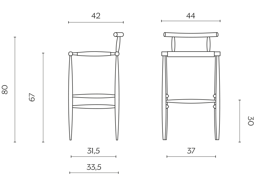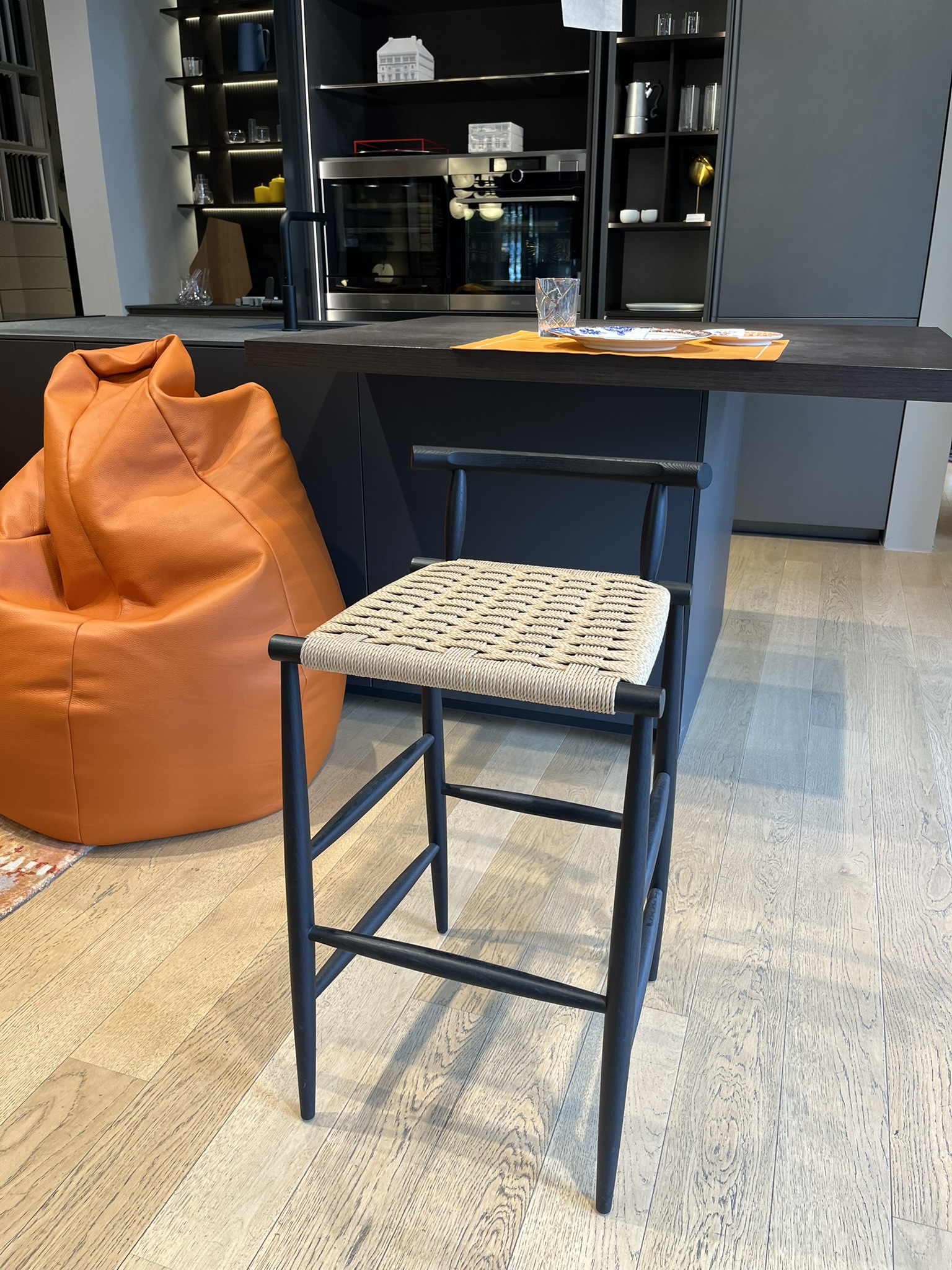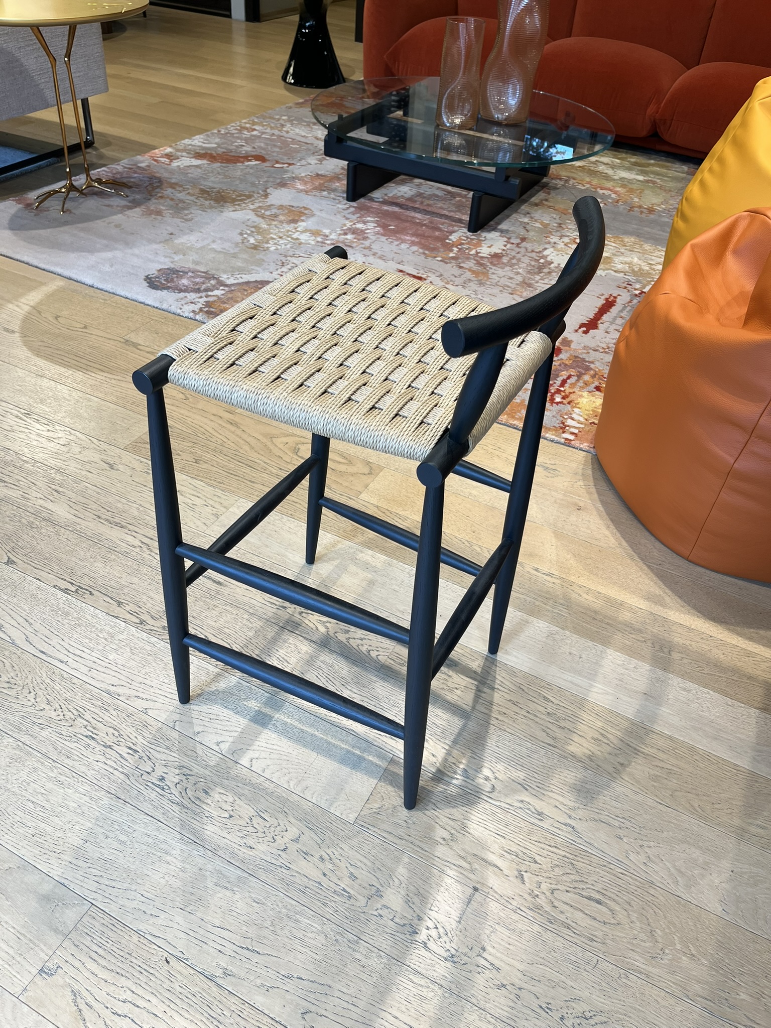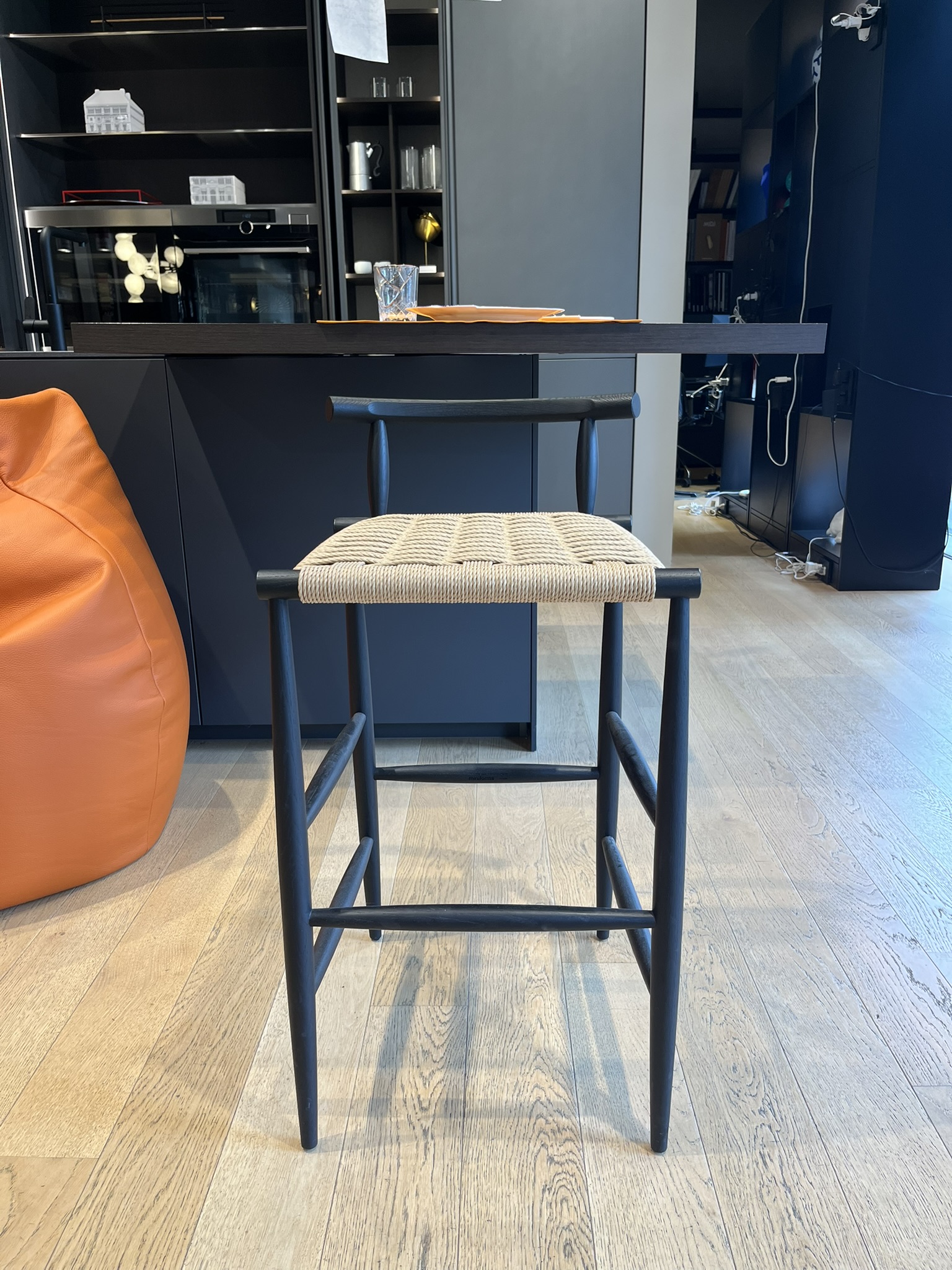 Sgabello Pelleossa di Miniforms, con struttura in rovere tinto anilina col. Nero e seduta in paglia di fiume. Le dimensioni dello sgabello sono di cm 44x42xH80.