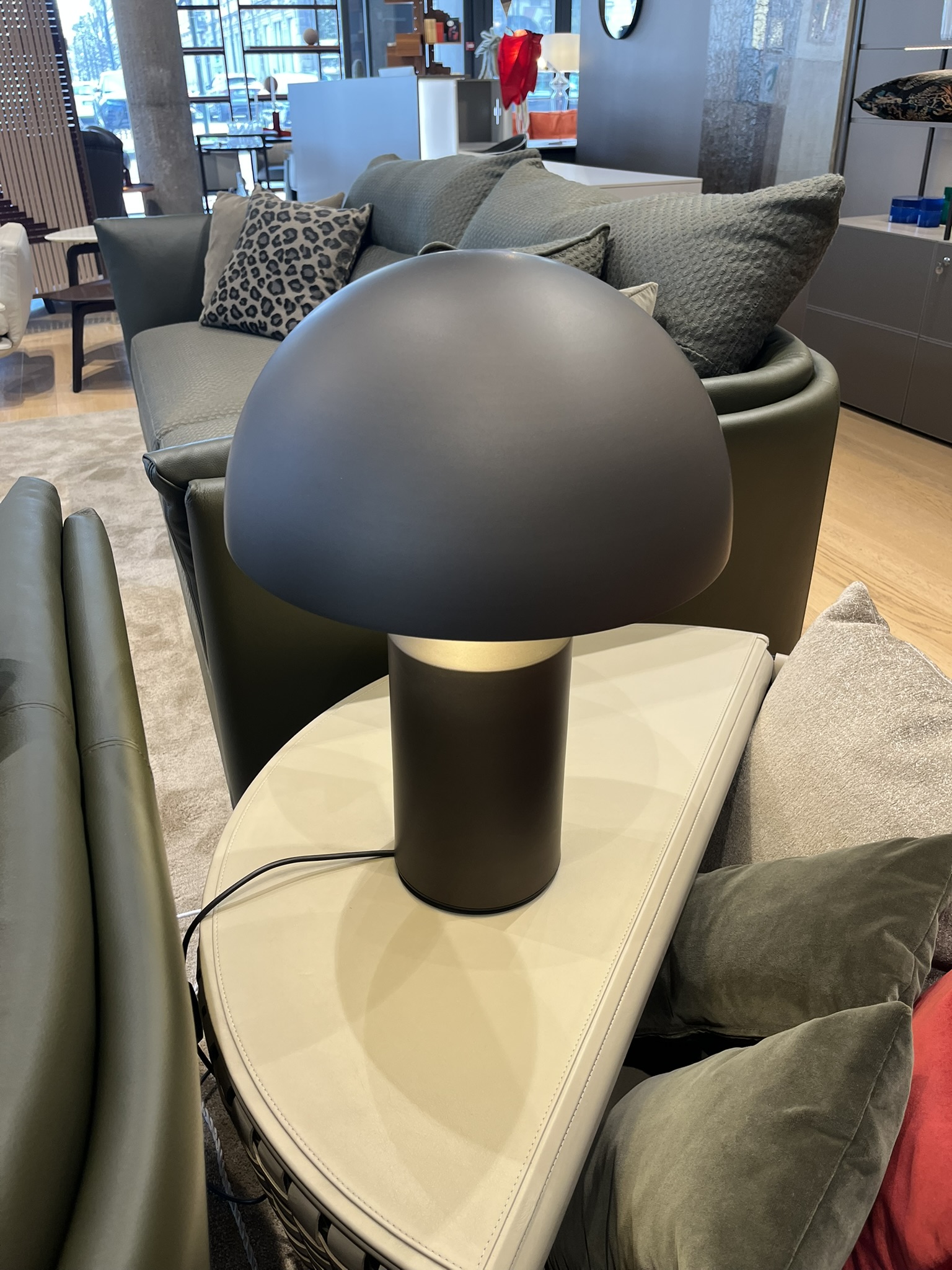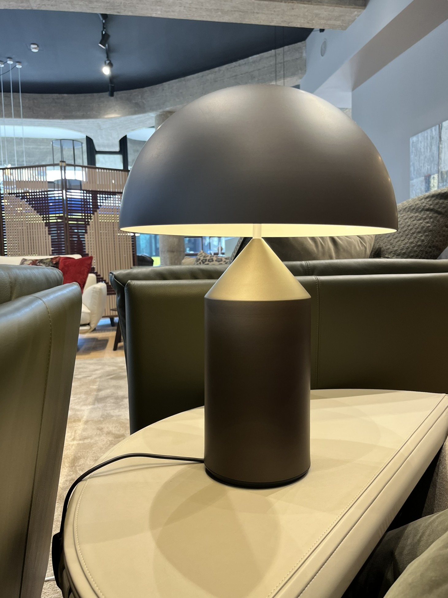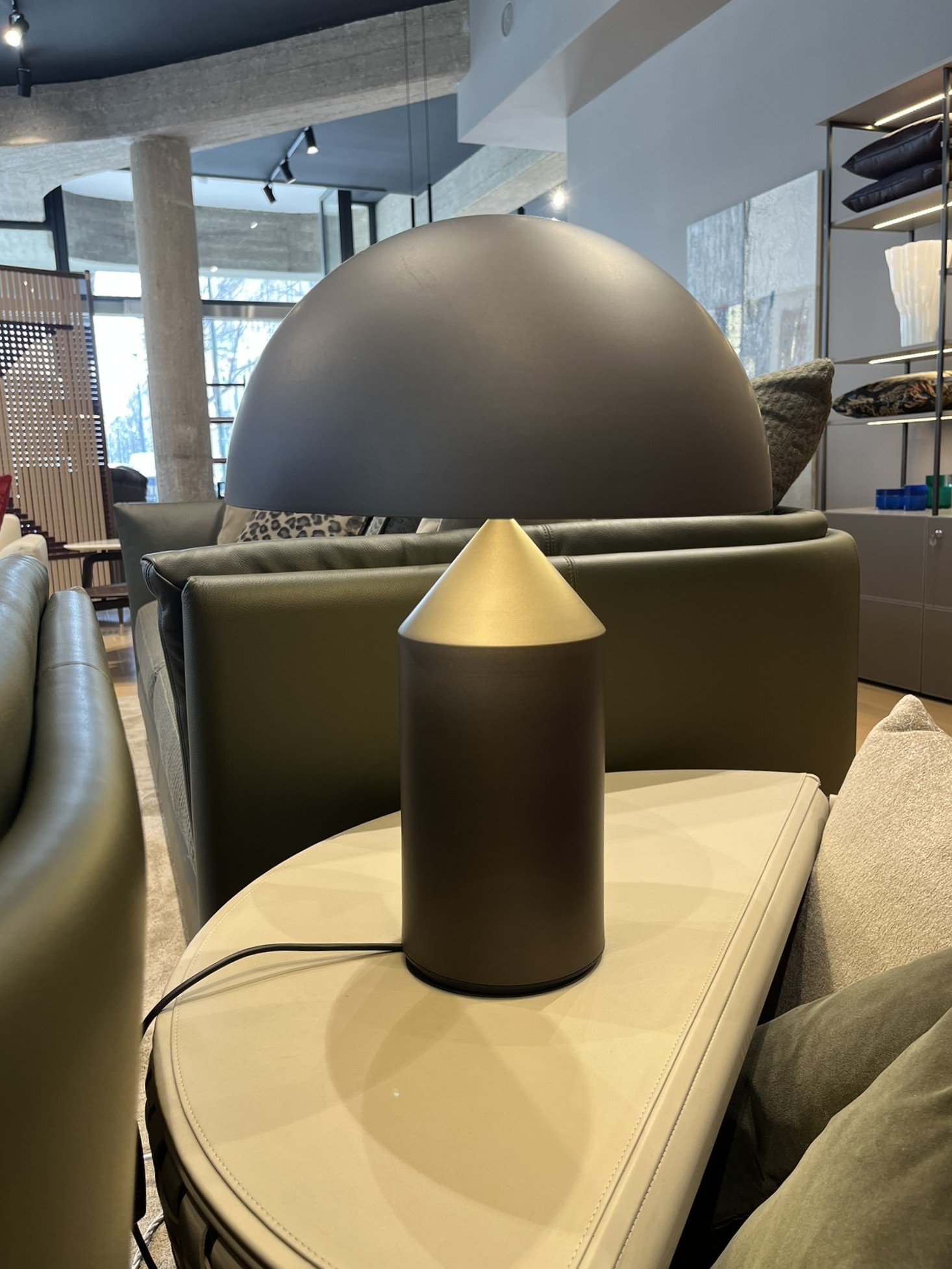 Lampada da tavolo a luce diretta e riflessa in alluminio bronzo. Accensione con dimmer. Dimensioni: cm Ø 38 x H.50.