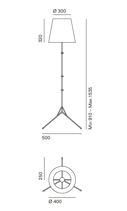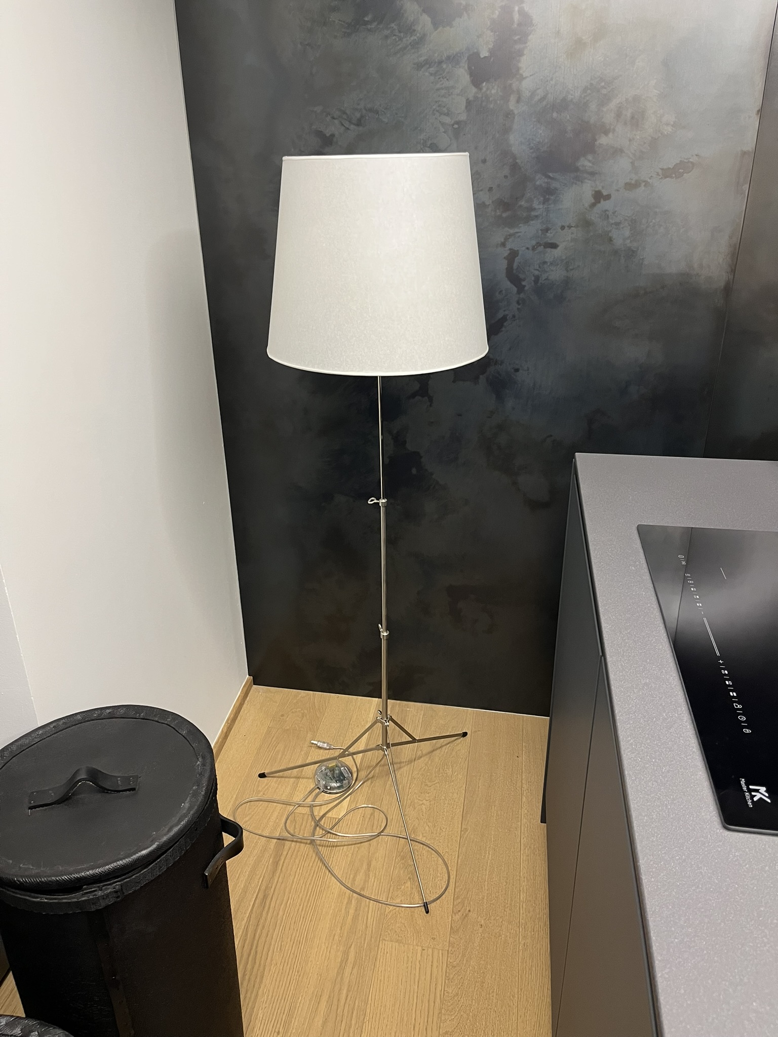 Lampada da terra con cavalletto in metallo nichelato e paralume in pergamena bianca. La struttura ha le dimensioni di cm B.50 x H. 91/153 mentre il paralume di cm Ø 30/40 x H.32.