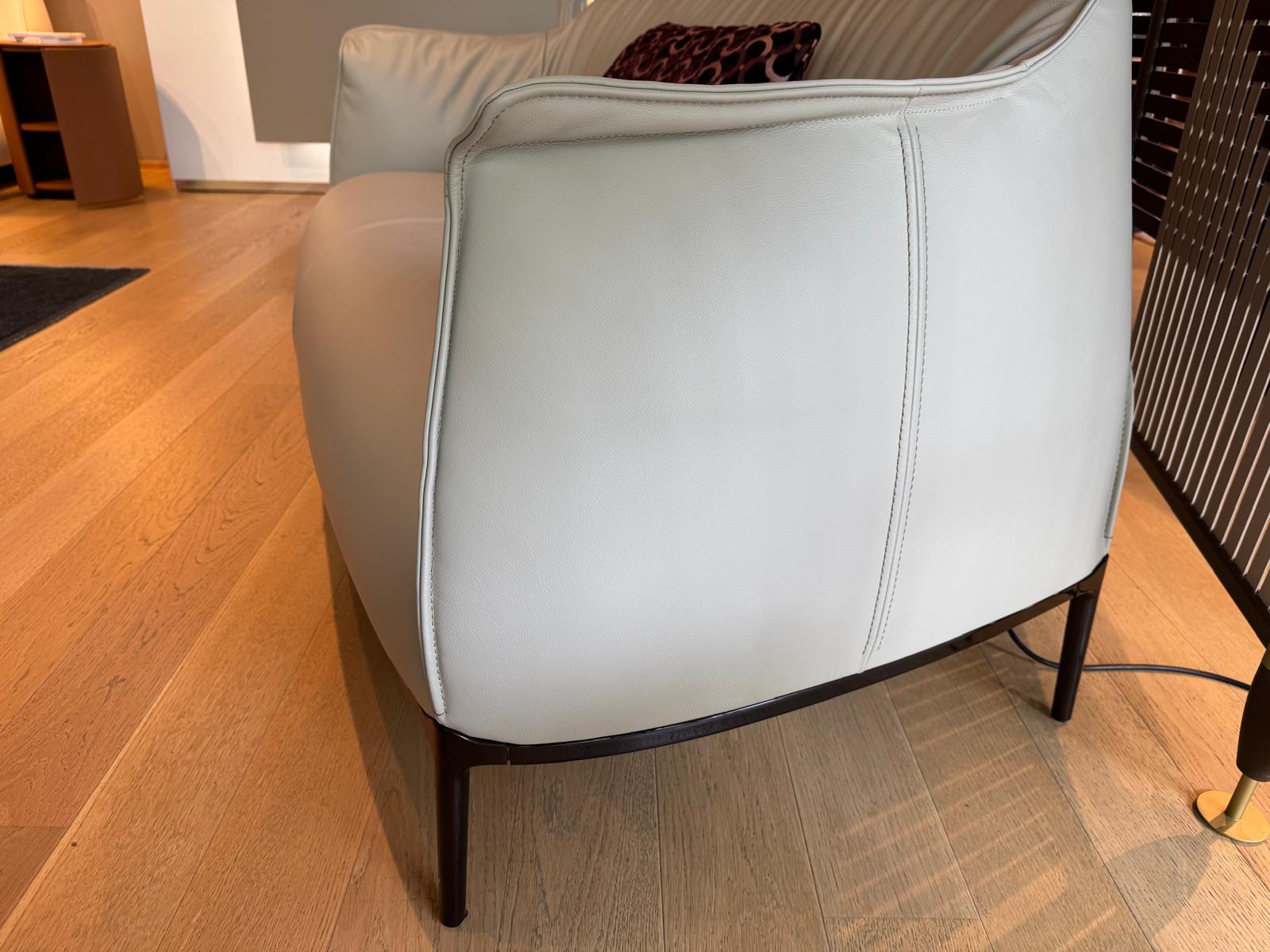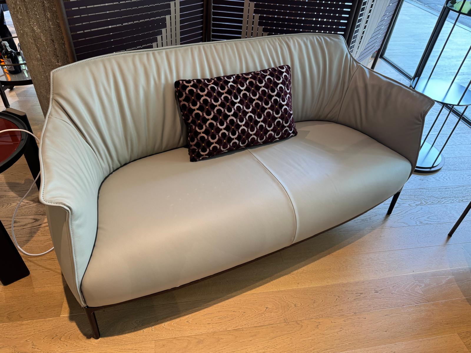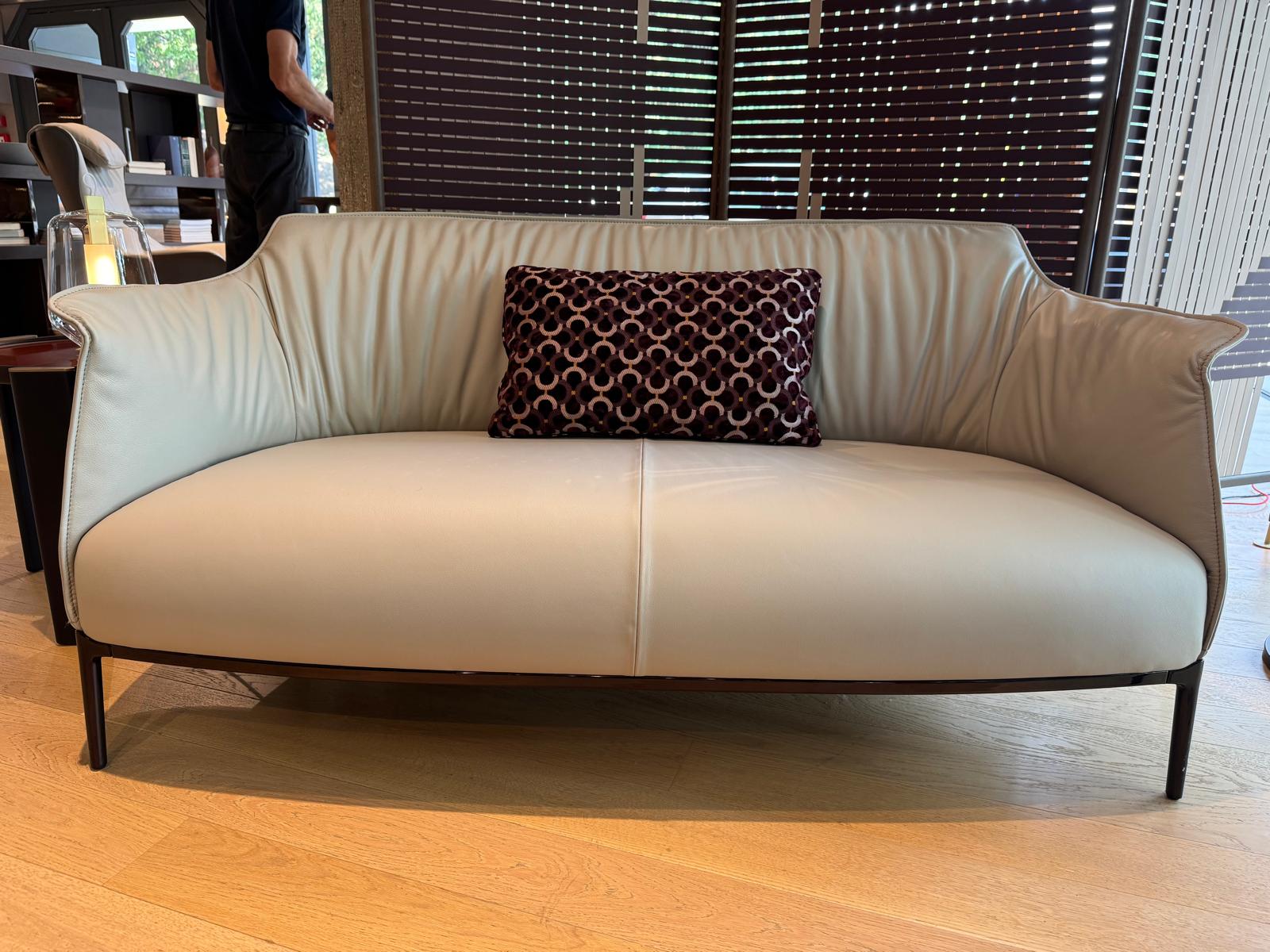 Il divano Archibald Sofa, di Poltrona Frau, è disponibile con rivestimento in Pelle FrauSC 31 Quarzo Fumè, con cuciture a contrasto. La struttura portante è in acciaio, mentre l’imbottitura è in poliuretano espanso, su cui è applicata ovatta poliestere nelle zone dove occorre offrire maggiore comfort.