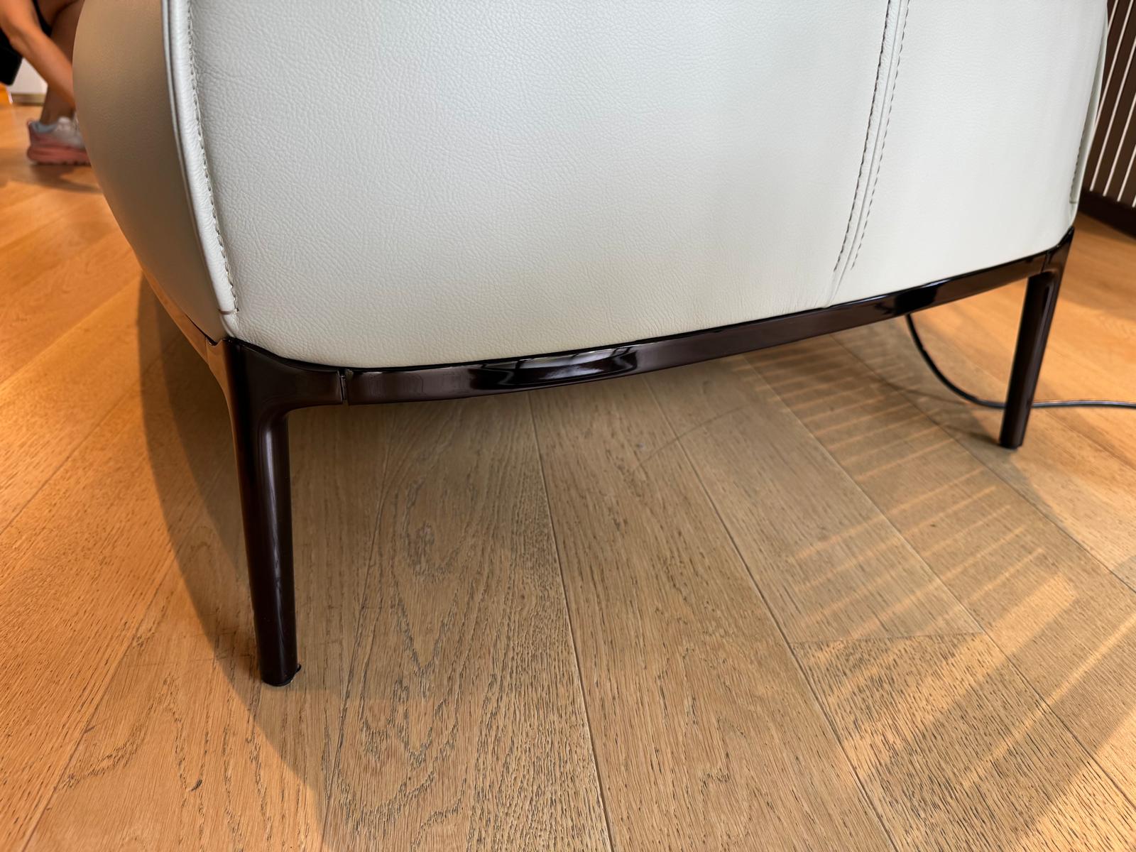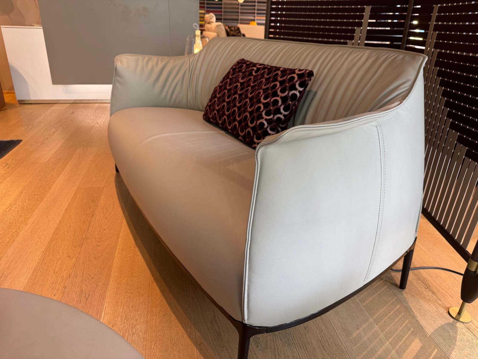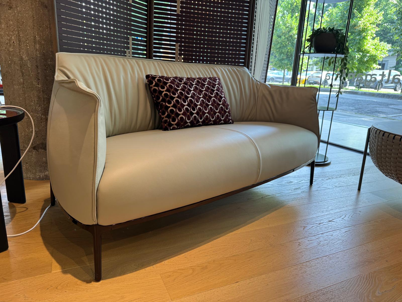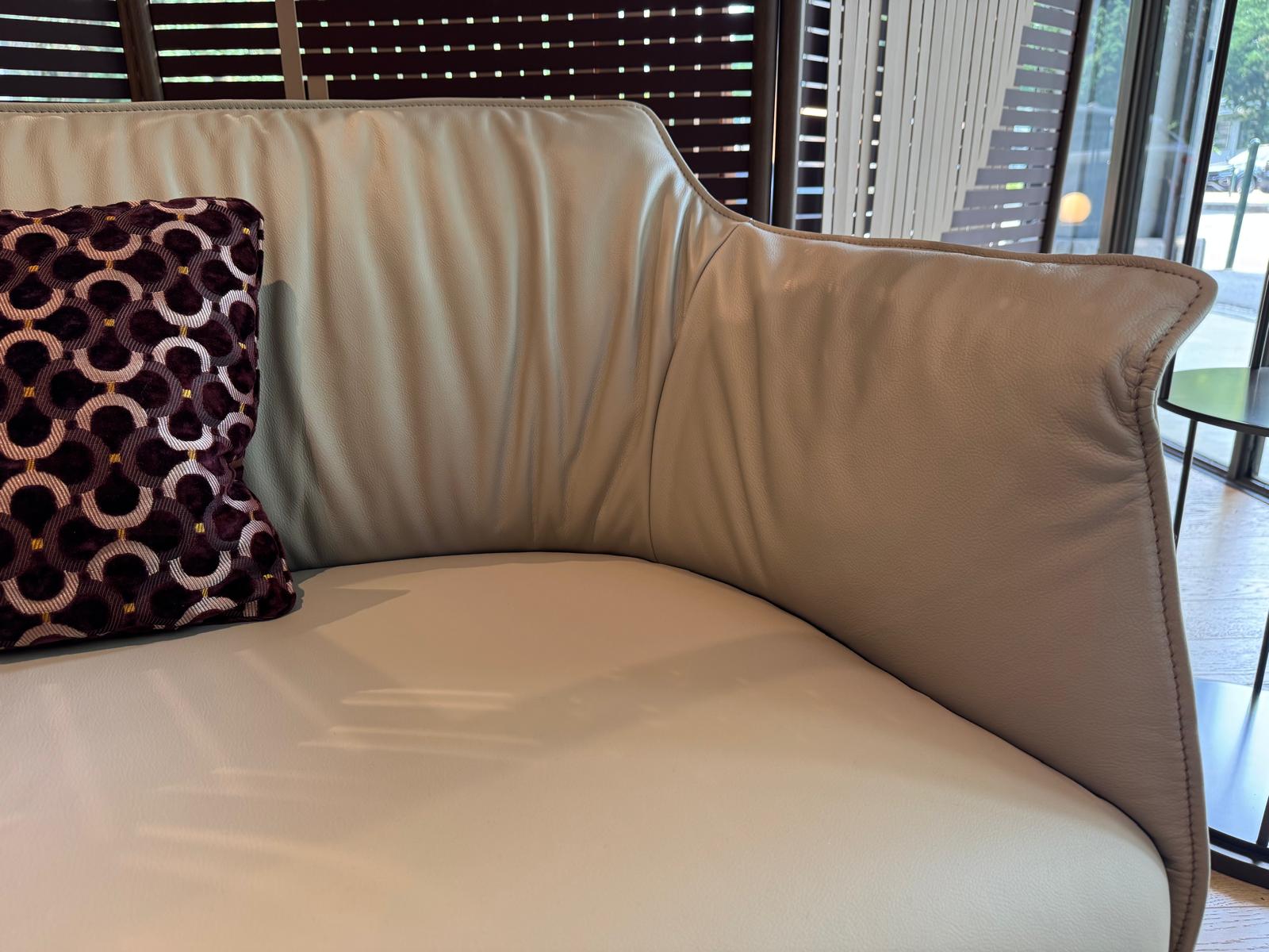 Il divano Archibald Sofa, di Poltrona Frau, è disponibile con rivestimento in Pelle FrauSC 31 Quarzo Fumè, con cuciture a contrasto. La struttura portante è in acciaio, mentre l’imbottitura è in poliuretano espanso, su cui è applicata ovatta poliestere nelle zone dove occorre offrire maggiore comfort.