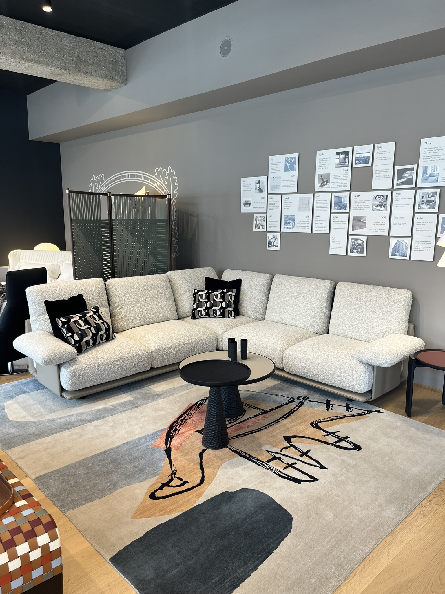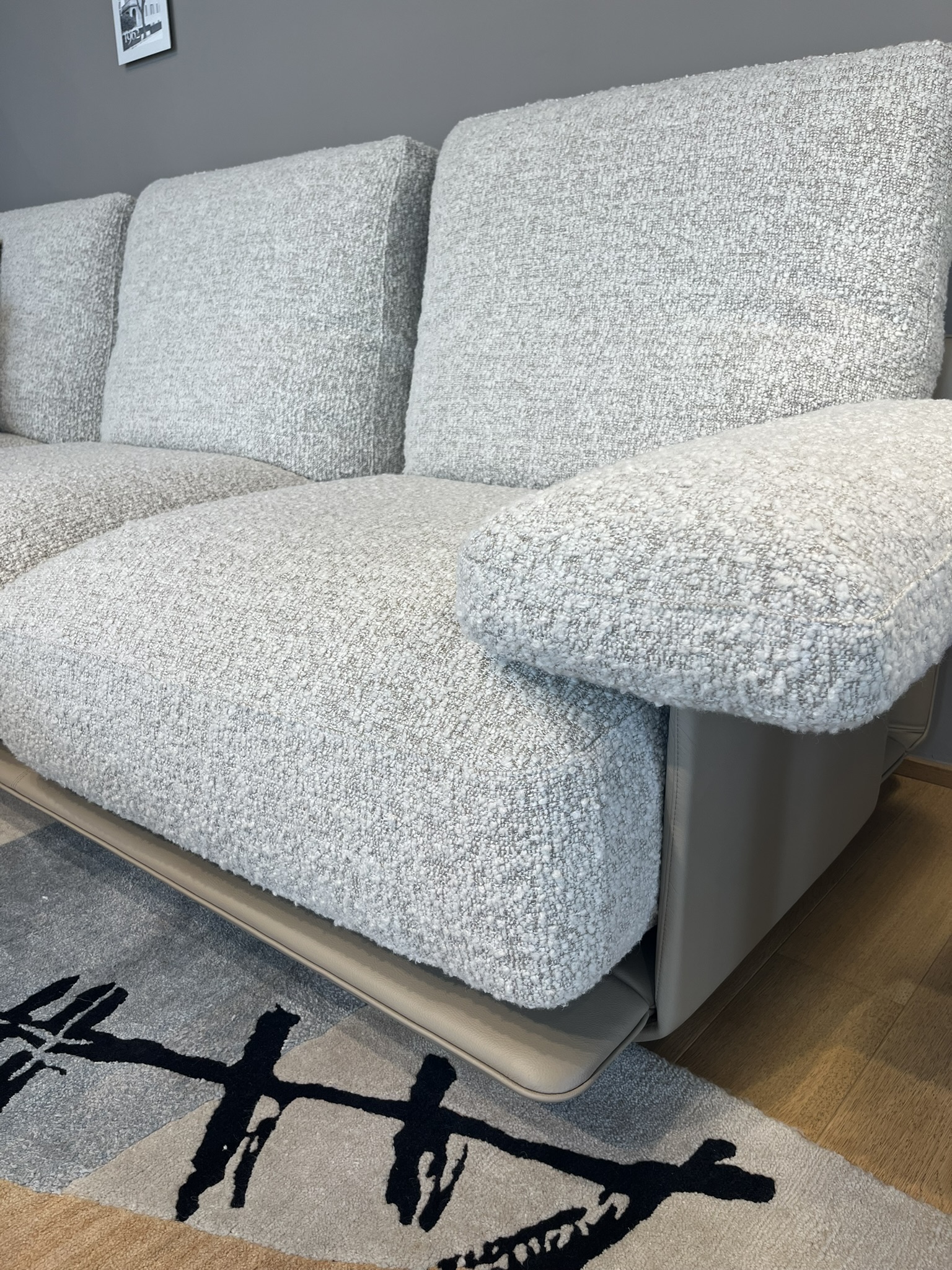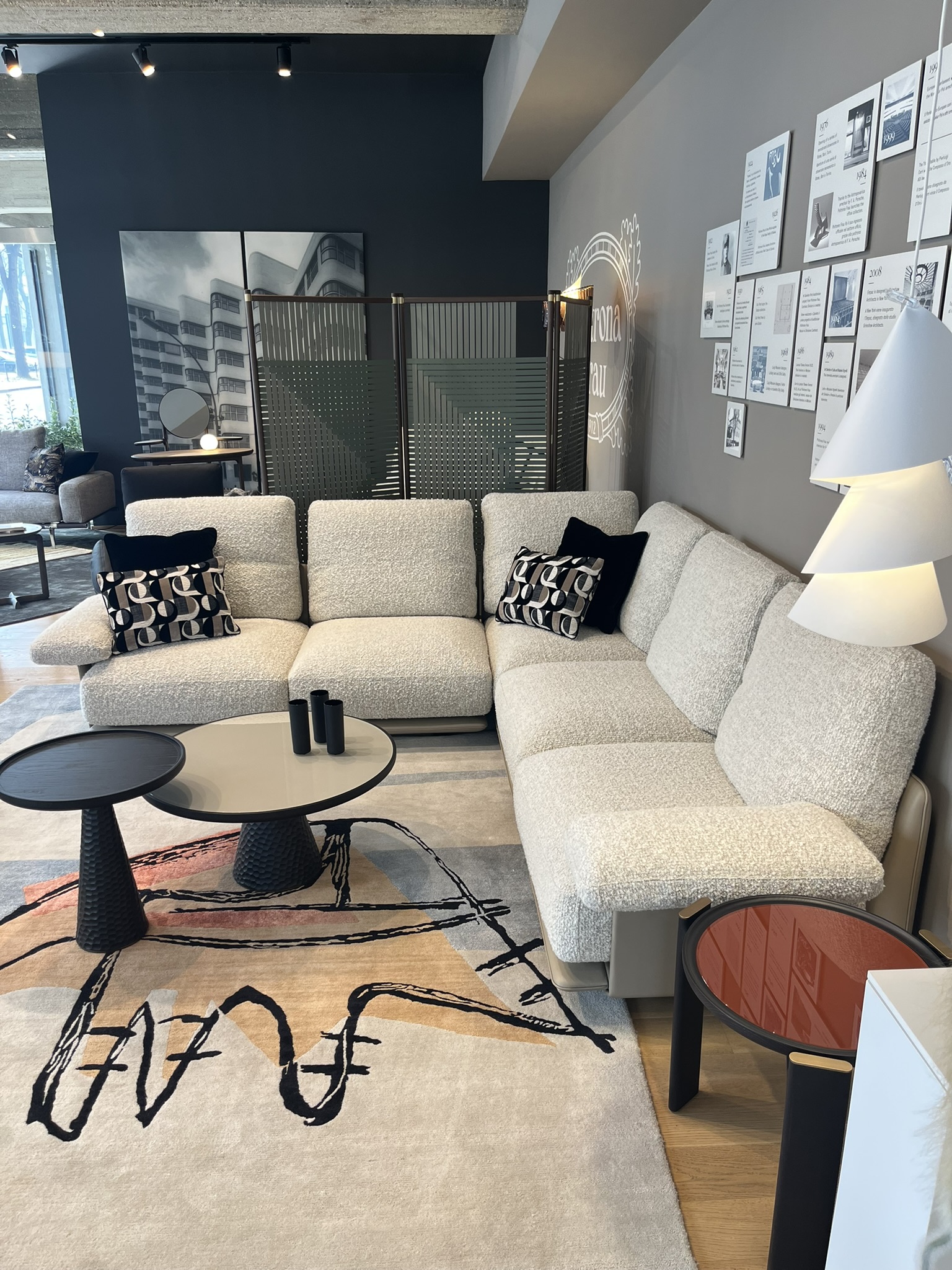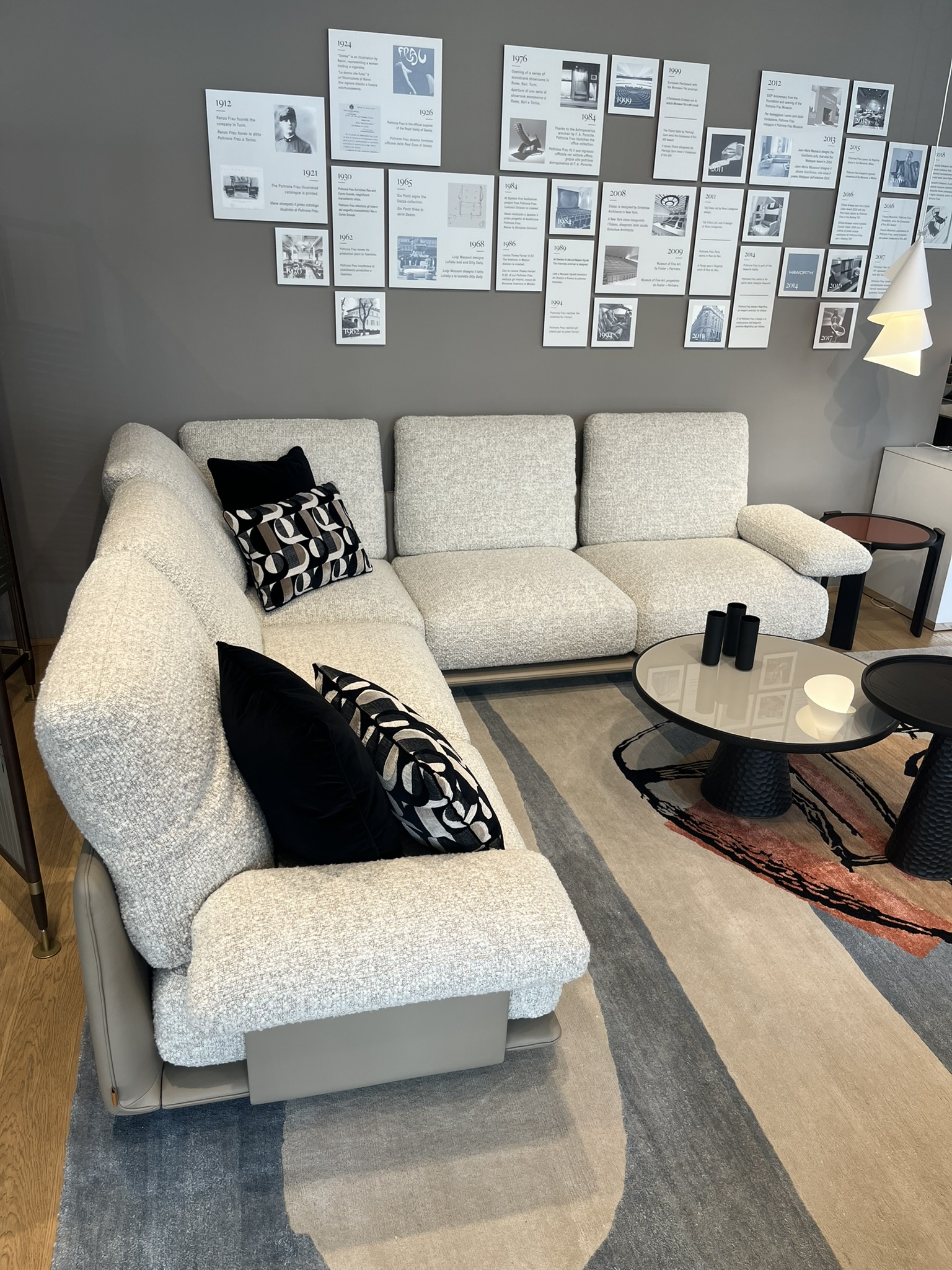 Divano Blisscape di Poltrona Frau, composizione 2 posti + 3 posti angolare con schienali reclinabili. I cuscini imbottiti in firm comfort sono rivestiti in tessuto Haruka Whity, mentre la struttura è rivestita in pelle SC 33-Travertino.
