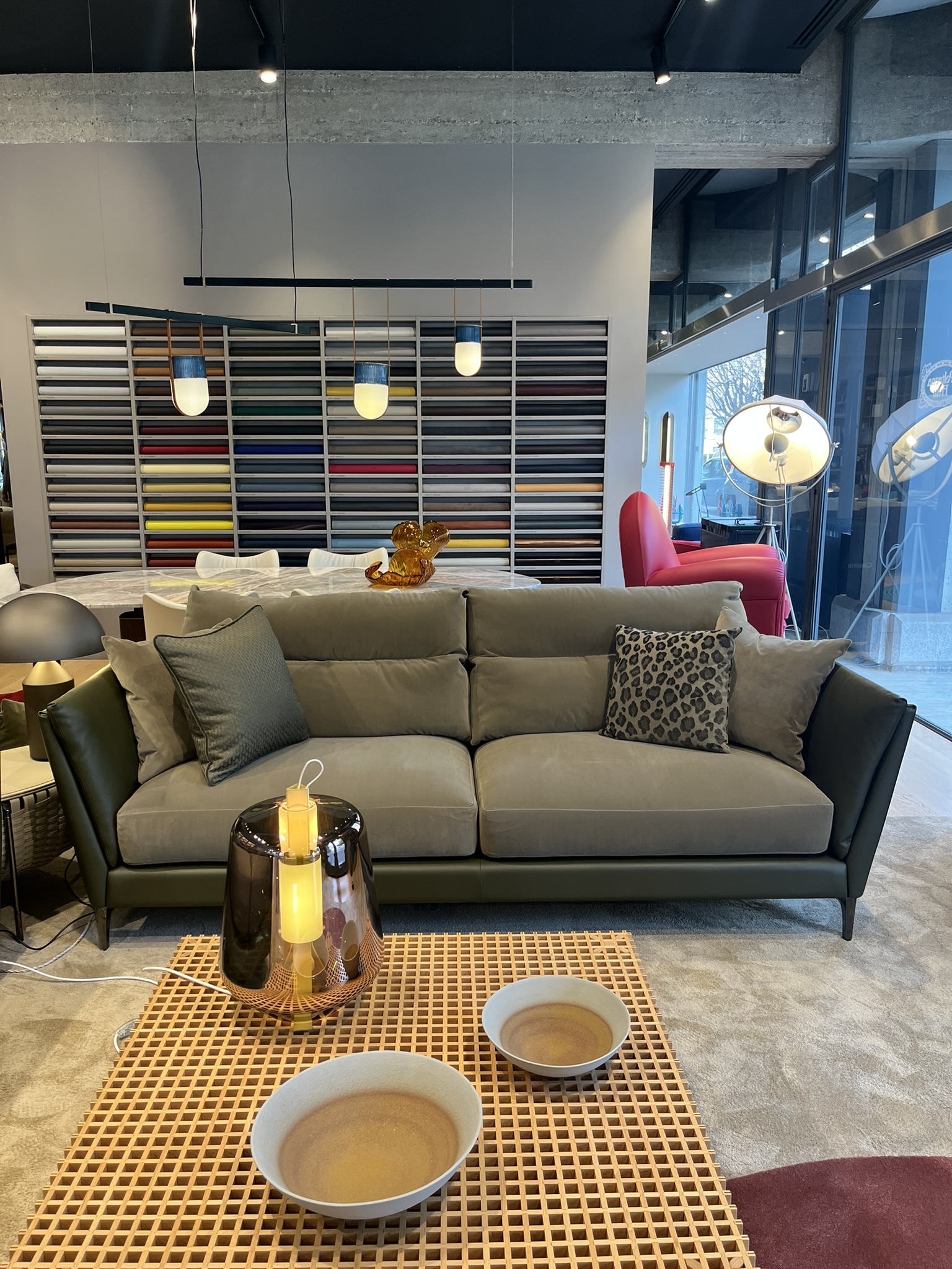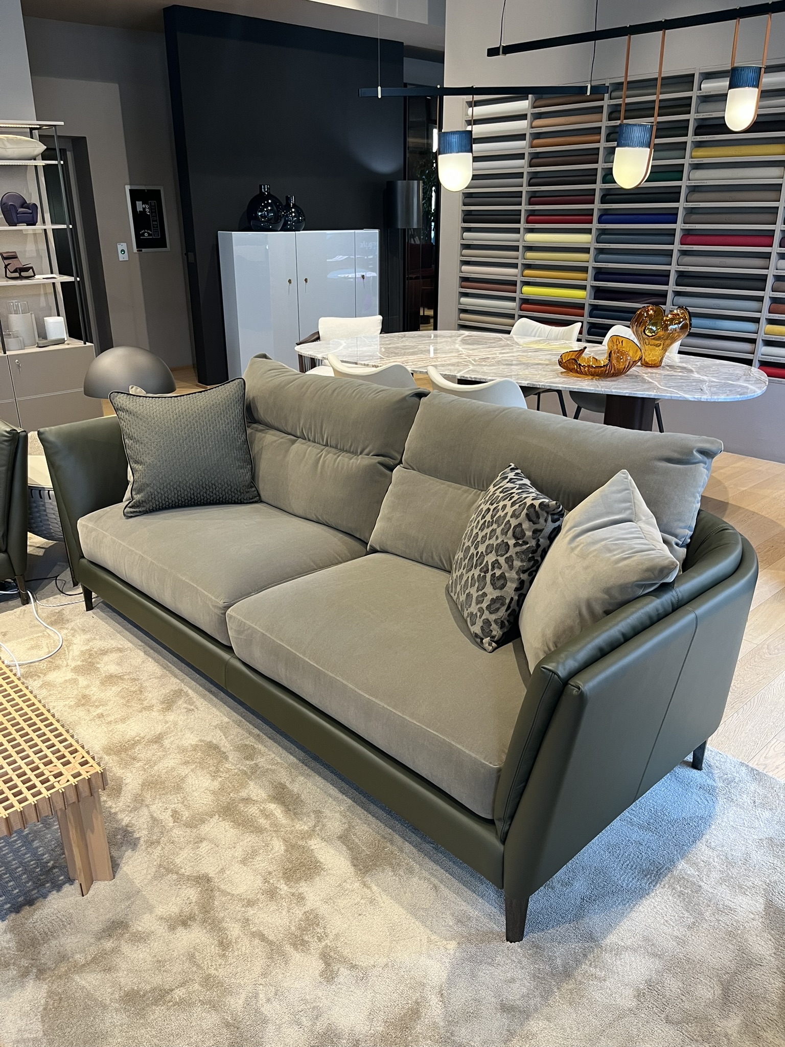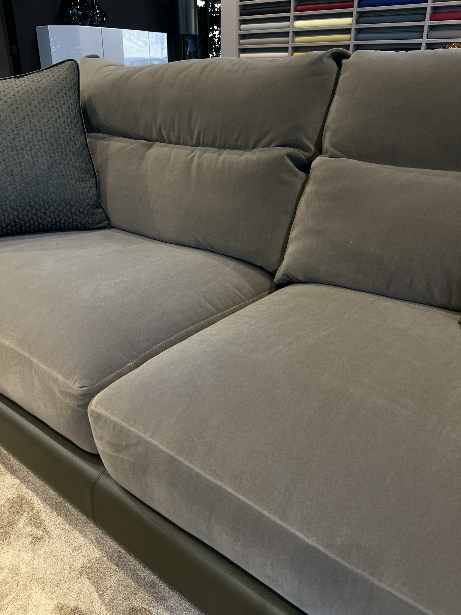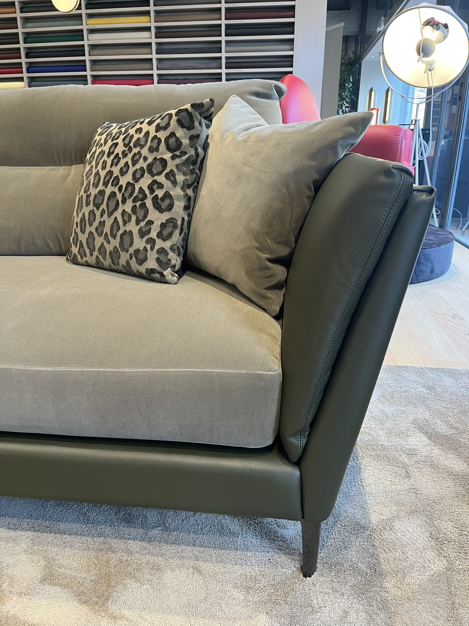 Divano 2 posti large Bretagne Gran Comfort di Poltrona Frau con cuscini imbottiti in firm rivestiti in velluto Ziggy col. Olive Drab, e struttura rivestita in pelle SC 177-Limo. Le dimensioni del divano sono di cm 241x101xH92.