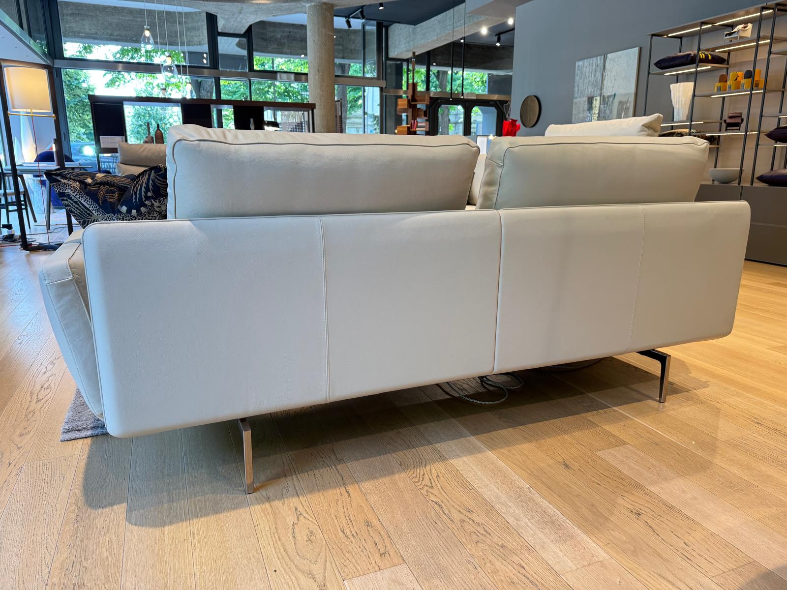 Il divano Get Back a due posti, di Poltrona Frau, è rivestito in Pelle Frau SC 05 Stucco e imbottito in poliuretano espanso. È accompagnato da un comodo poggiatesta, anche lui rivestito in Pelle Frau SC e imbottito in piuma d’oca.