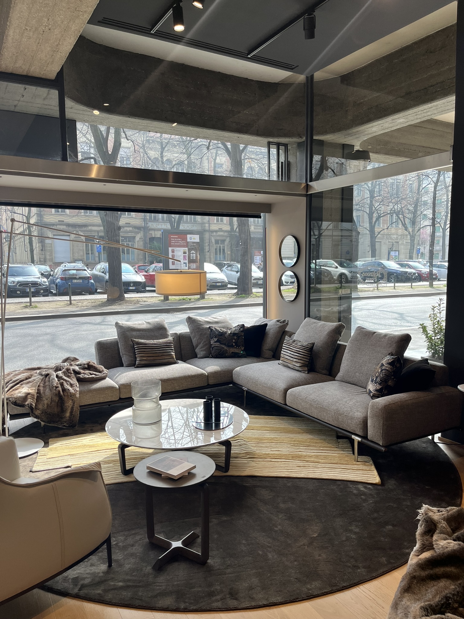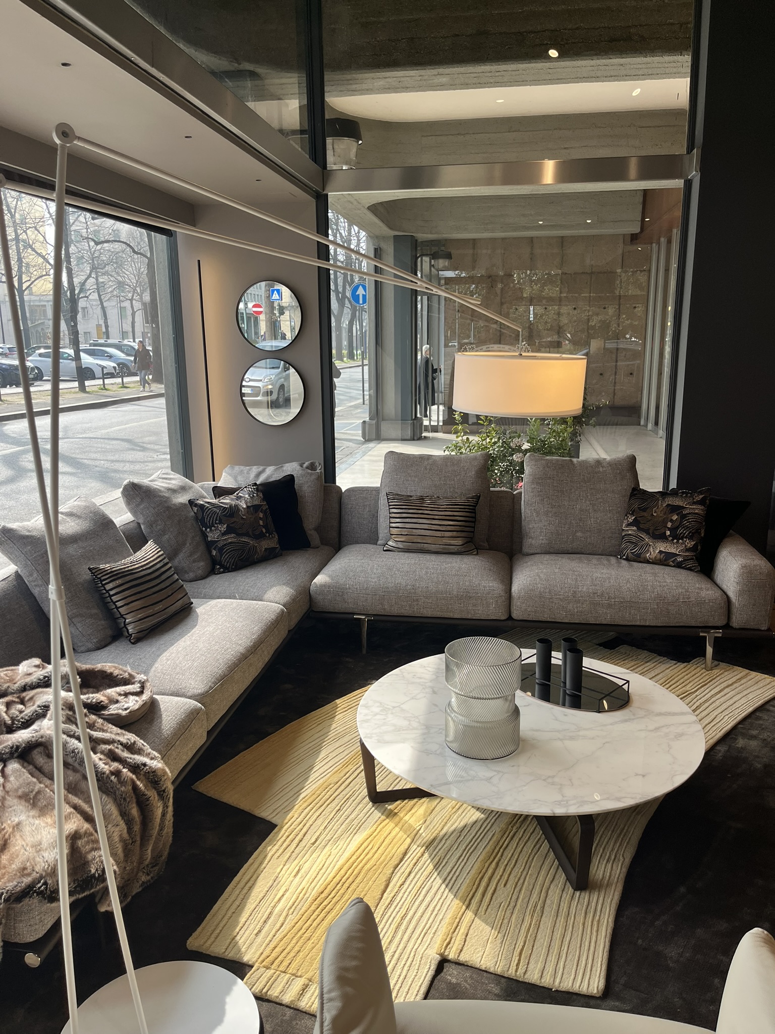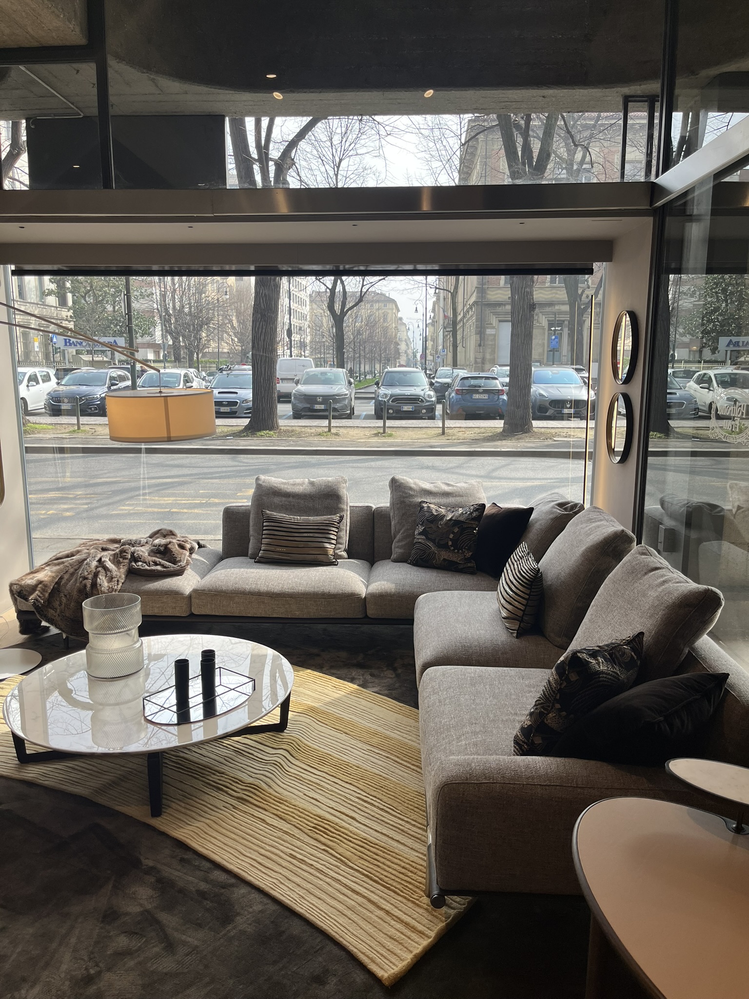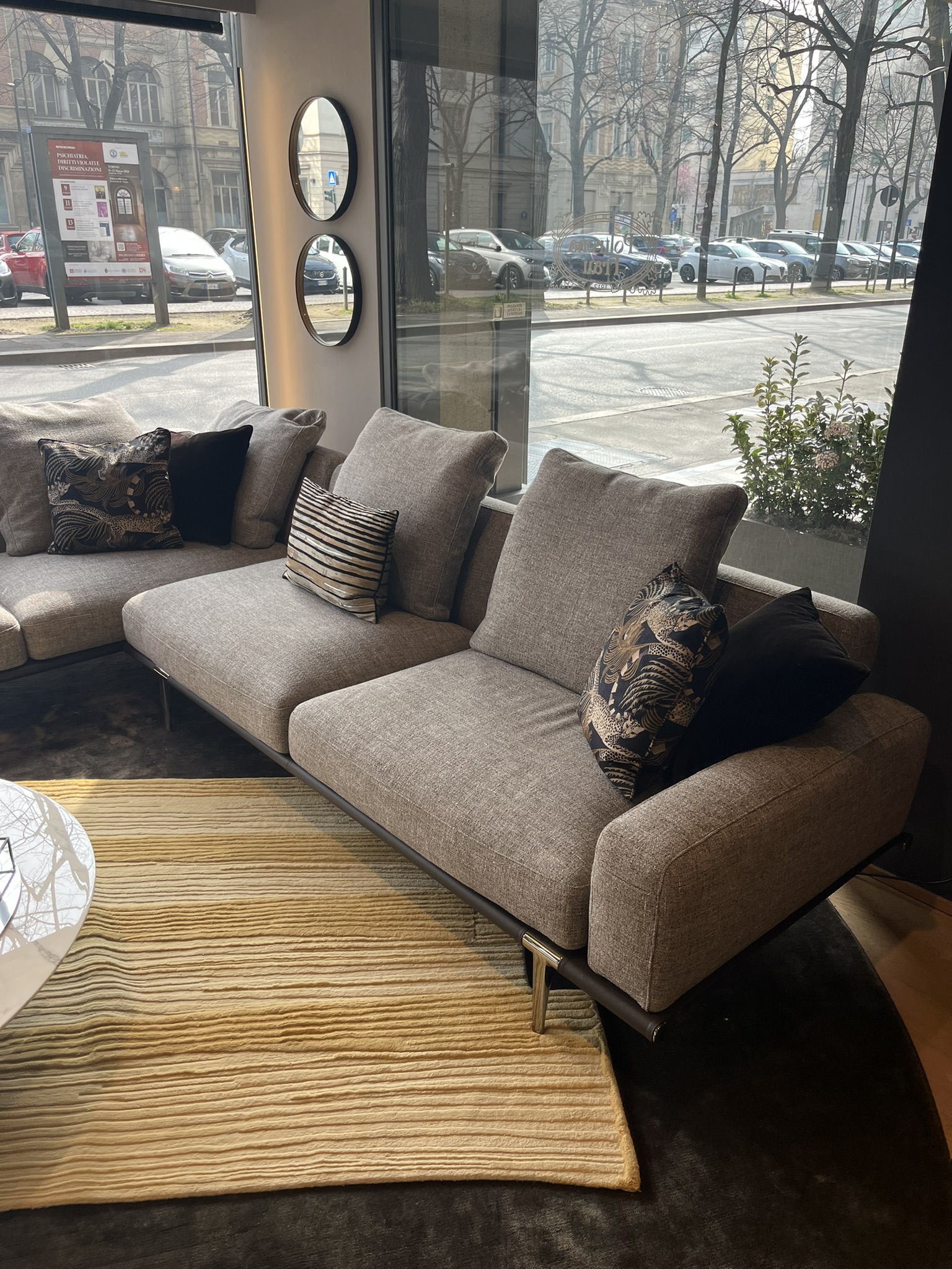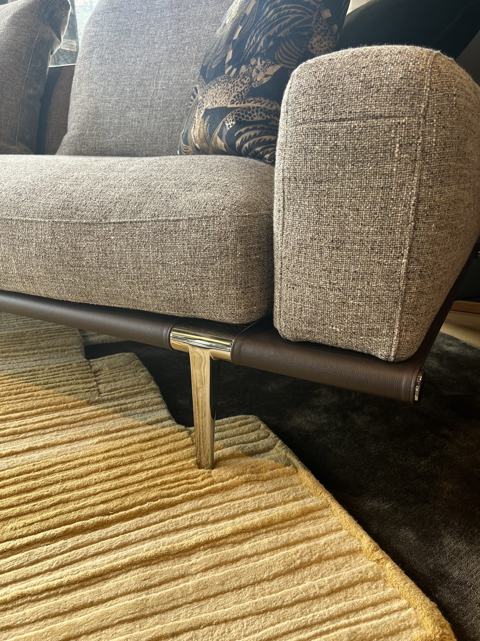 Composizione divano 2 posti large angolare con panca a sinistra e divano 2 posti large con bracciolo basso terminale destro e n.5 cuscini schienale cm 65×65. I piedi sono di altezza cm 22 in acciaio finitura Ruthenium, la base è rivestita in pelle SC 80-Bruno Havana mentre i cuscini in tessuto Solstice Peppercorn. Le dimensioni del divano sono di cm 334×339.