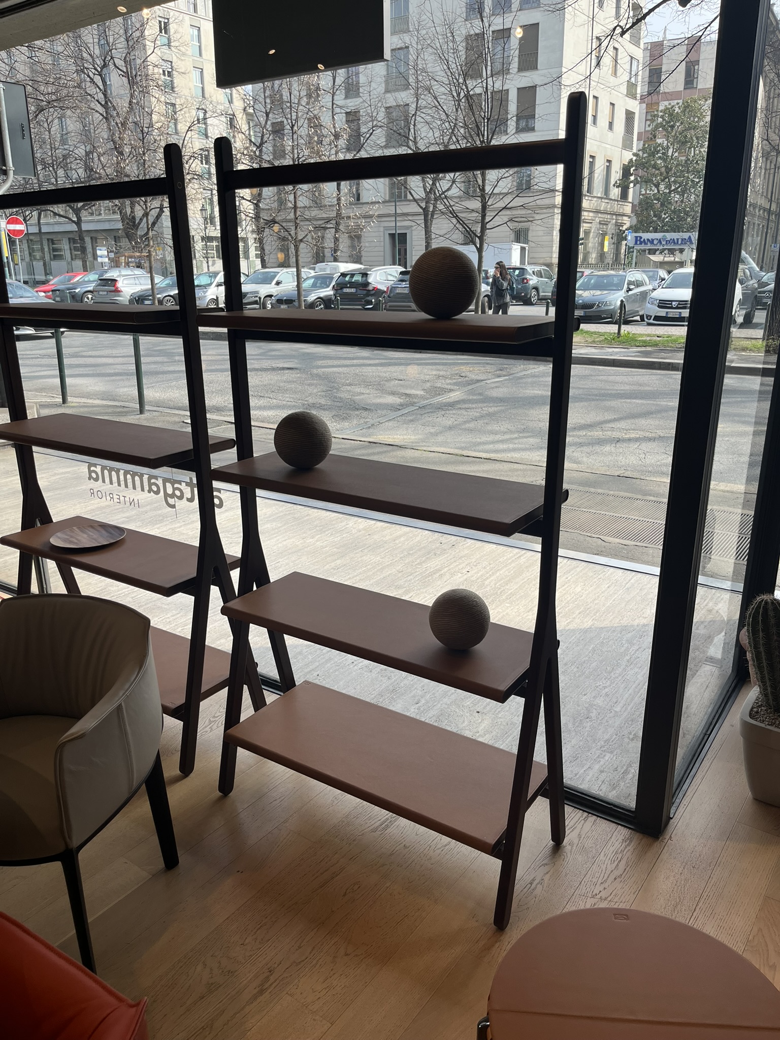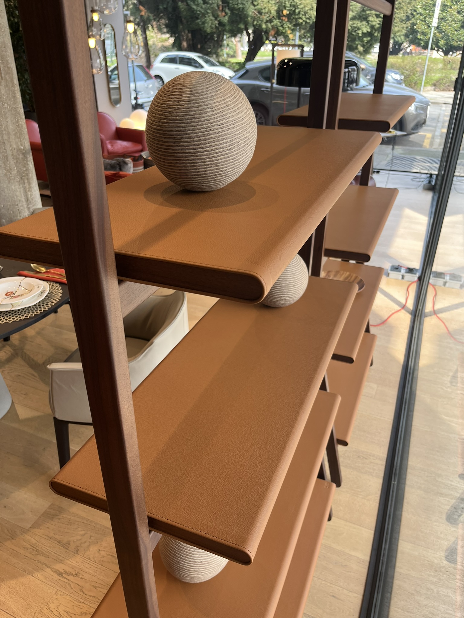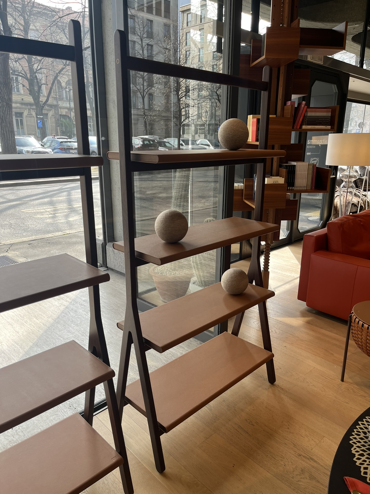 Libreria autoportante verticale Ren di Poltrona Frau, con struttura portante in Noce canaletto e ripiani rivestiti in pelle SC 66-India. Le dimensioni della libreria sono di cm 98x49xH188.
