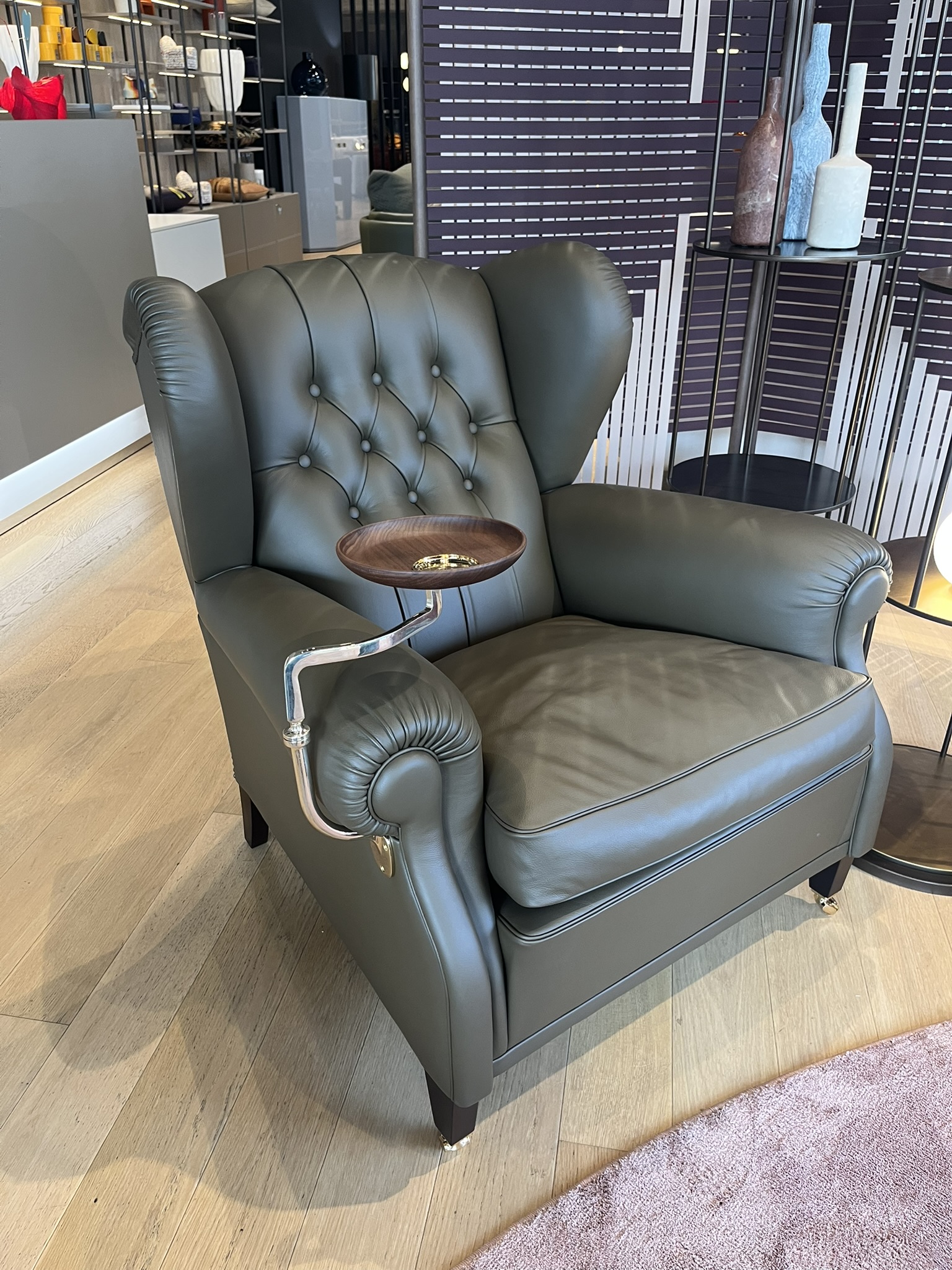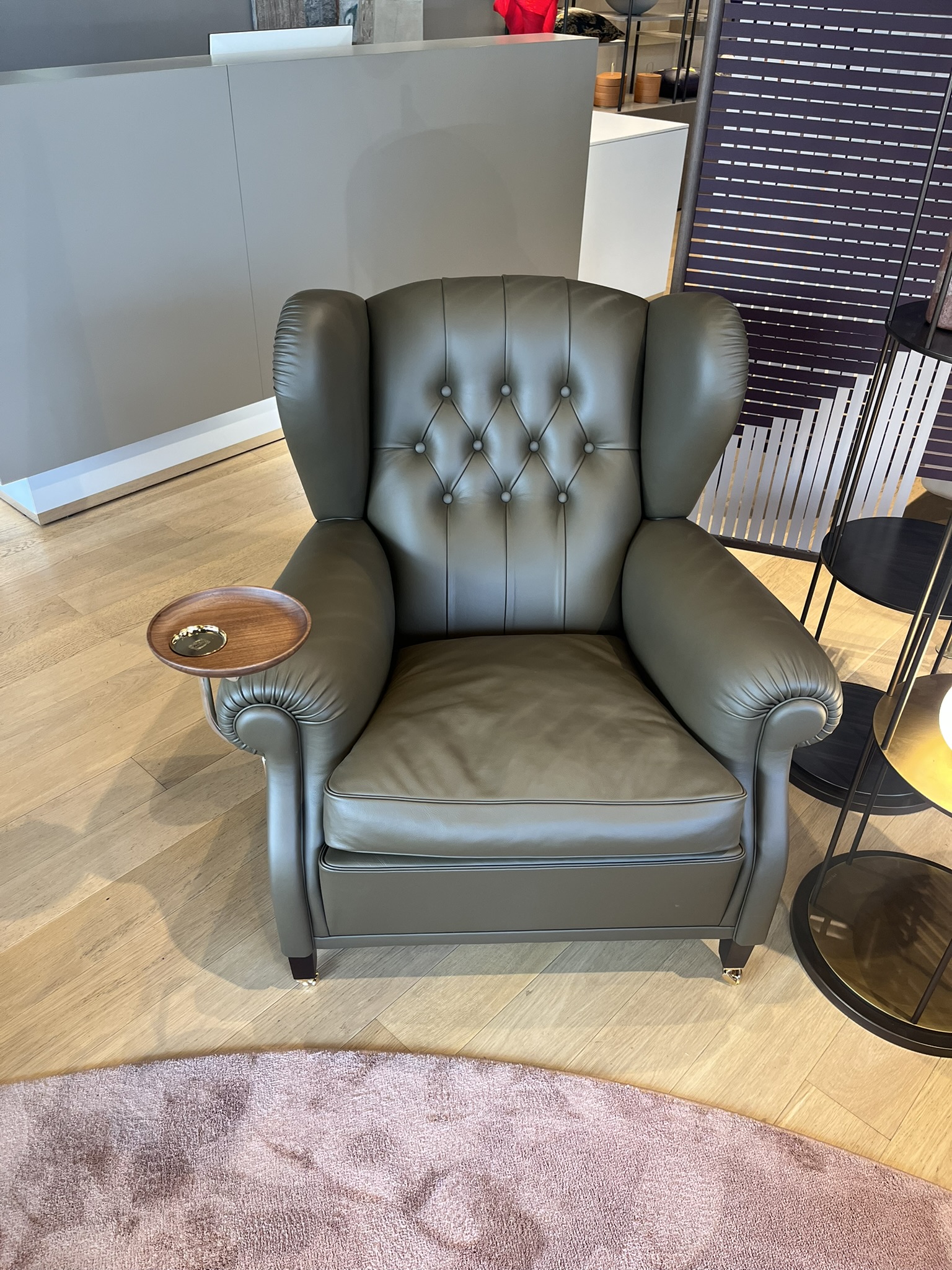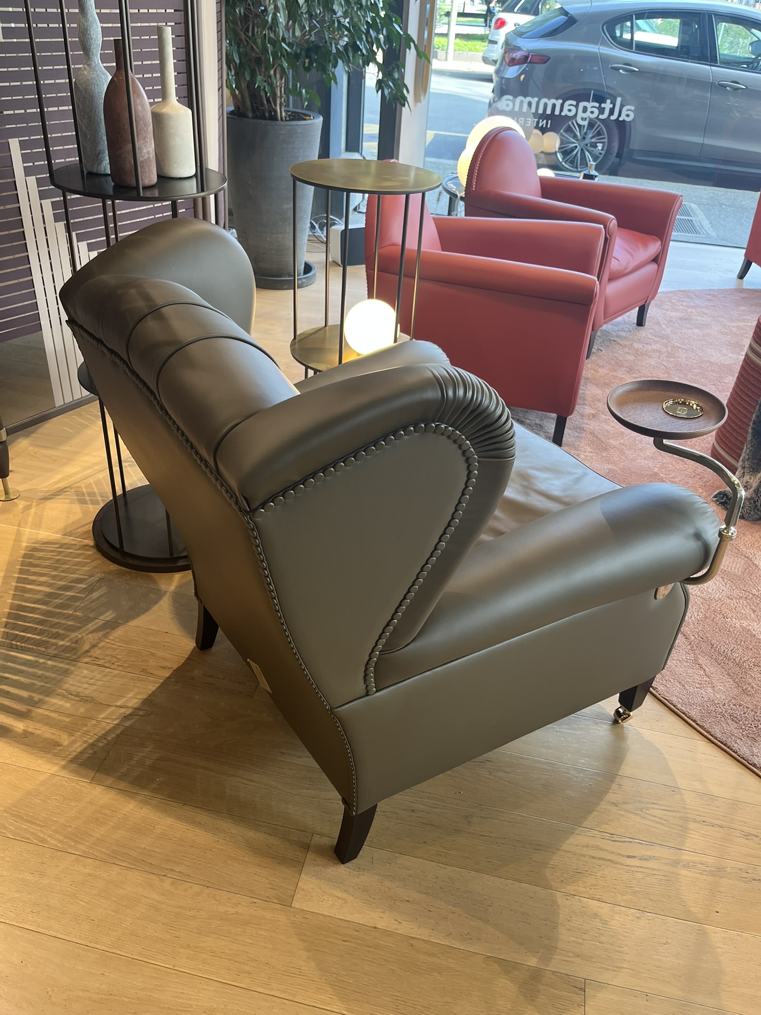 Poltrona 1919 di Poltrona Frau con piattino a sinistra e rotelle, rivestimento in pelle SC 179-Brughiera. Le parti metalliche sono in finitura dorata e i piedi in legno di faggio noce scuro. Le dimensioni della poltrona sono di cm 90x90xH93.