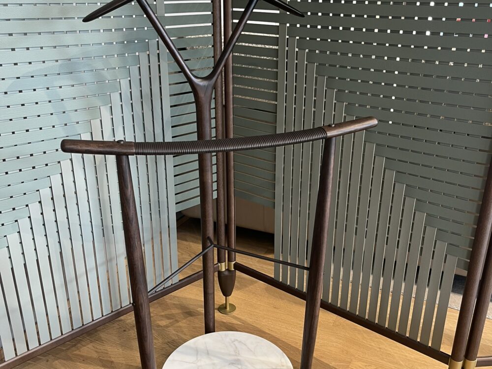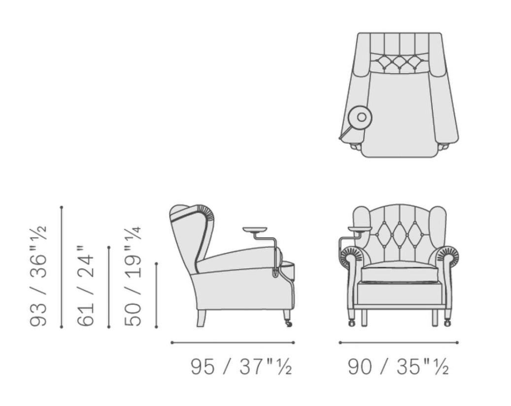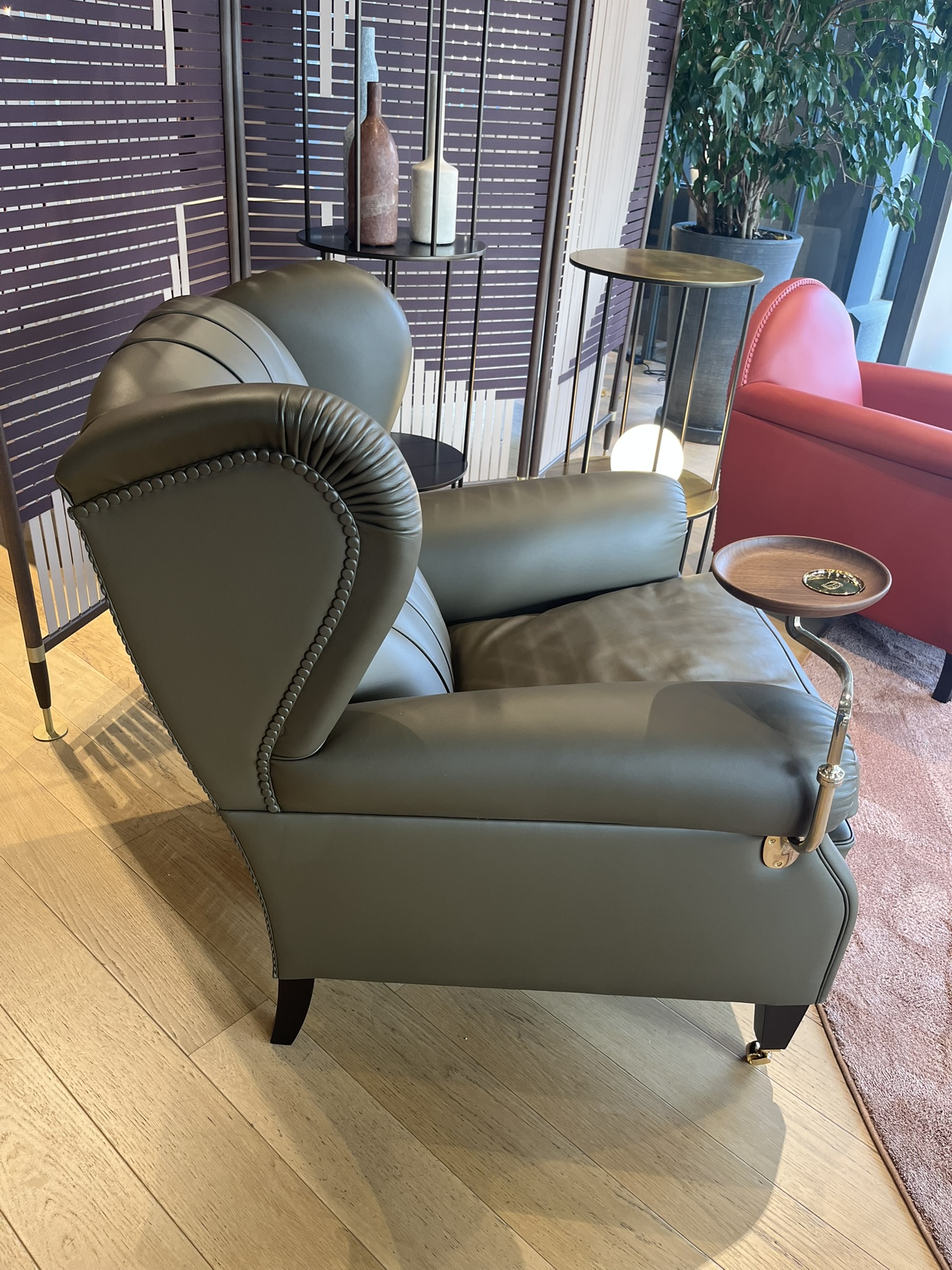 Poltrona 1919 di Poltrona Frau con piattino a sinistra e rotelle, rivestimento in pelle SC 179-Brughiera. Le parti metalliche sono in finitura dorata e i piedi in legno di faggio noce scuro. Le dimensioni della poltrona sono di cm 90x90xH93.