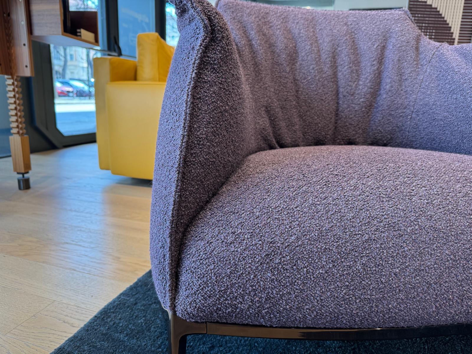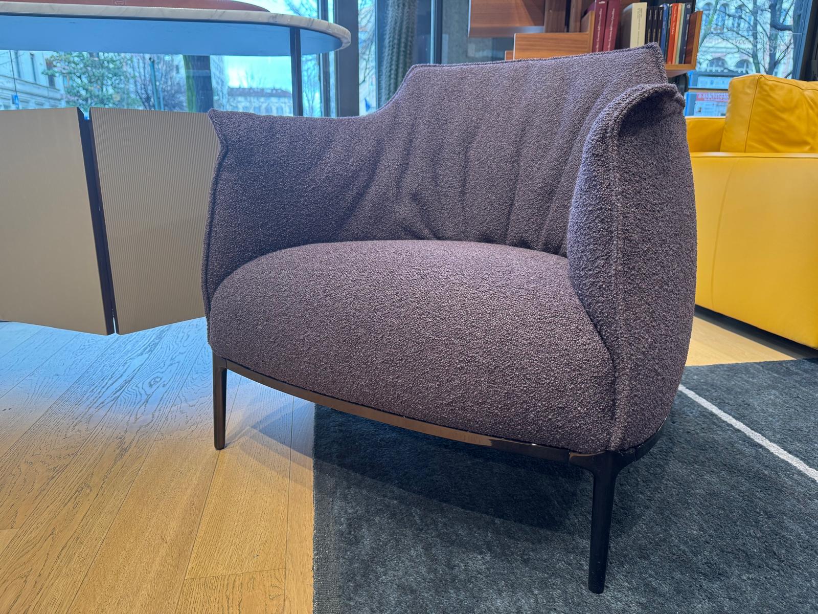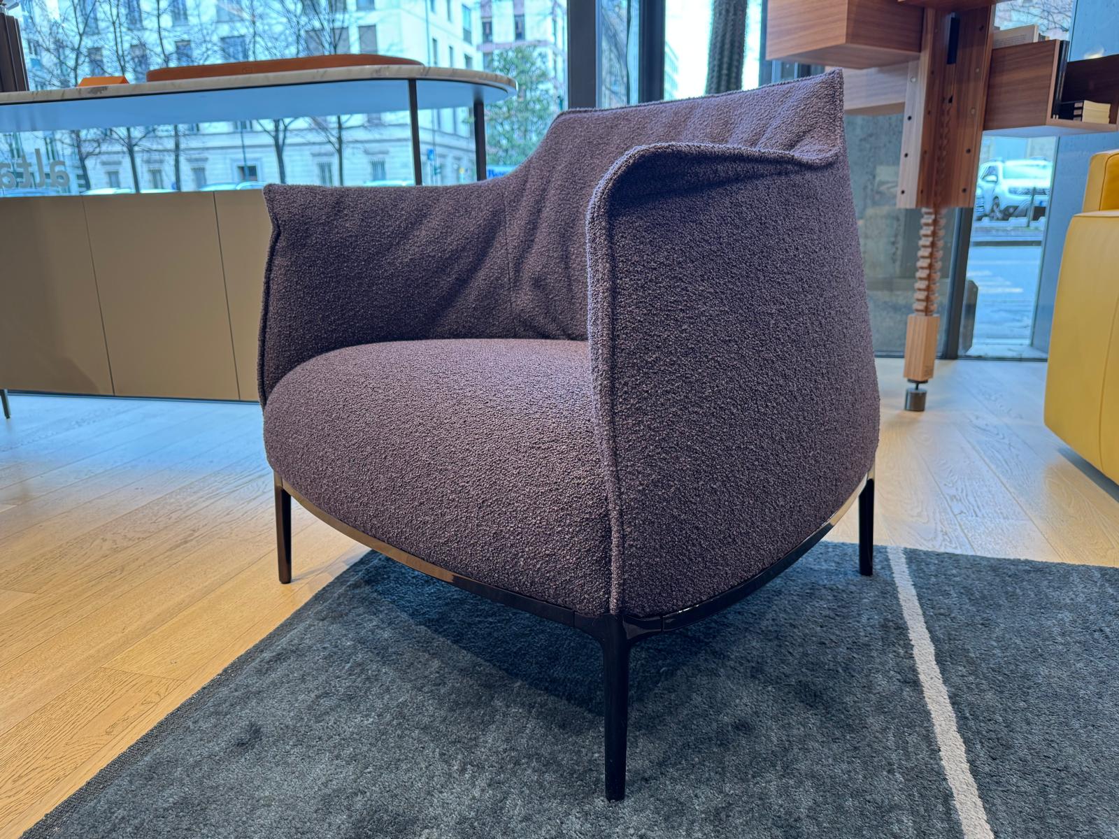 Poltrona Archibald, di Poltrona Frau, rivestita in tessuto Loop color Prugna e con struttura in acciaio. La struttura in acciaio della poltrona garantisce solidità, mentre l’imbottitura in poliuretano espanso e ovatta poliestere offre un’accoglienza soffice e avvolgente. I quattro piedi in alluminio donano alla Archibald leggerezza visiva e un’eleganza slanciata, rendendola perfetta in qualsiasi ambiente raffinato.