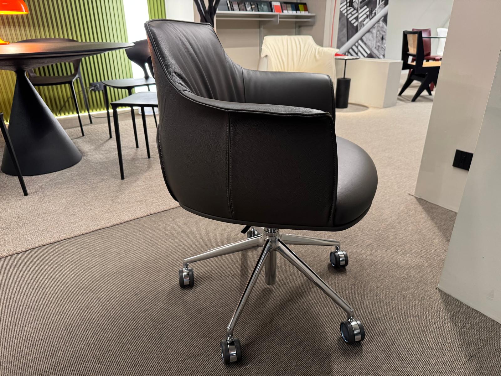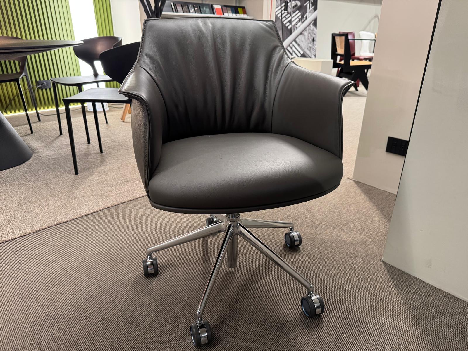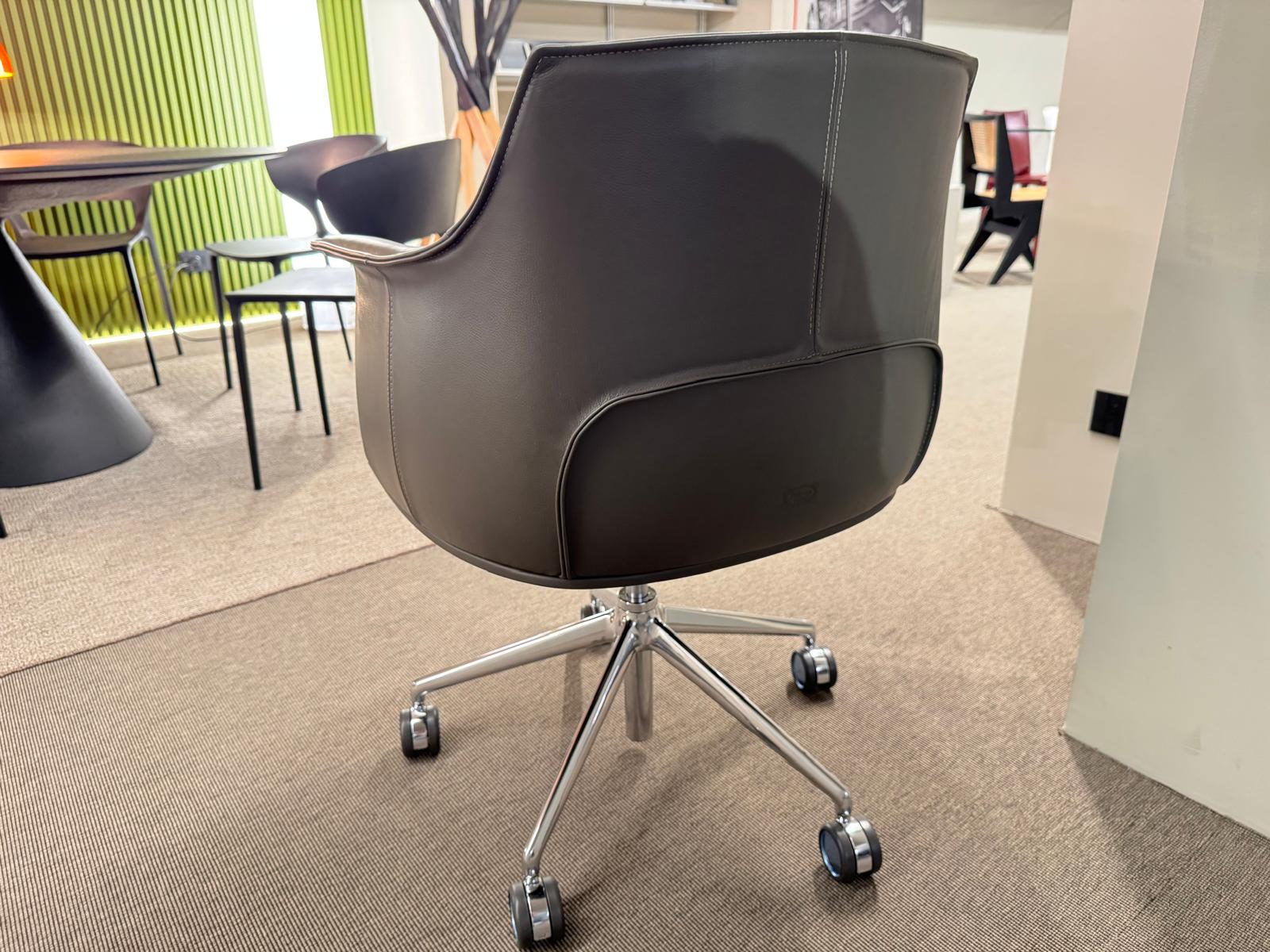 La poltrona Archibald Task, di Poltrona Frau, nel modello Mnagerial con altezza regolabile è disponibile in Pelle Frau SC 28 color Seppia e con base in alluminio dotata di meccanismo girevole.