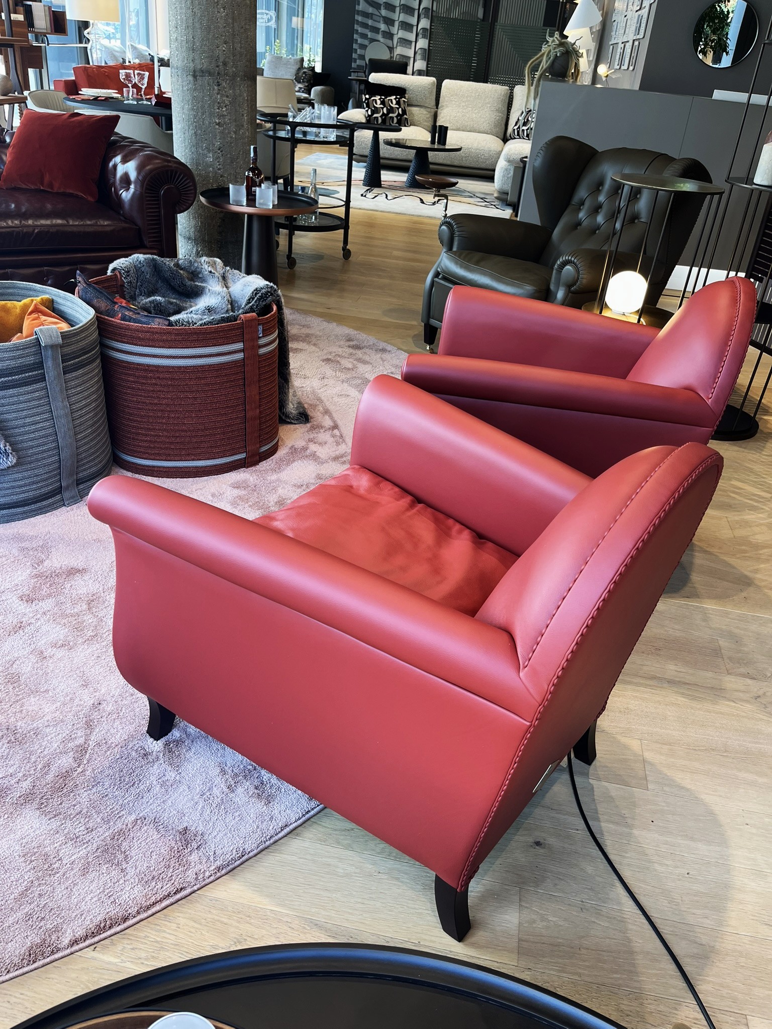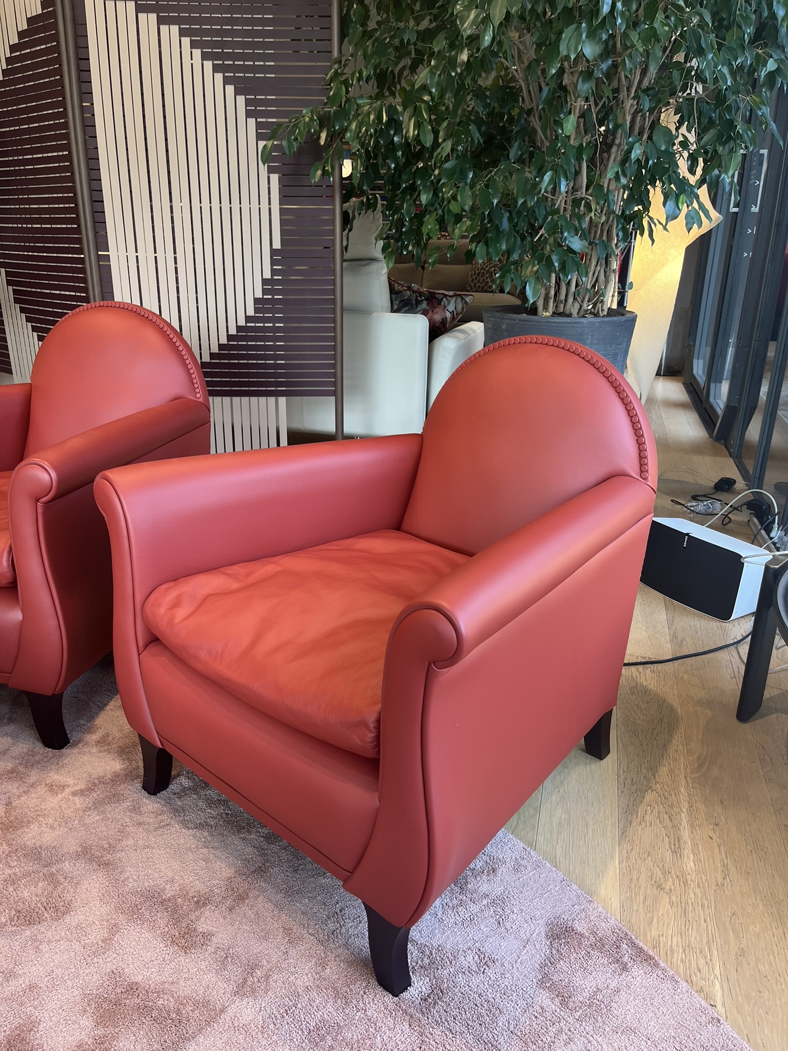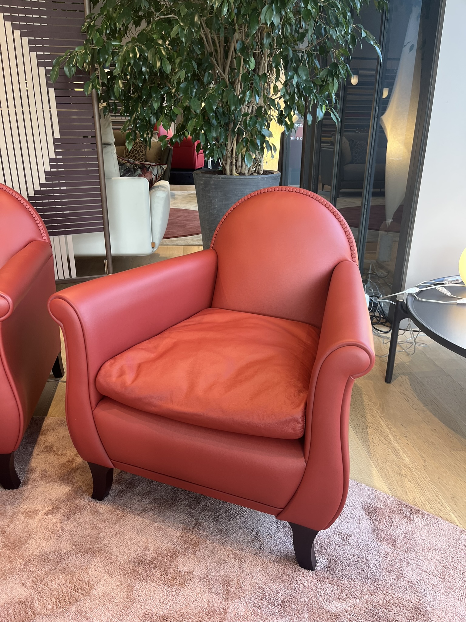 Poltrona Lyra di Poltrona Frau, rivestita in pelle SC 148-Lacca e piedi in faggio noce scuro. La struttura portante della poltrona Lyra è in faggio stagionato. Il molleggio di sedile e schienale è ottenuto grazie a molle biconiche in acciaio legate a mano e fissate a cinghie di juta. L’imbottitura è in crine gommato, e in morbida piuma d’oca per il cuscino della seduta. Le dimensioni sono di cm 77x79xH80.