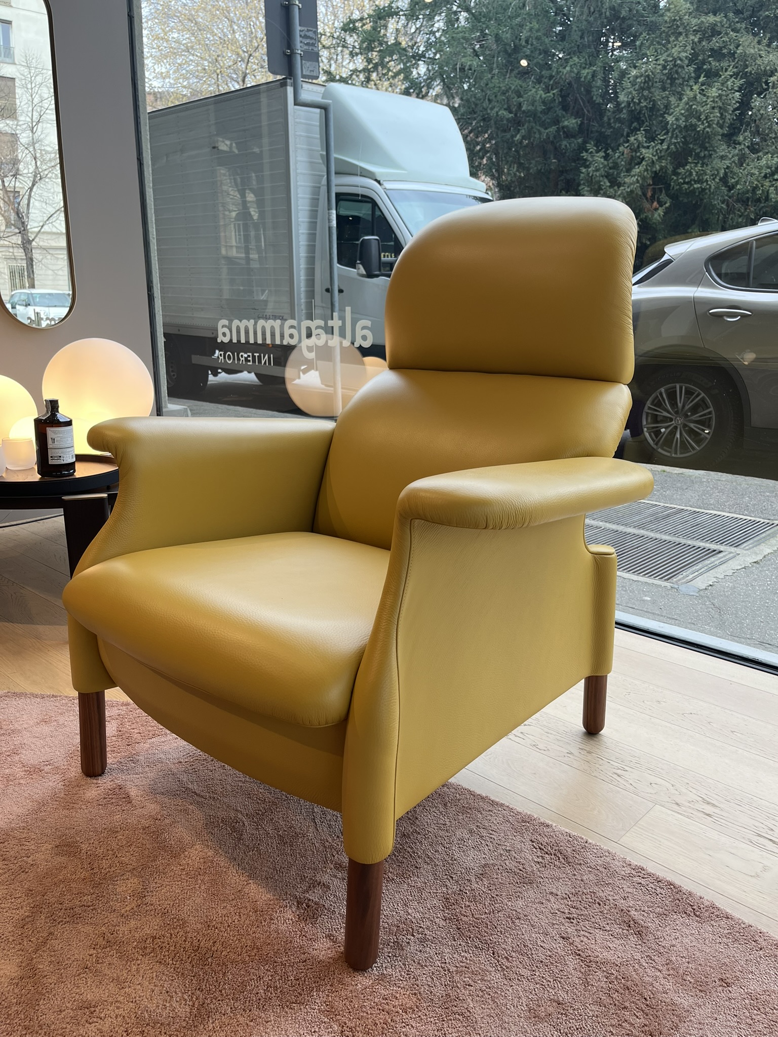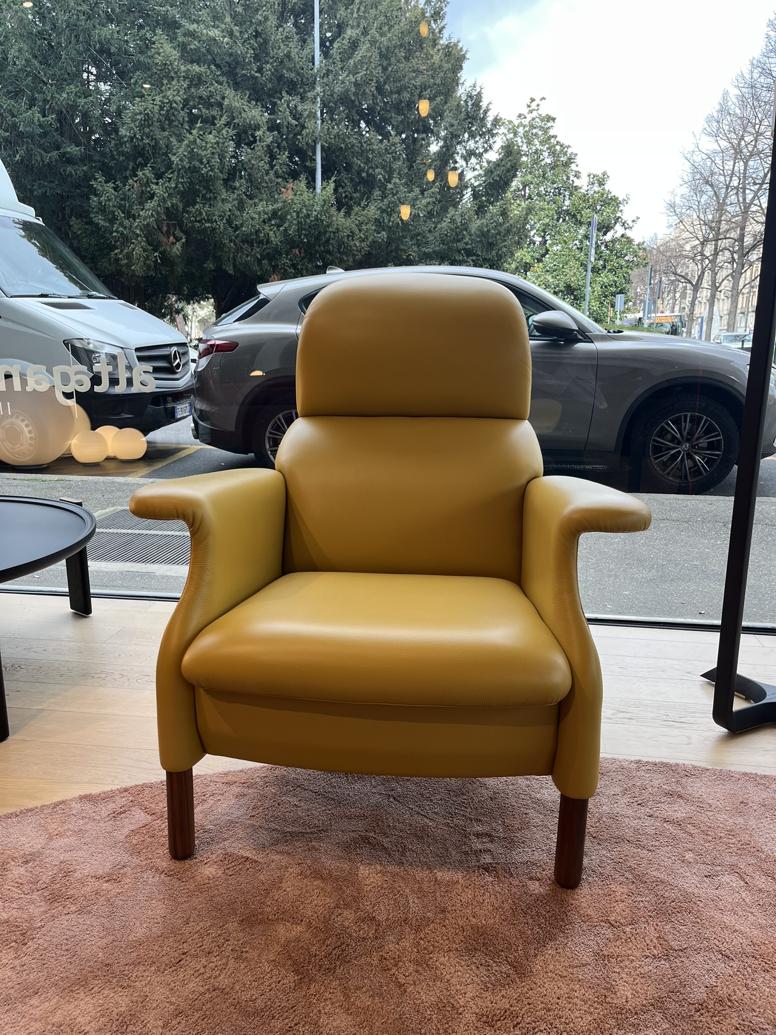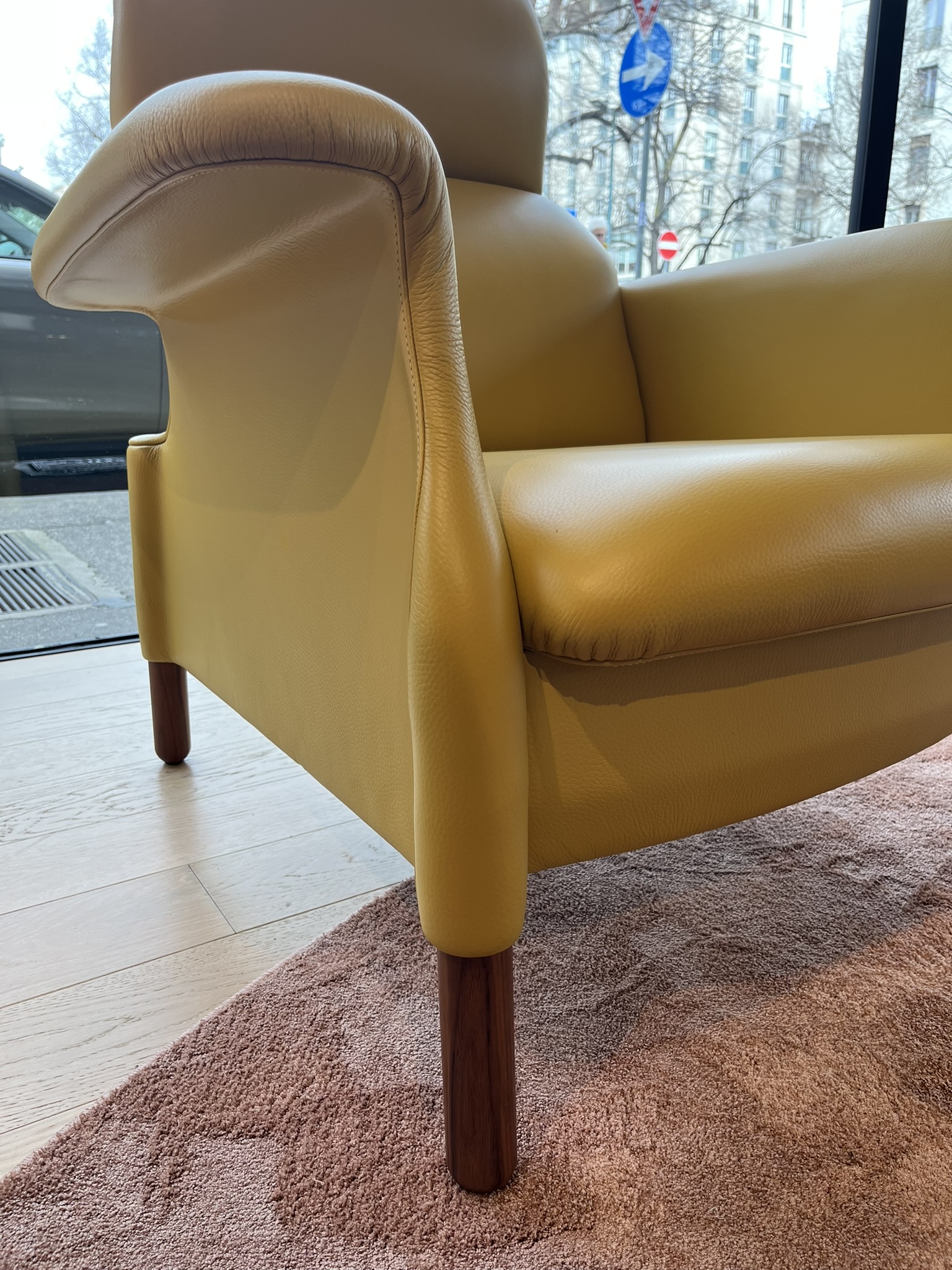 Poltrona Sanluca di Poltrona Frau, con piedi in noce canaletto e rivestimento in pelle Nest Ambra. La struttura della poltrona Sanluca è composta da una serie di elementi in legno multistrato di betulla e masselli di faggio e pioppo. L’imbottitura è in poliuretano espanso da blocco con gradi di densità differenti. Le dimensioni della poltrona sono di cm 85x98xH99.
