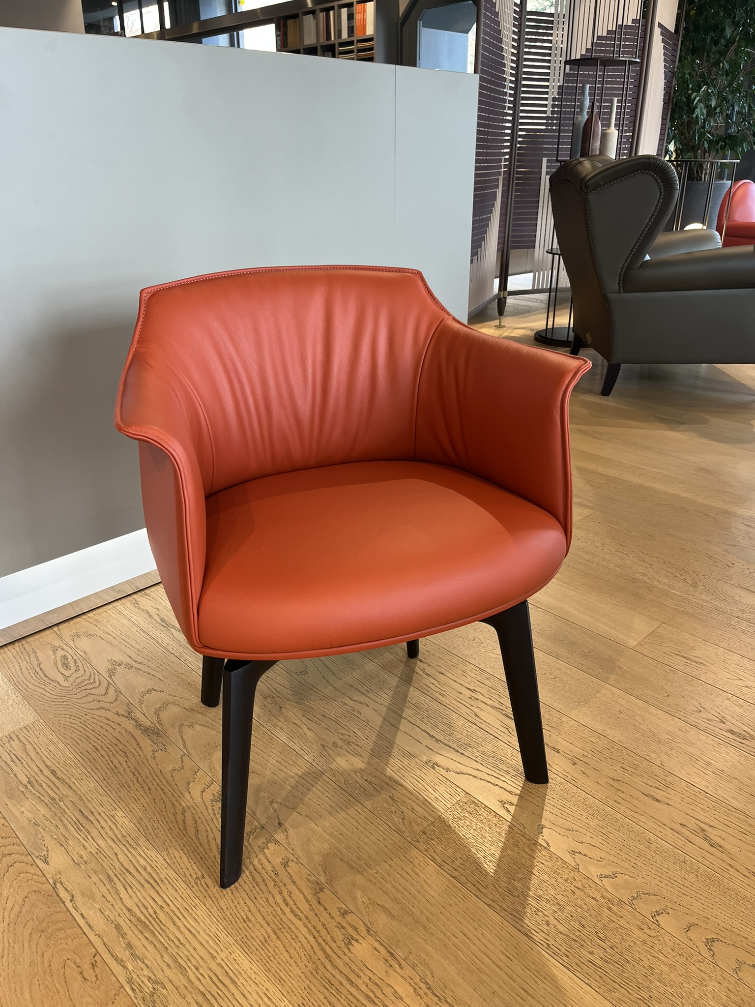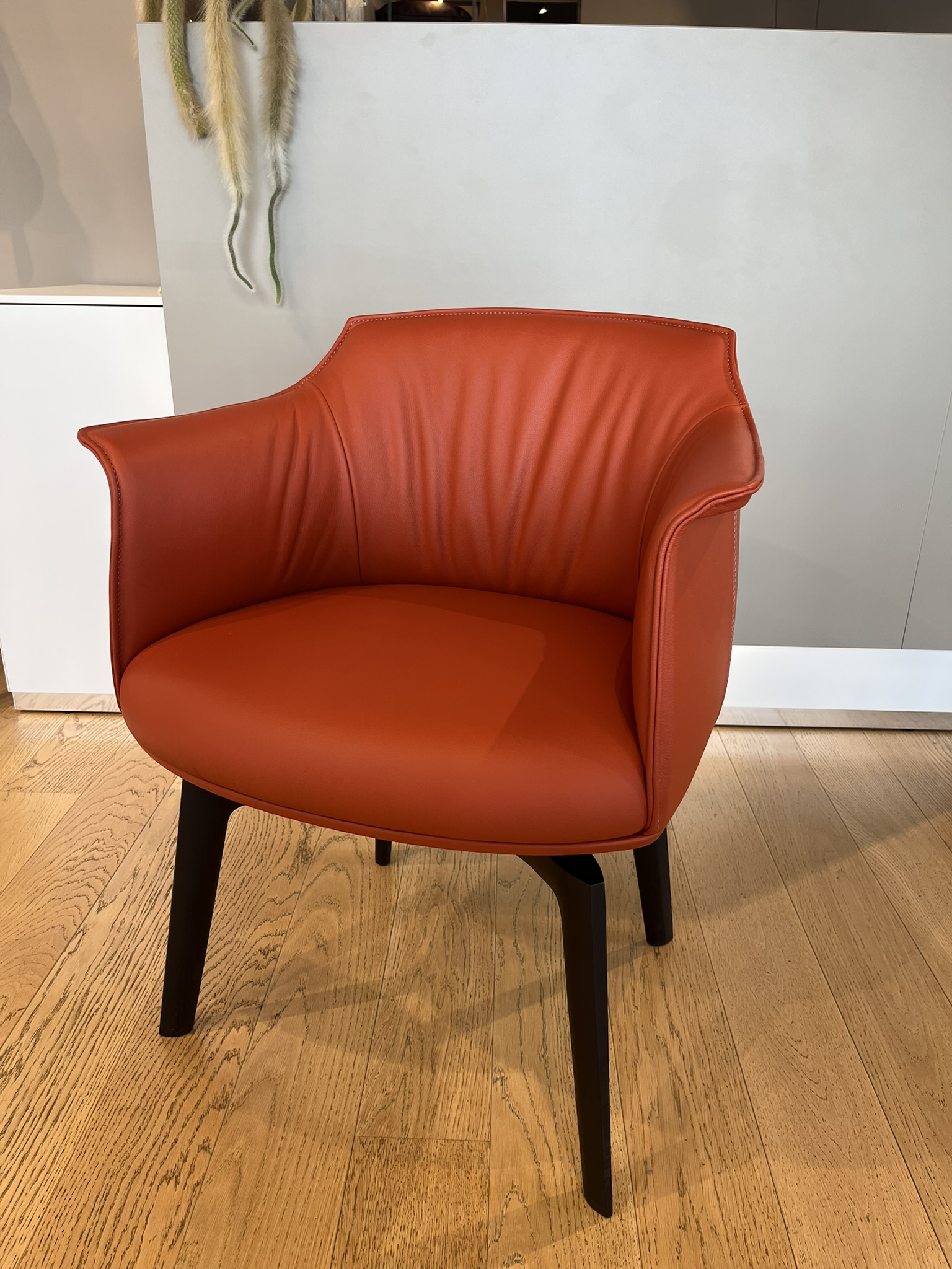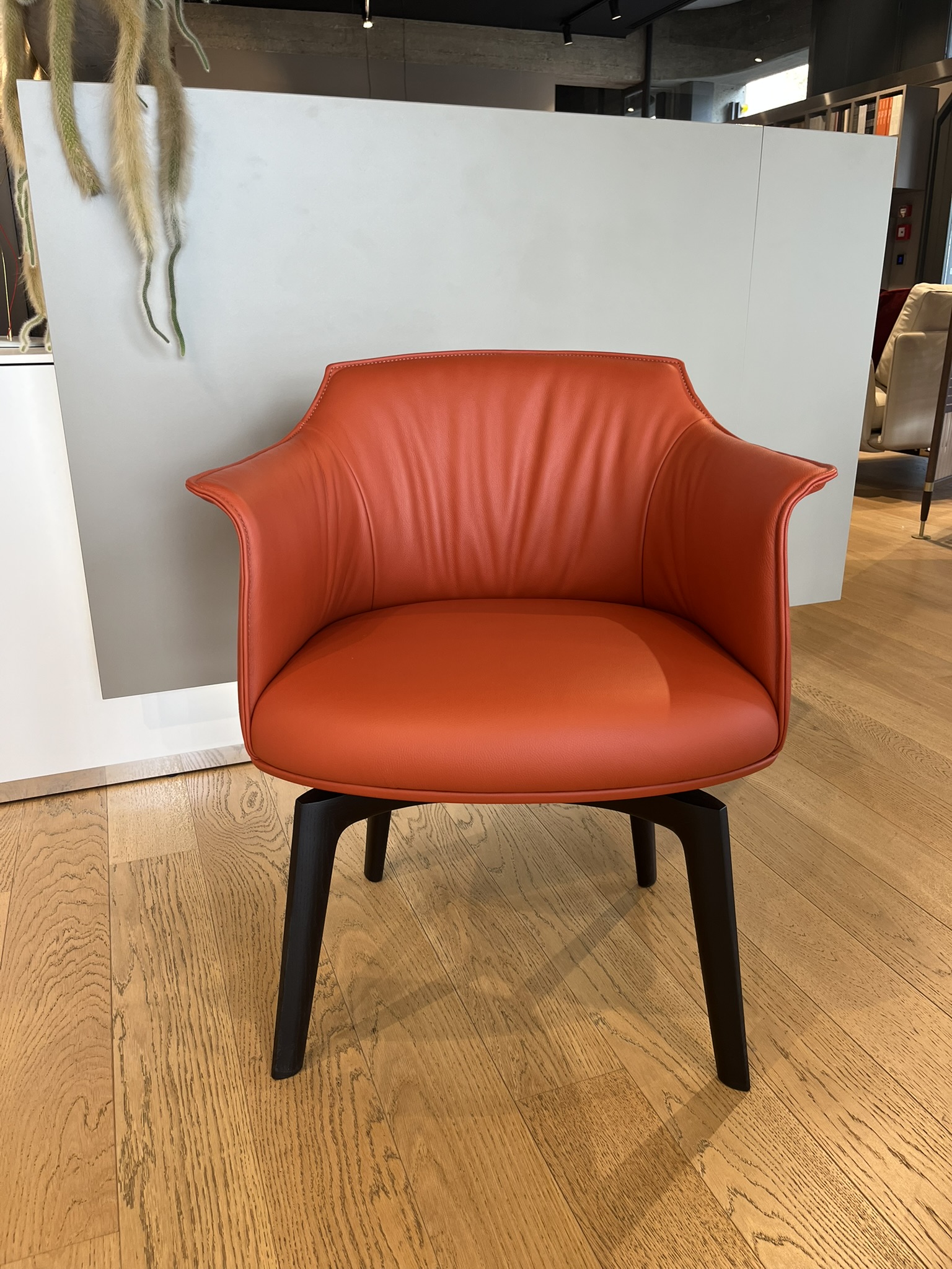 Poltroncina girevole Archibald Dining di Poltrona Frau con rivestimento in pelle SC 146-Coccio Pesto e piedi in frassino tinto wengè. La scocca e i braccioli sono in poliuretano rigido ottenuto da stampo, mentre l’imbottitura interna è in poliuretano morbido stampato e ovatta poliestere. Il telaio della seduta è in multistrato di betulla, sempre con imbottitura in poliuretano espanso e ovatta. La base a quattro gambe girevole in legno è dotata di meccanismo “torna” che permette la rotazione di 360° e ritorno nella posizione di partenza. Le dimensioni sono di cm 62x57xH78.