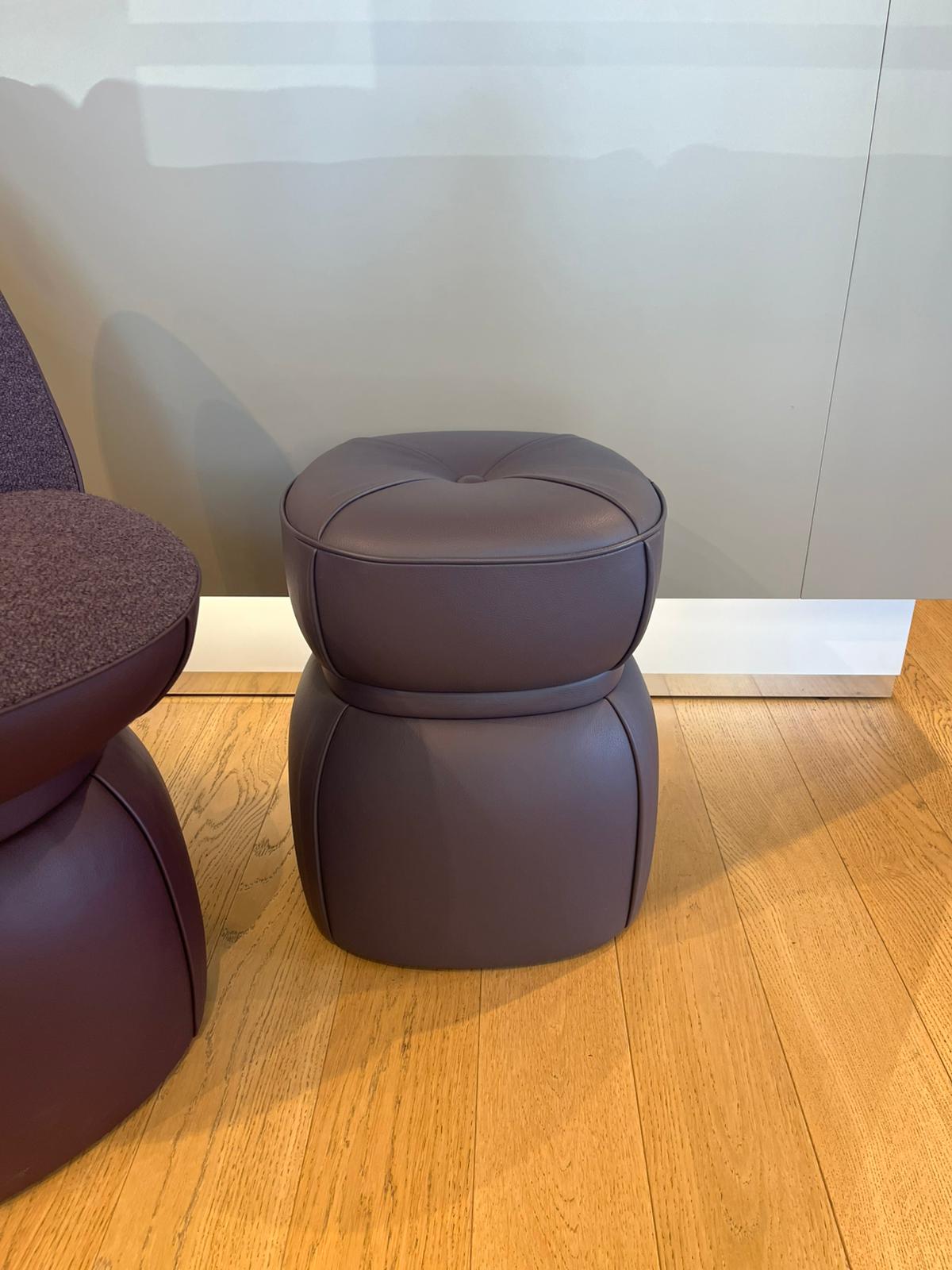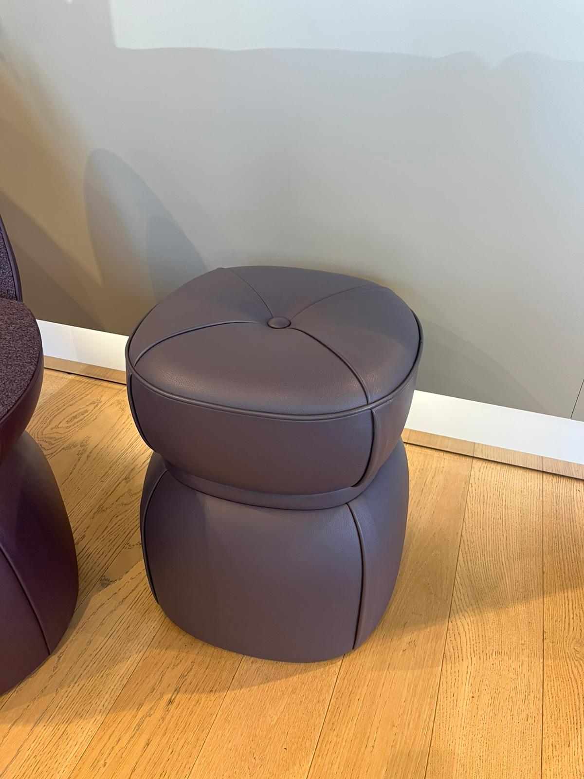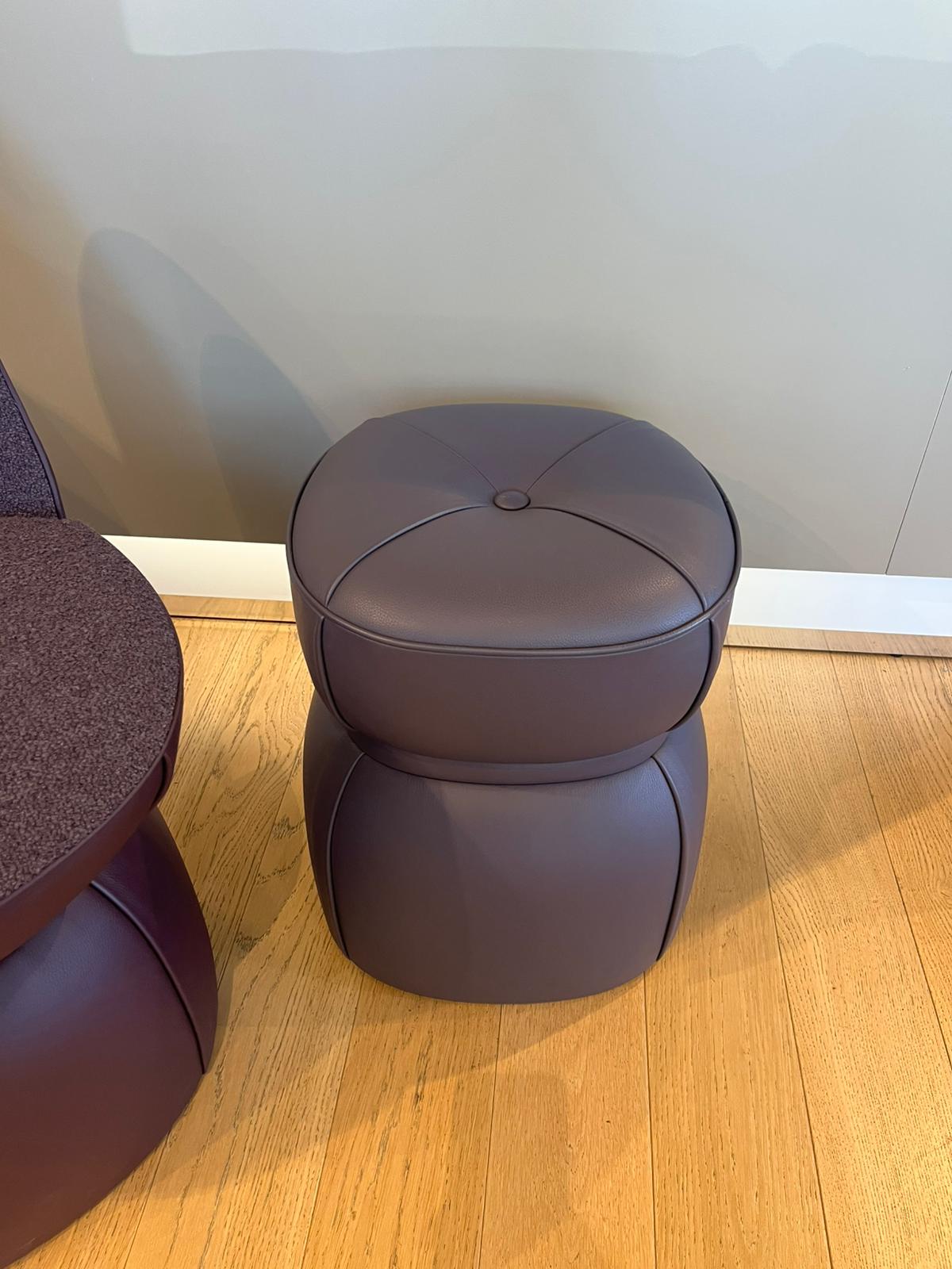 La struttura del pouf Leplì è in multistrato di betulla e pioppo con montanti in massello di faggio e tamponatura in cartone kraft. Il basamento è in multistrato di pioppo con fondo in MDF verniciato nero antigraffio. L’imbottitura della seduta è in poliuretano espanso e ovatta poliestere. Il pouf Leplì disponibile è rivestito in pelle SC 258-Mist con fascia decorativa sempre in pelle nello stesso colore. Quattro pieghe partono dal bottone centrale della seduta e caratterizzano il profilo del pouf.