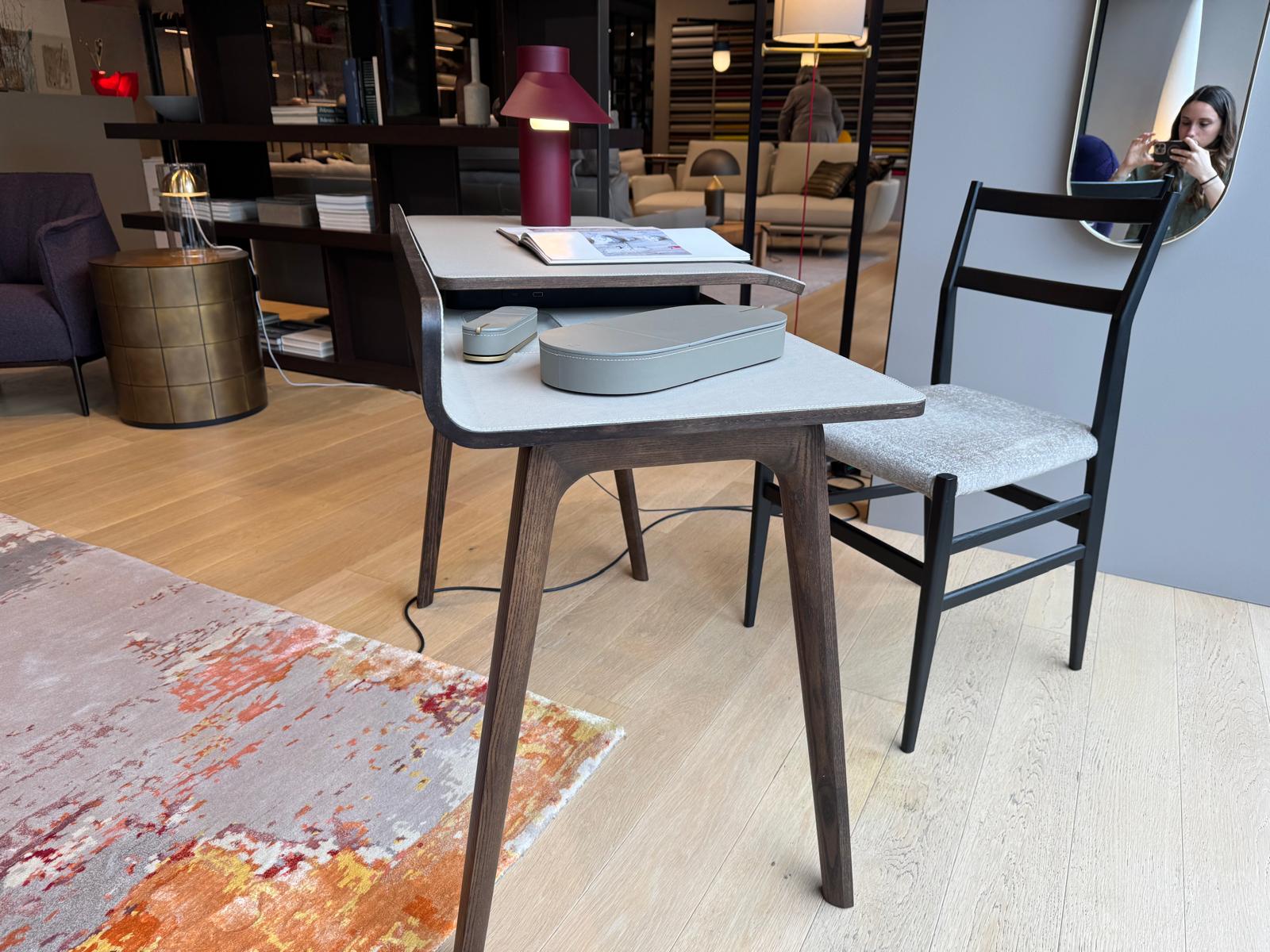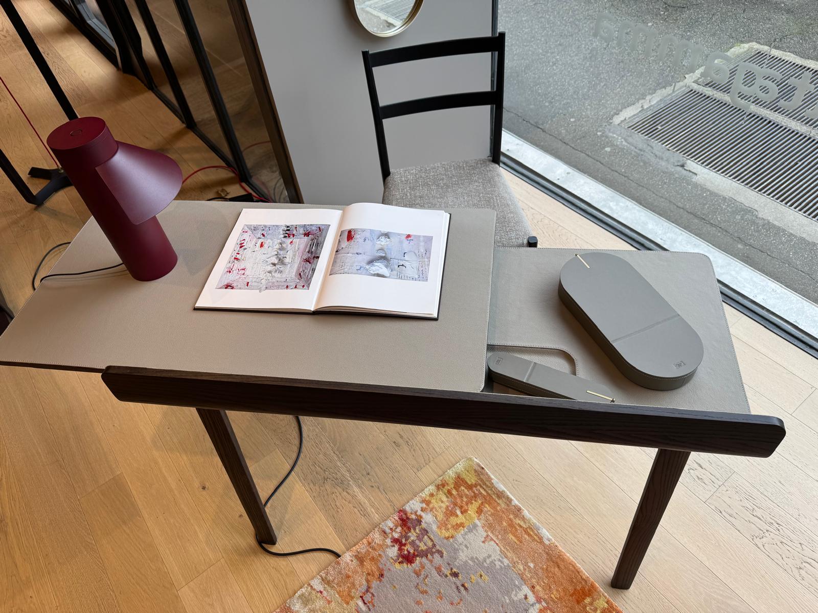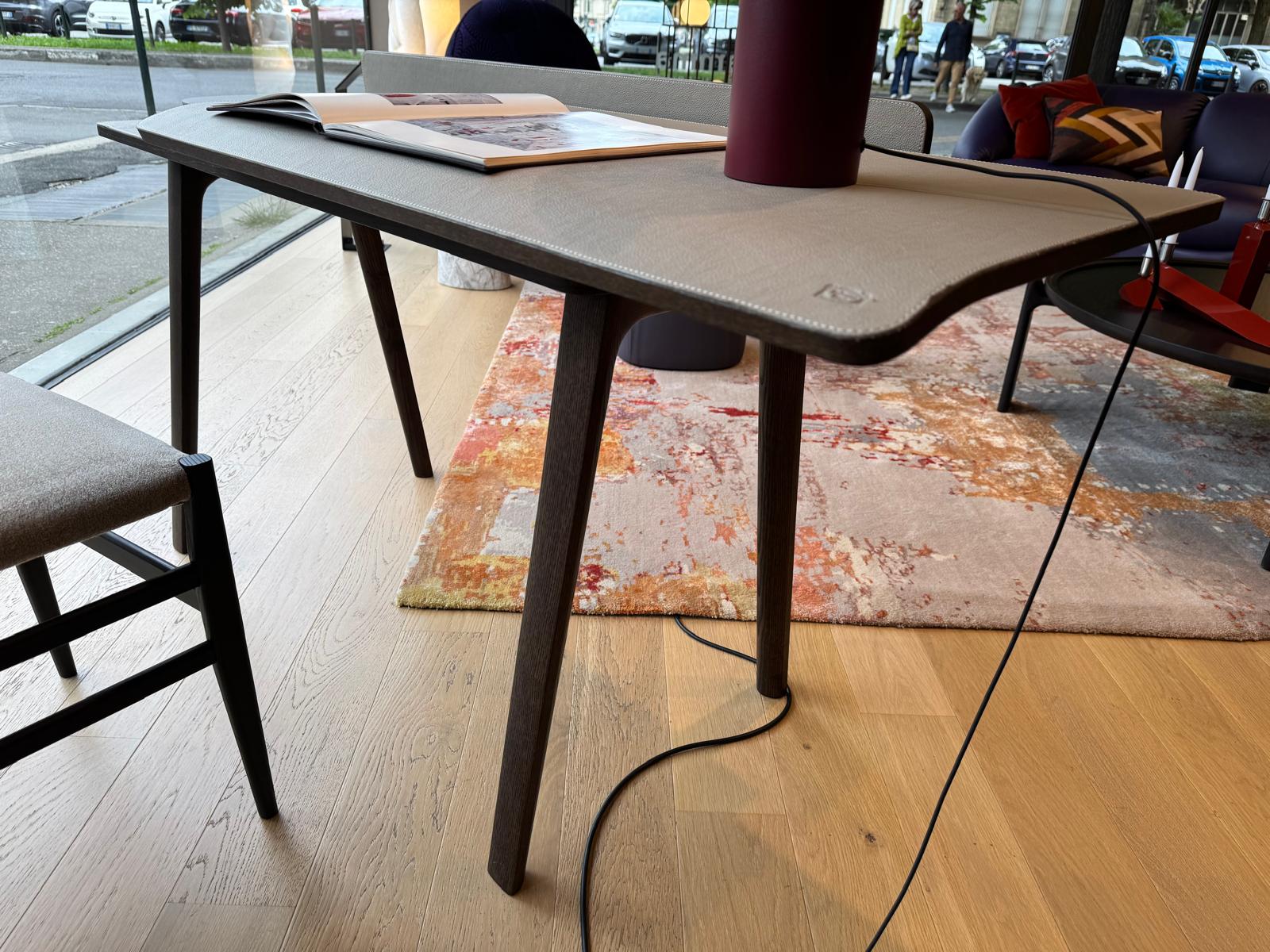 Il scrivania Iren, di Poltrona Frau, con piano scorrevole a destra e prese USB è rivestita in Pelle Frau SC 34 MAGGESE. Il piano appoggia su una base a cavalletto in massello di frassino tinto moka.