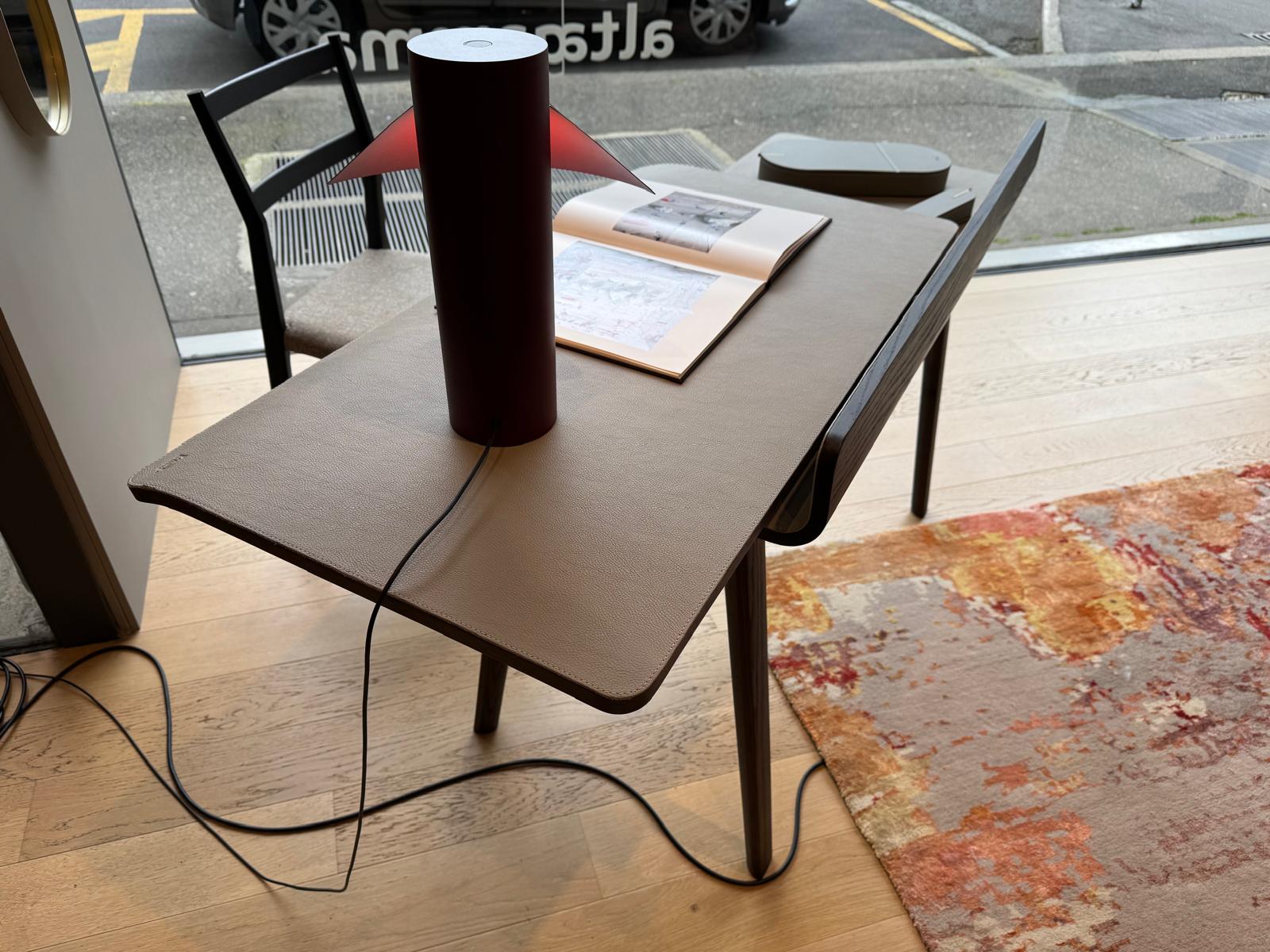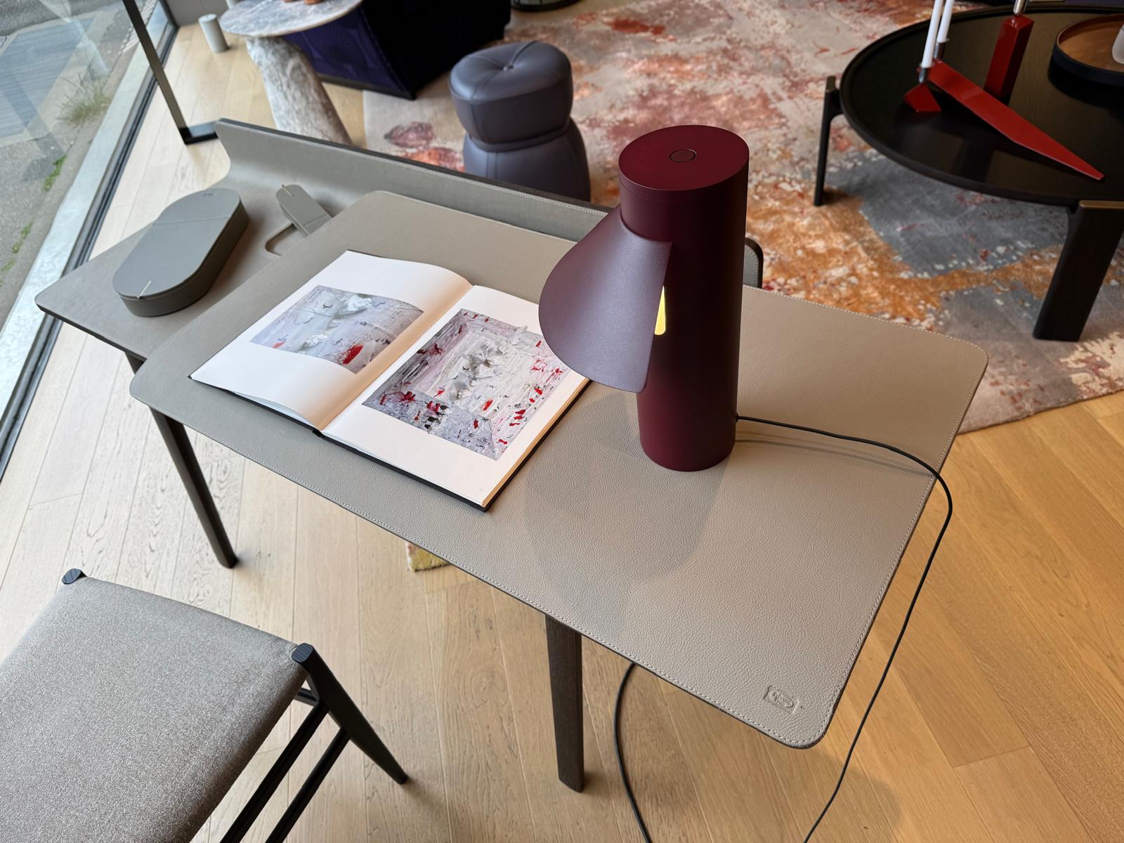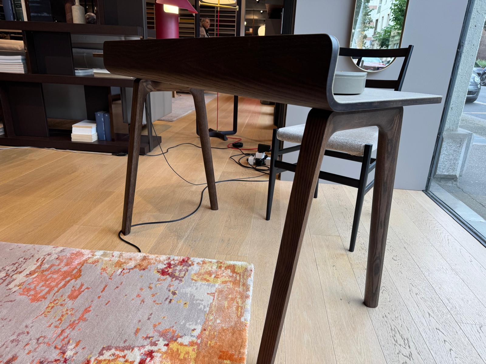 Il scrivania Iren, di Poltrona Frau, con piano scorrevole a destra e prese USB è rivestita in Pelle Frau SC 34 MAGGESE. Il piano appoggia su una base a cavalletto in massello di frassino tinto moka.