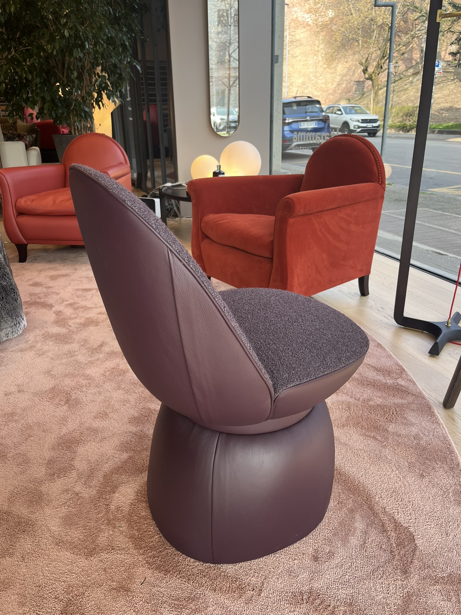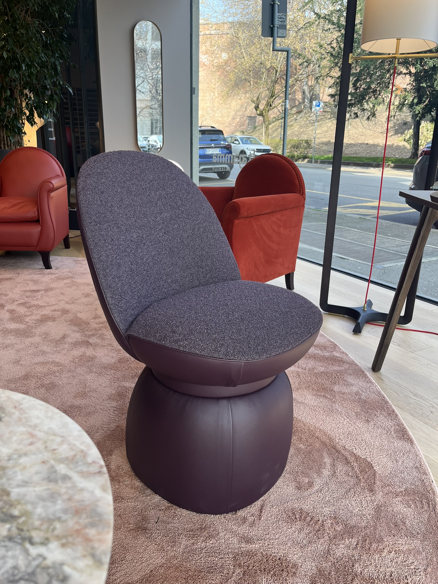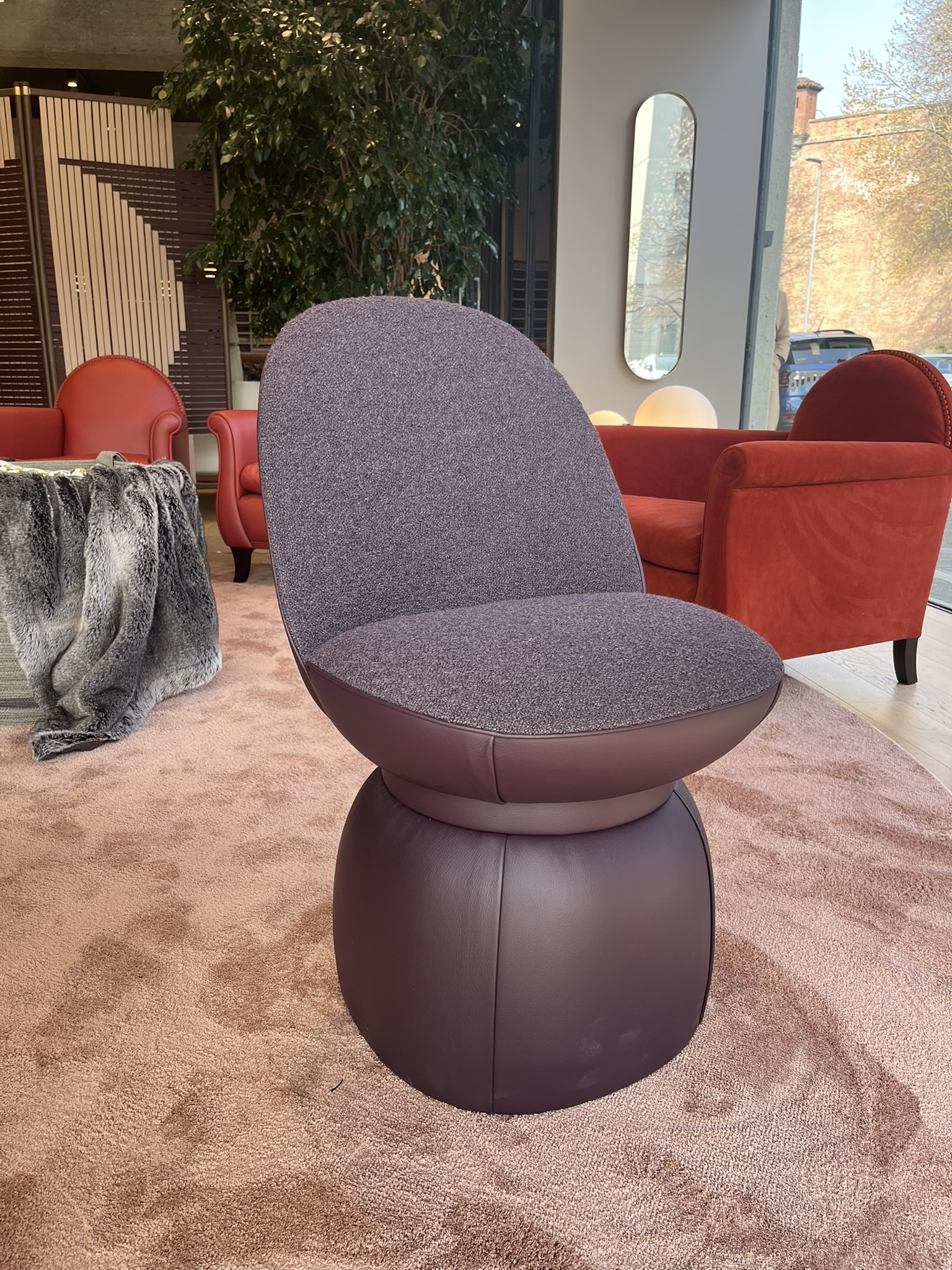 Sedia imbottita Leplì di Poltrona Frau con 5 ruote pivotanti inserite all’interno della base. Il rivestimento esterno è in pelle SC 256-Ume e il rivestimento interno in tessuto Loop col. Prugna. L’imbottitura è realizzata in poliuretano espanso e ovatta poliestere. Le dimensioni sono di cm 48x57xH81.