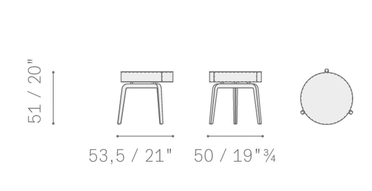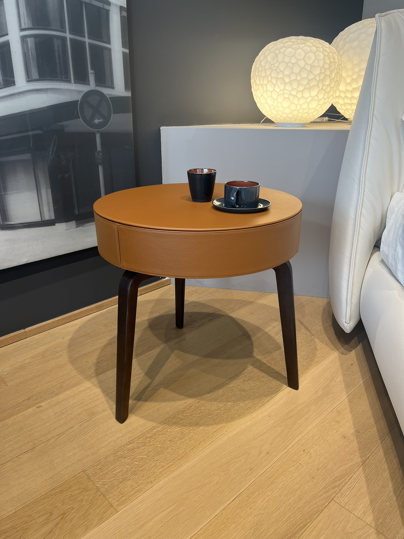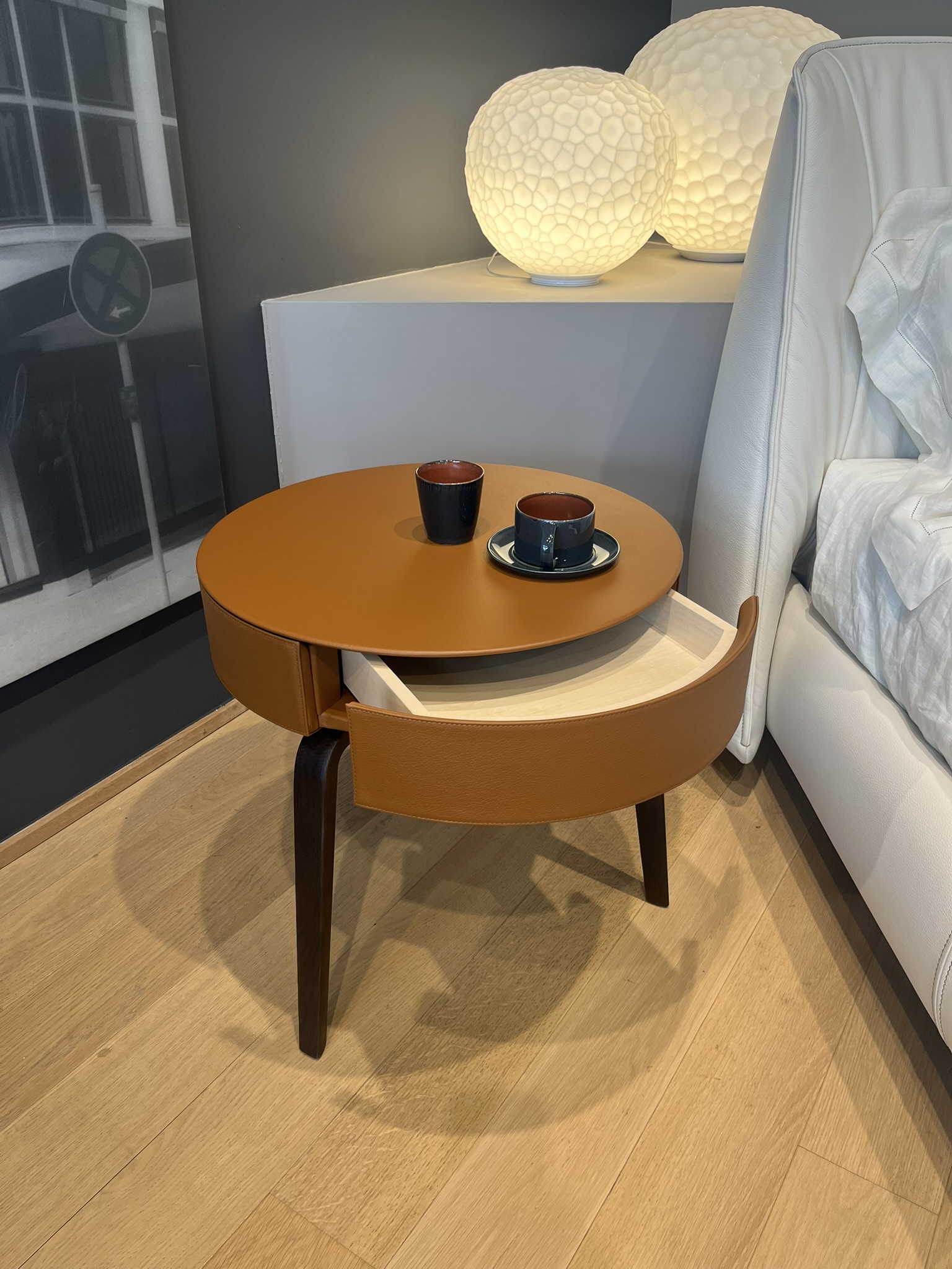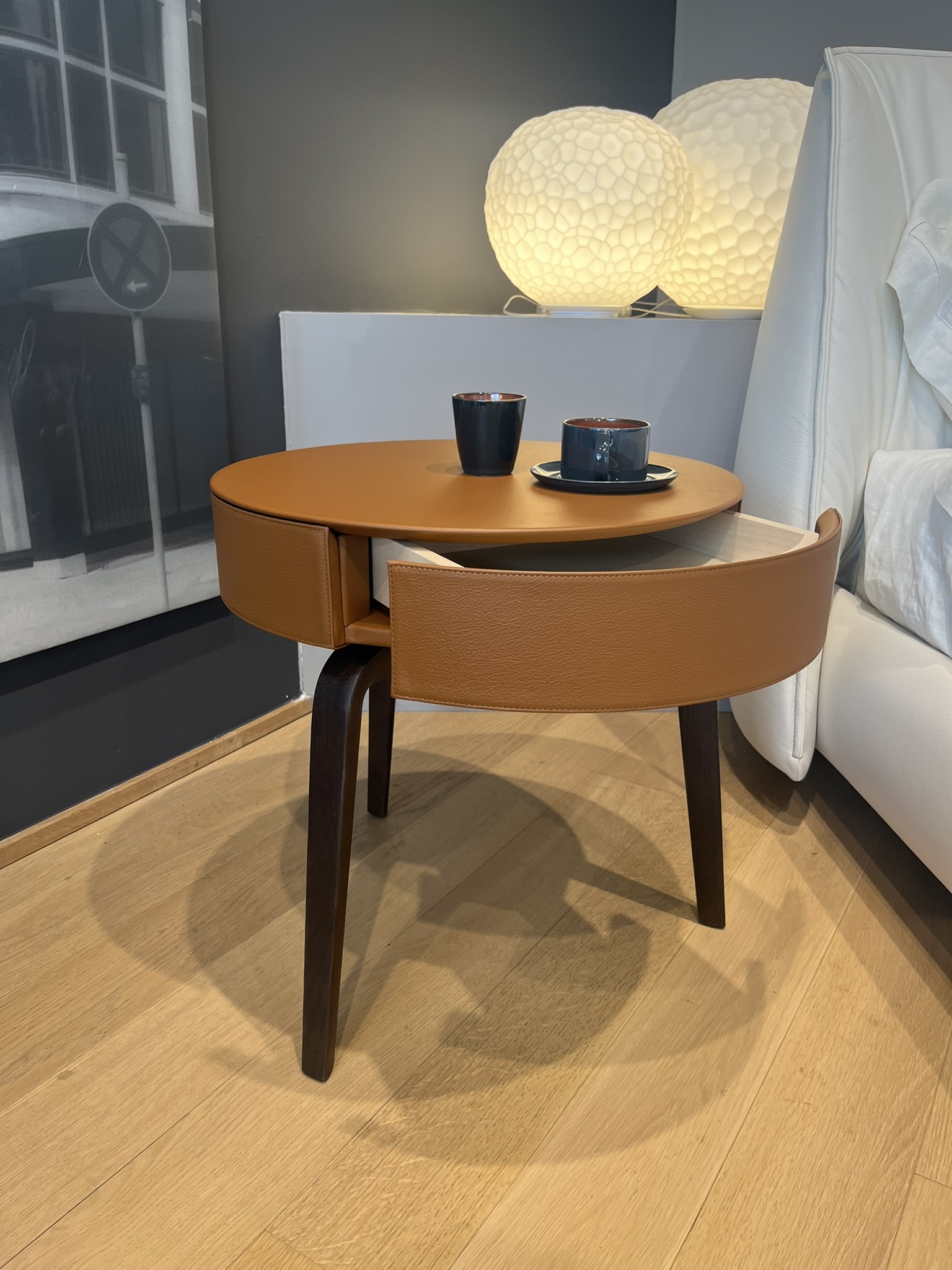 Tavolino con cassetto Fiorile di Poltrona Frau con base in frassino tinto moka e rivestimento in pelle SC 68-Sahara Marrone. Le dimensioni sono di cm Ø50xH51.