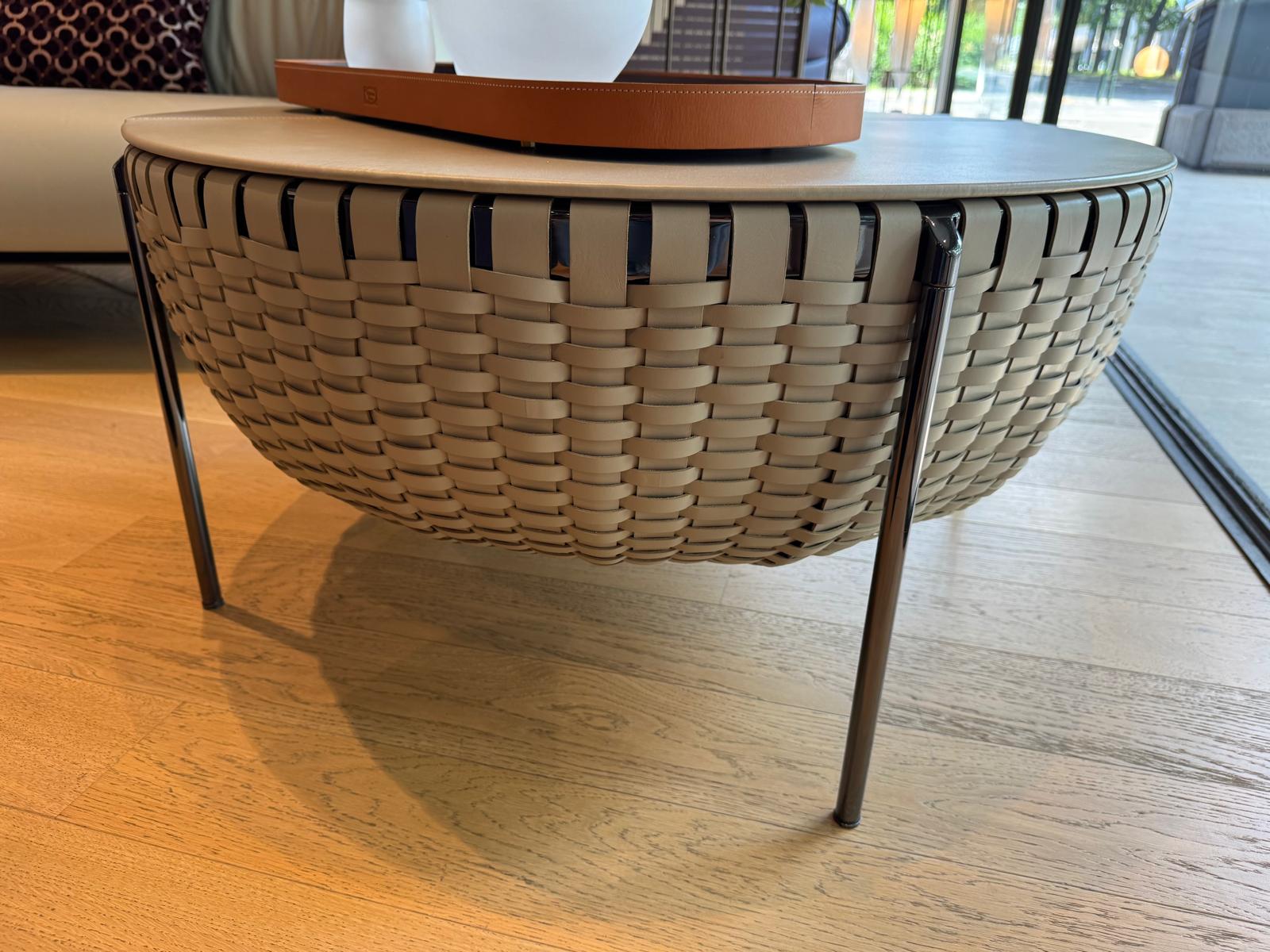 Il tavolino contenitore Cestlavie, di Poltrona Frau, è realizzato in Pelle Frau saddle Extra Corda, dotata di un coperchio ripiegabile a forma di disco che dà accesso all’interno offrendo, allo stesso tempo, un comodo piano d’appoggio. Le fasce intrecciate di cuoio sono tinte anche nei bordi tono su tono, secondo tecniche tipiche della piccola pelletteria più pregiata. Il cuoio è rifinito anche nella superficie interna, con un trattamento protettivo di ceratura trasparente.