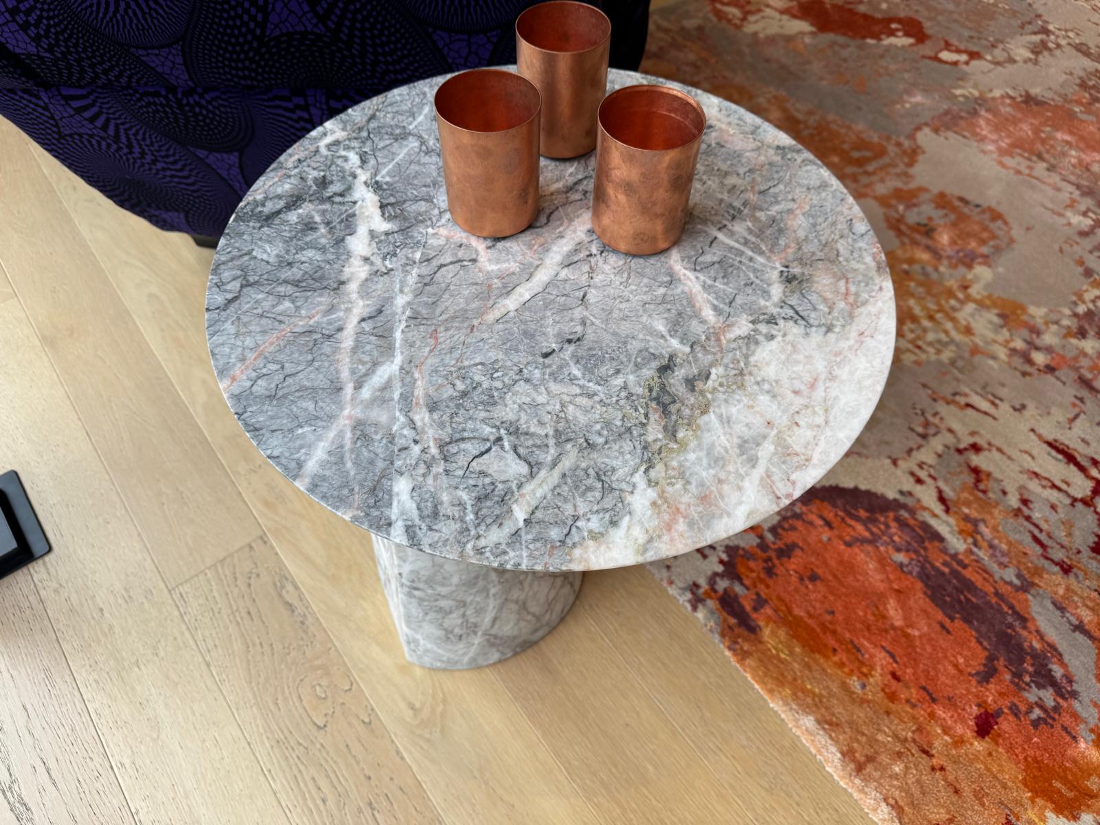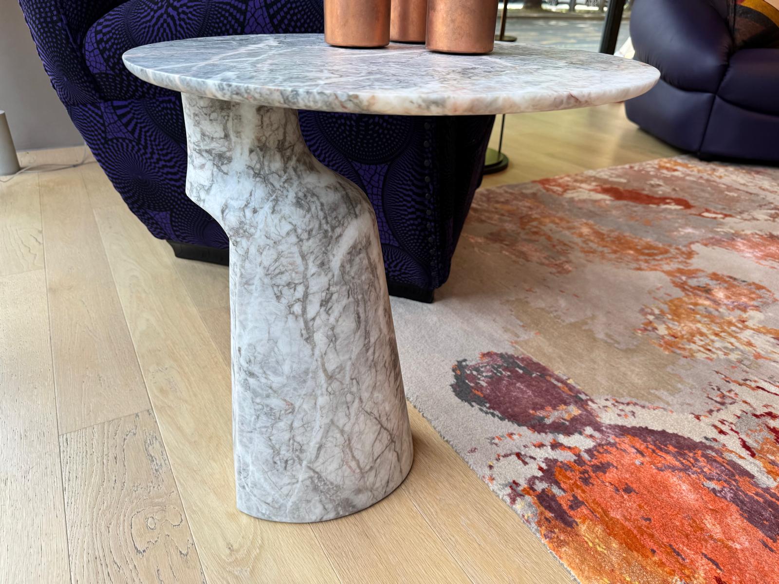 Il tavolino Ilary, di Poltrona Frau, è interamente scolpito in marmo Calacatta Fior di Pesco con finitura semilucida. Il top è circolare e il sostegno è caratterizzato da uno scenografico scavo-impugnatura che rende il tavolino facilmente spostabile. A unire fra loro i due elementi una struttura in acciaio invisibile.