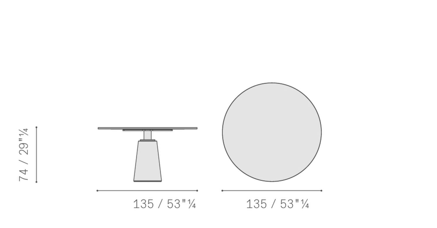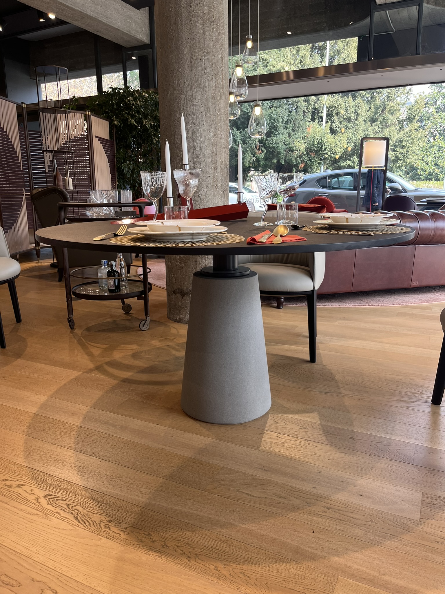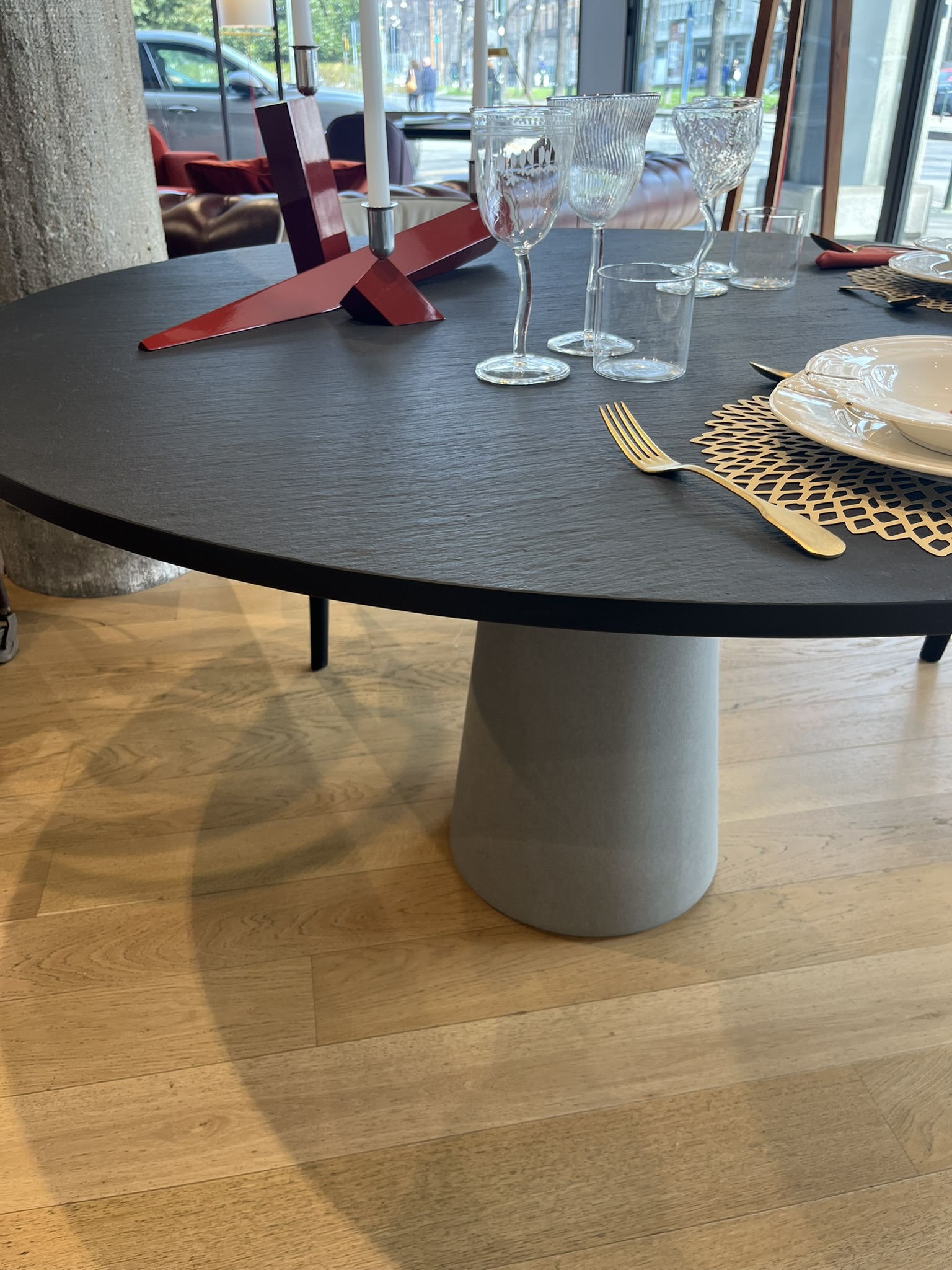 Il tavolo Mesa di Poltrona Frau ha il piano in ardesia ligure che, grazie alla tradizionale lavorazione a spacco, mantiene in superficie rughe e venature naturali. Un sottopiano in lamiera di acciaio brunito dà ulteriore stabilità e resistenza. La colonna portante è in pietra serena di colore grigio, con inserito alla base un puntale sagomato in materiale plastico. Punto di raccordo tra piano e colonna è un tubolare in acciaio brunito su cui poggia una crociera a tre braccia che permette di calibrare la posizione del top. Il tavolo ha le dimensioni di cm Ø135xH74.