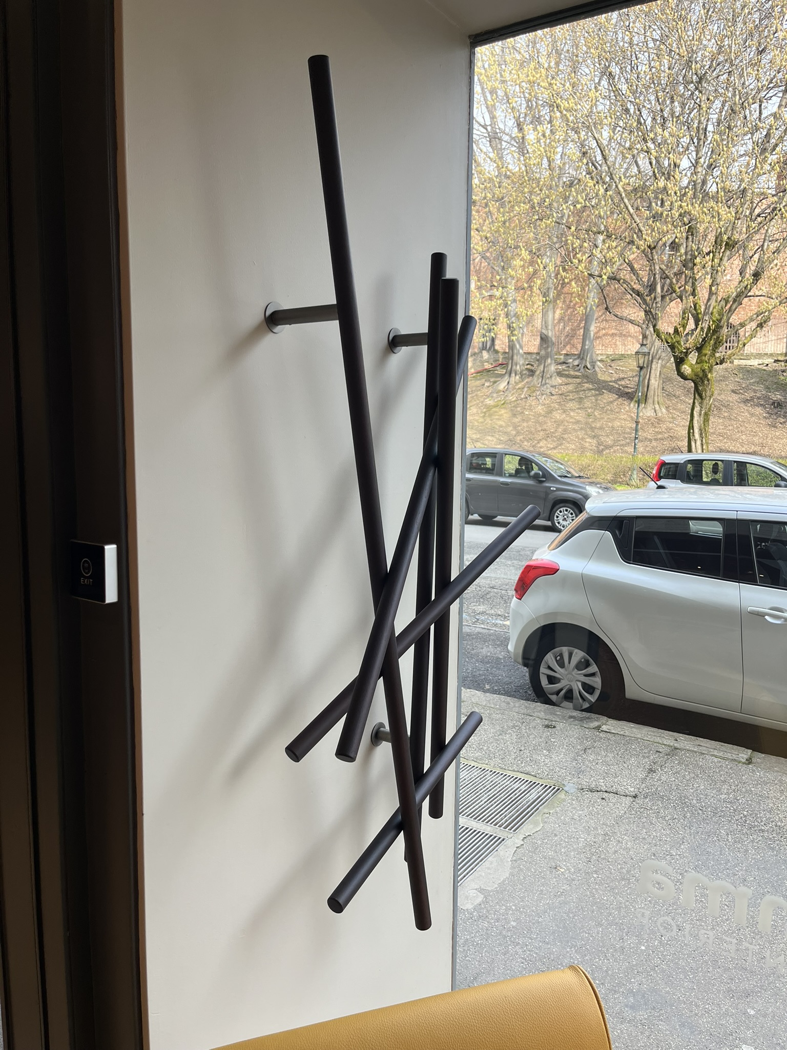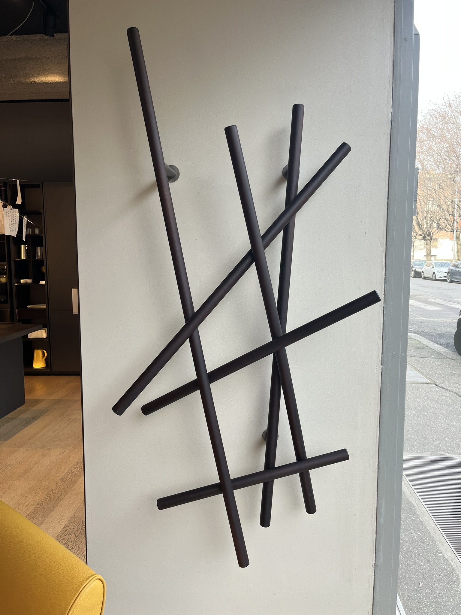 Portabiti da parete Sketch di Porada, con parti in metallo in finirua antracite spazzolato e finitura della struttura in noce canaletto tinto wengè. Le dimensioni sono di cm 72×146.