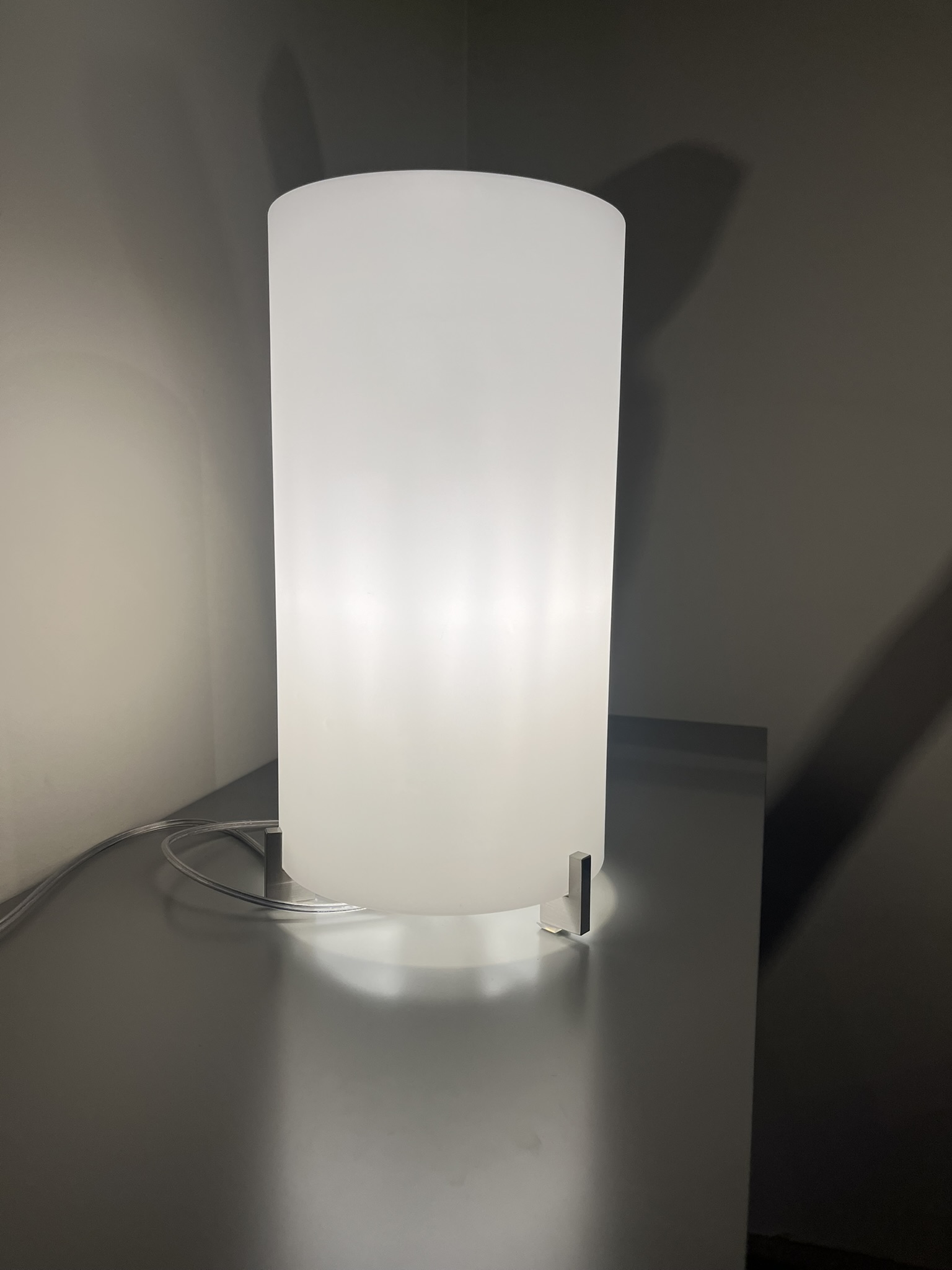 Lampada da tavolo di Prandina in nichel spazzolato, color bianco. Le dimensioni della lampada sono di cm D.18xH.33.