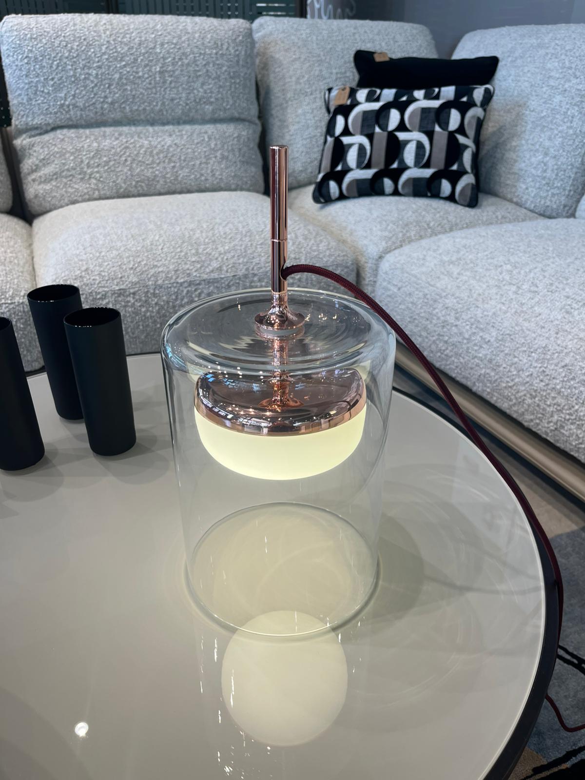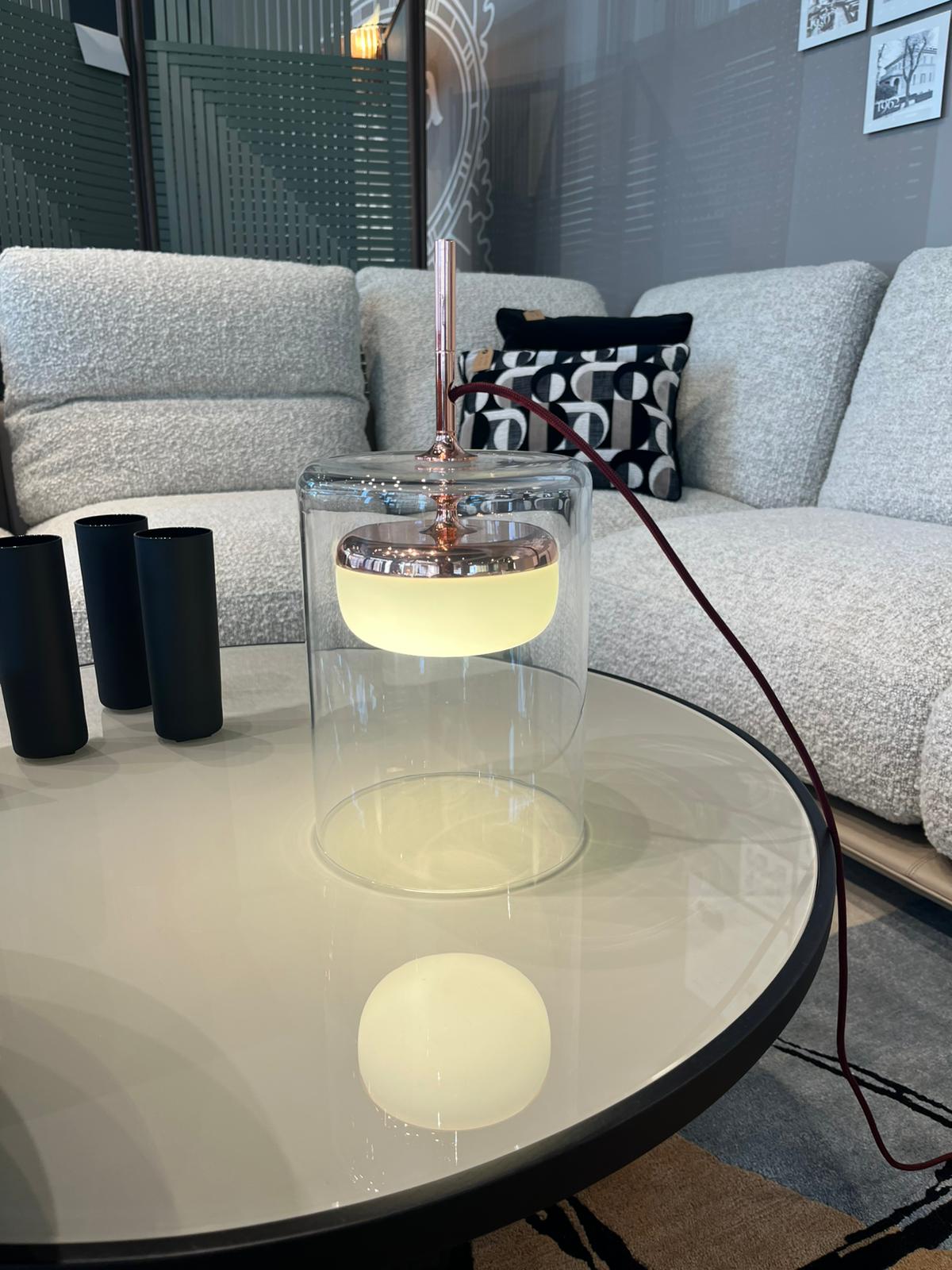 Lampada da tavolo di Prandina in vetro trasparente, rame lucido e diffusore bianco, con cavo color borgogna. Le dimensioni della lampada sono di cm D.18xH.36.