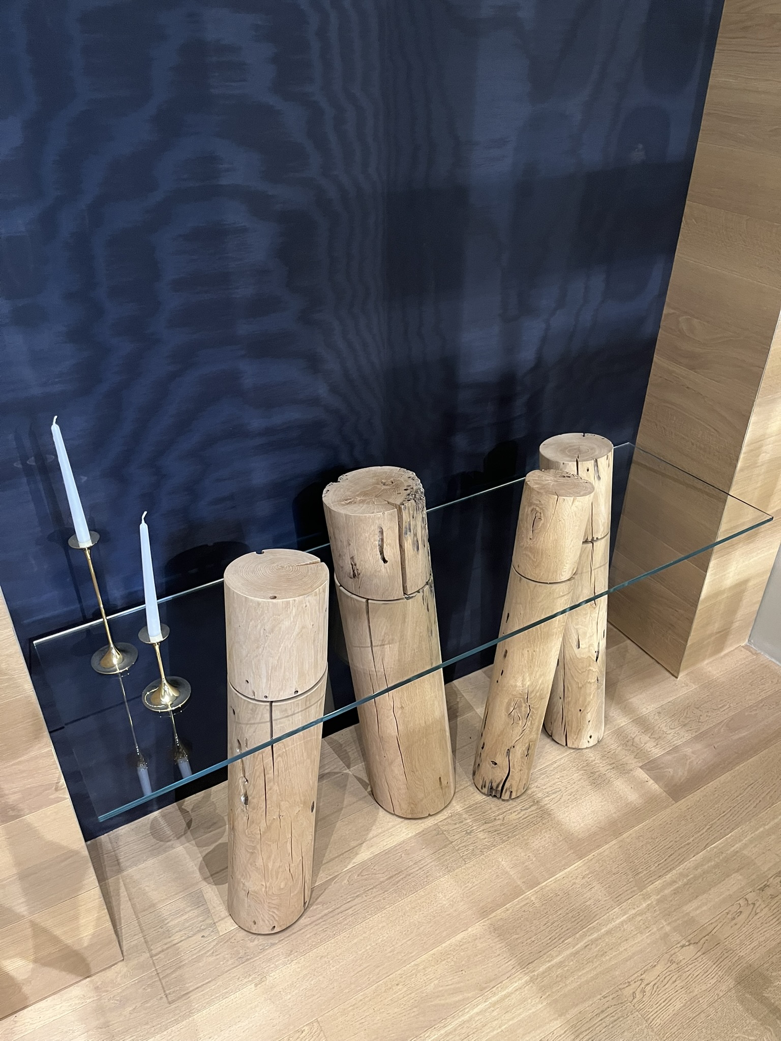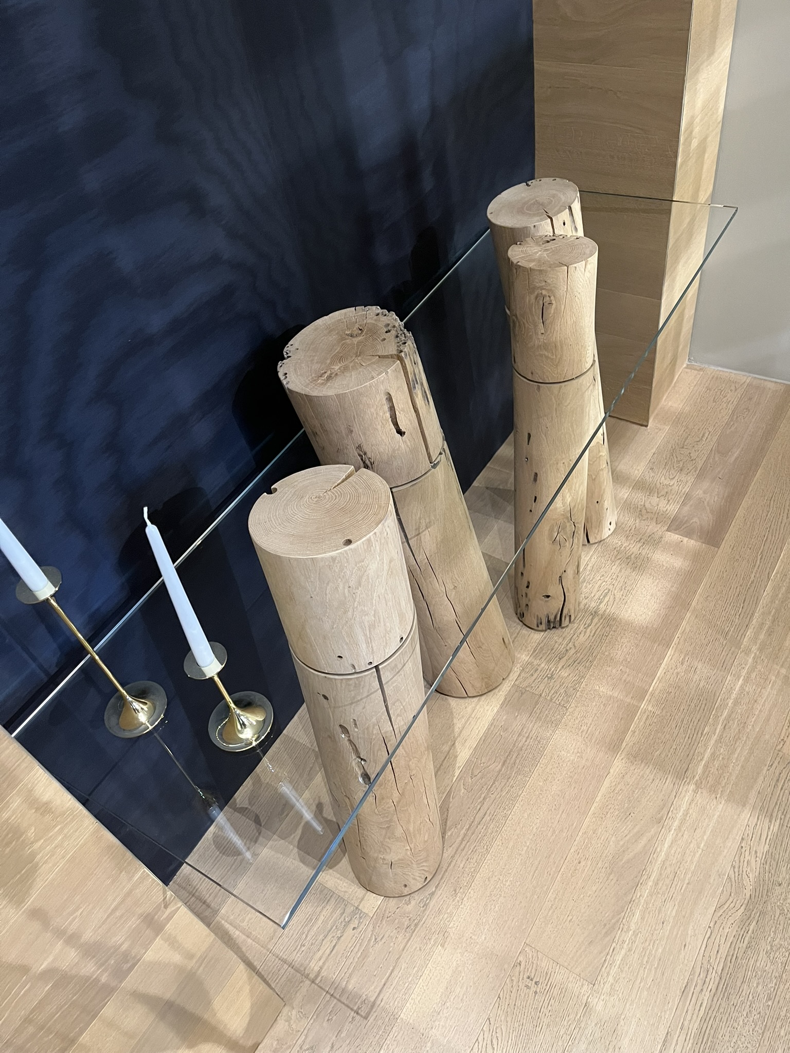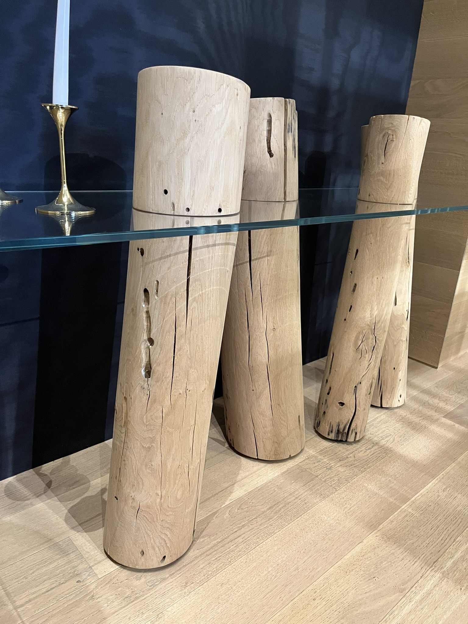 Consolle caratterizzata da top in vetro abbinato ad una serie di pali realizzati in legno massello di Briccola, pali dismessi provenienti dalla Laguna di Venezia. Le dimensioni della consolle sono di cm 170x50xH69/91.